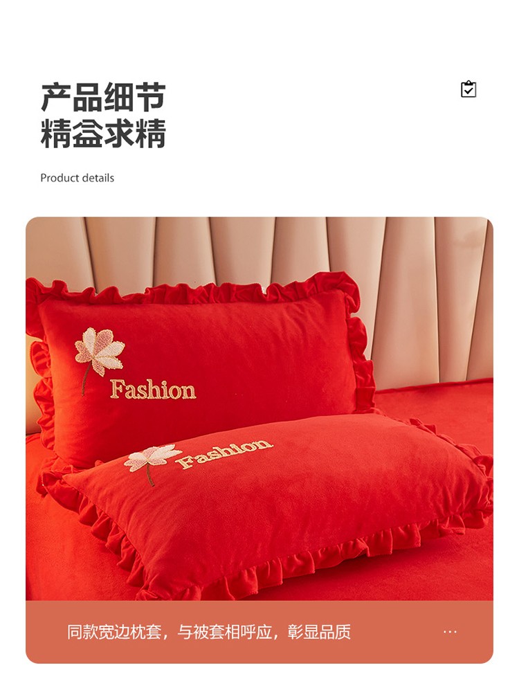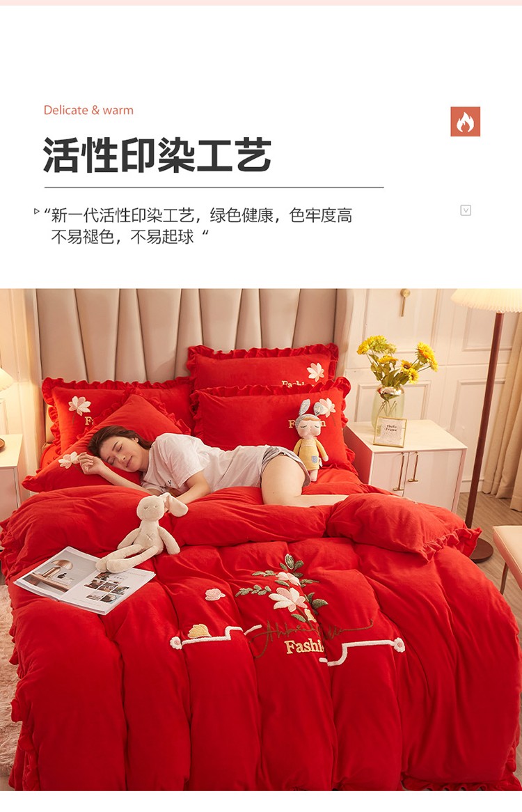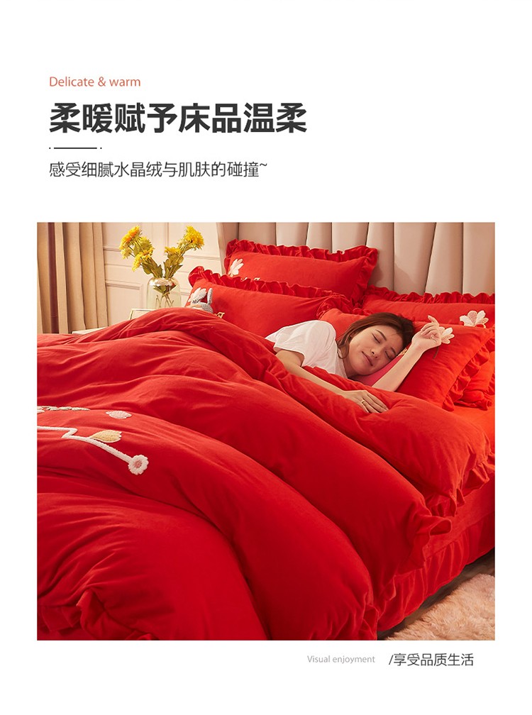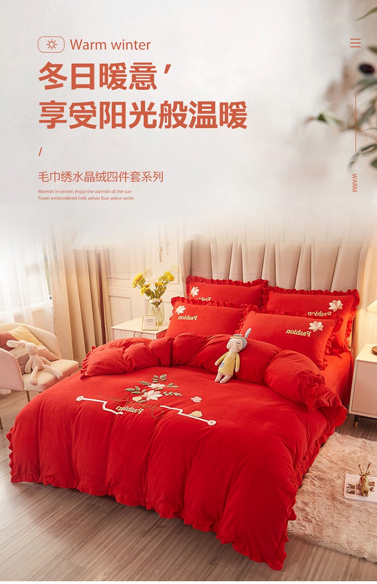 商品名称:恋佳 2023新款水晶绒荷叶边毛巾绣四件套 怦然心动大红