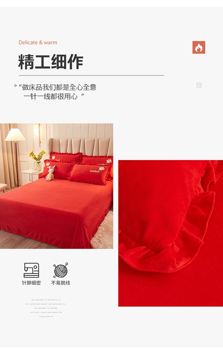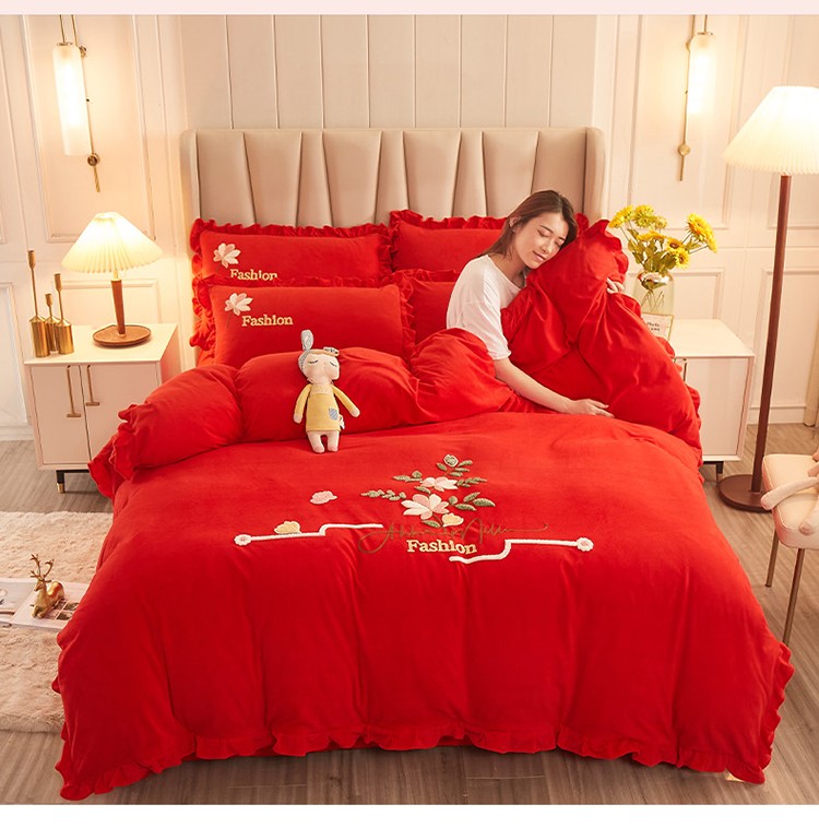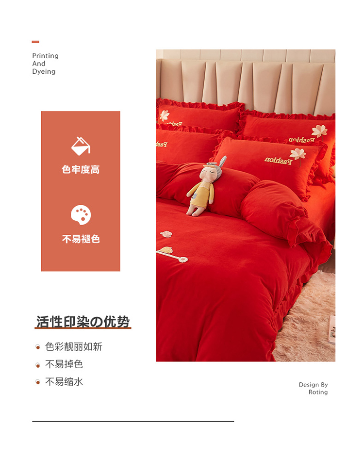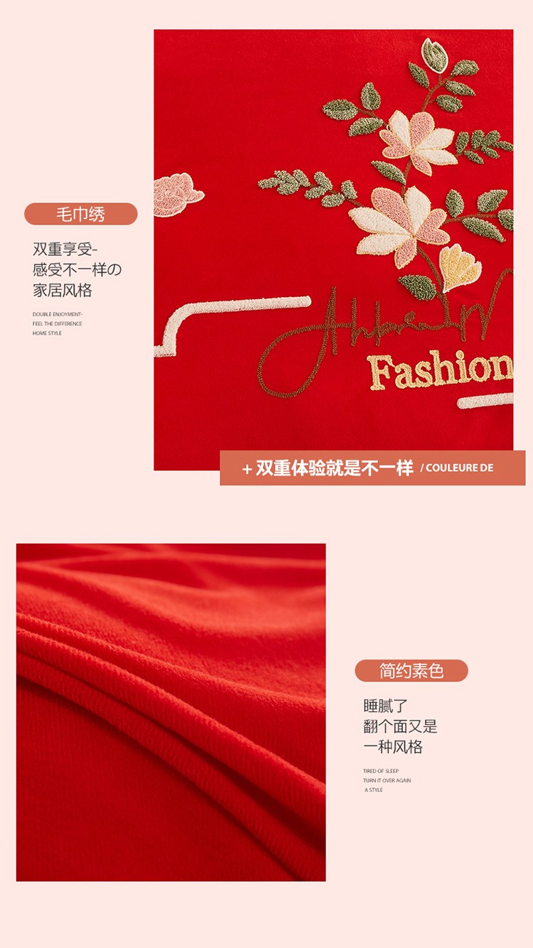 商品名称:恋佳 2023新款水晶绒荷叶边毛巾绣四件套 怦然心动大红