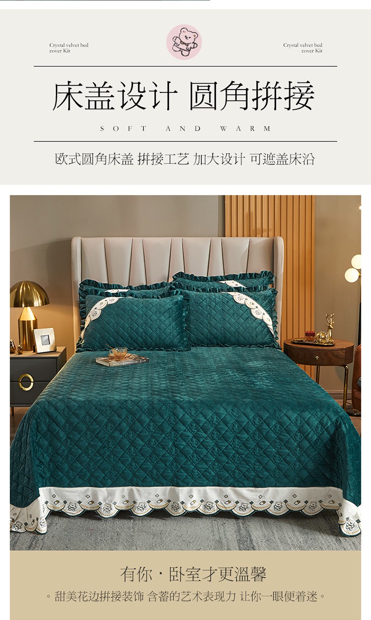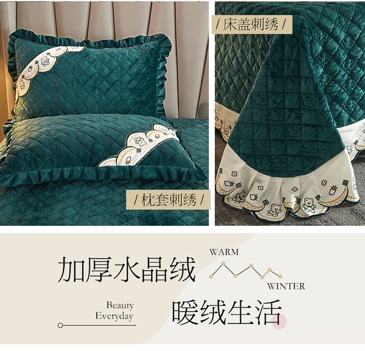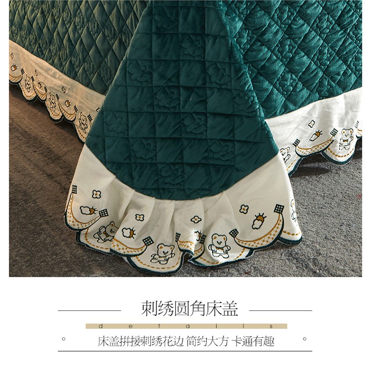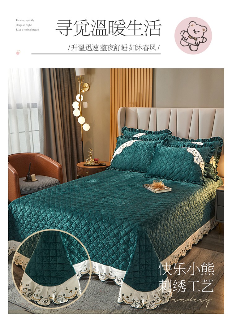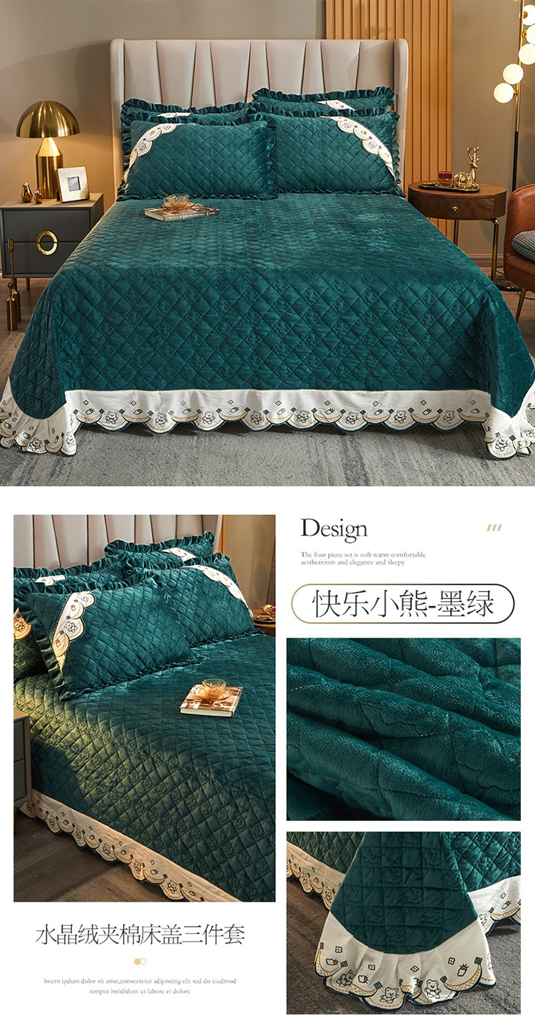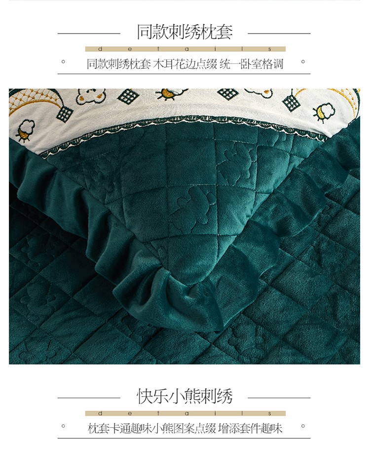 商品名称:宜凡家纺 2021新款水晶绒夹棉绗缝床盖三件套快乐小熊-墨绿