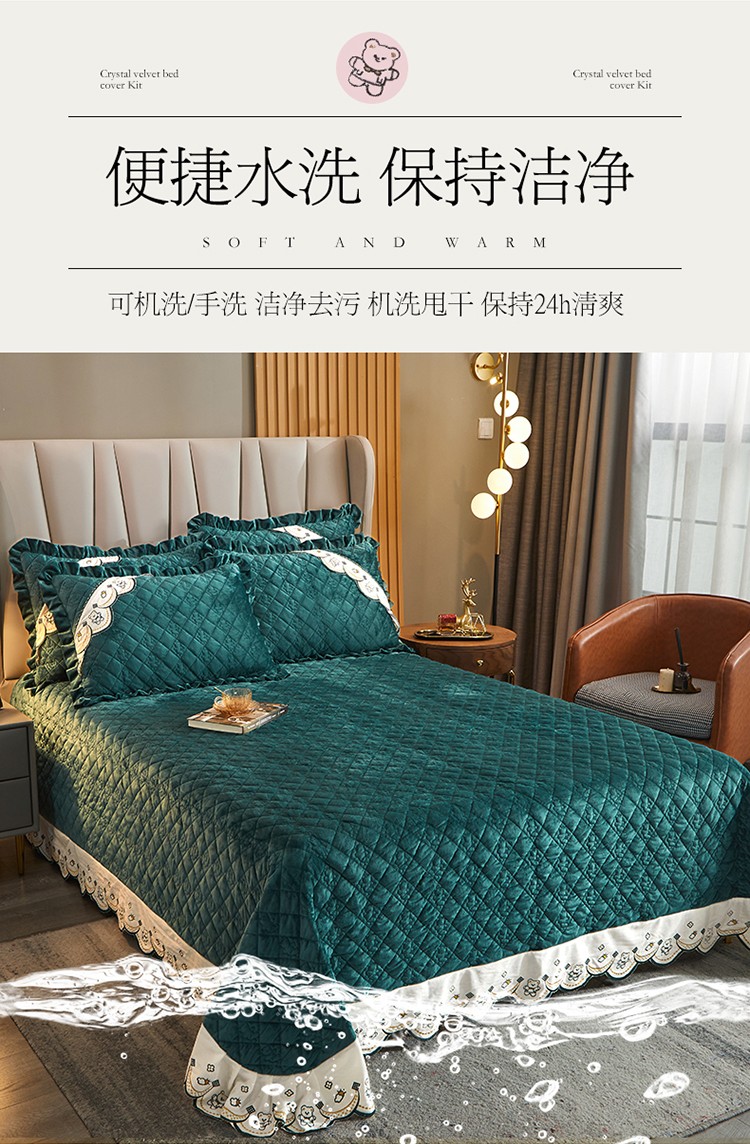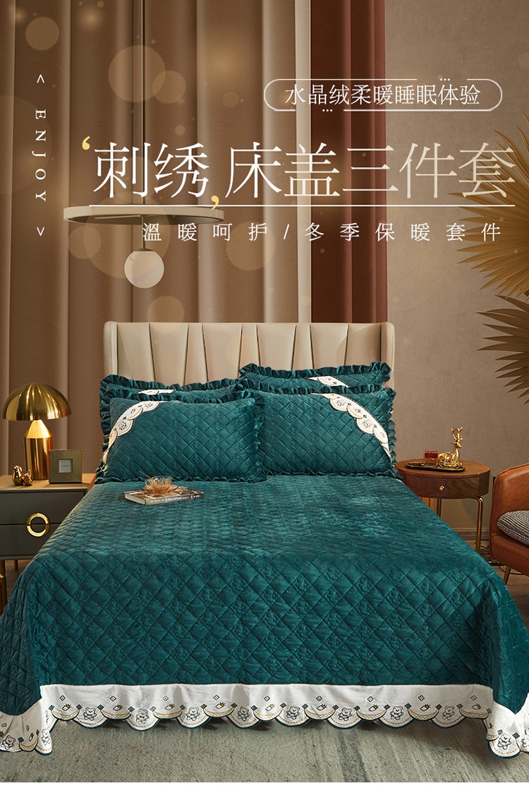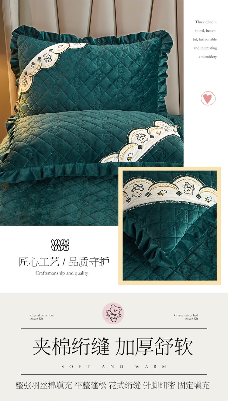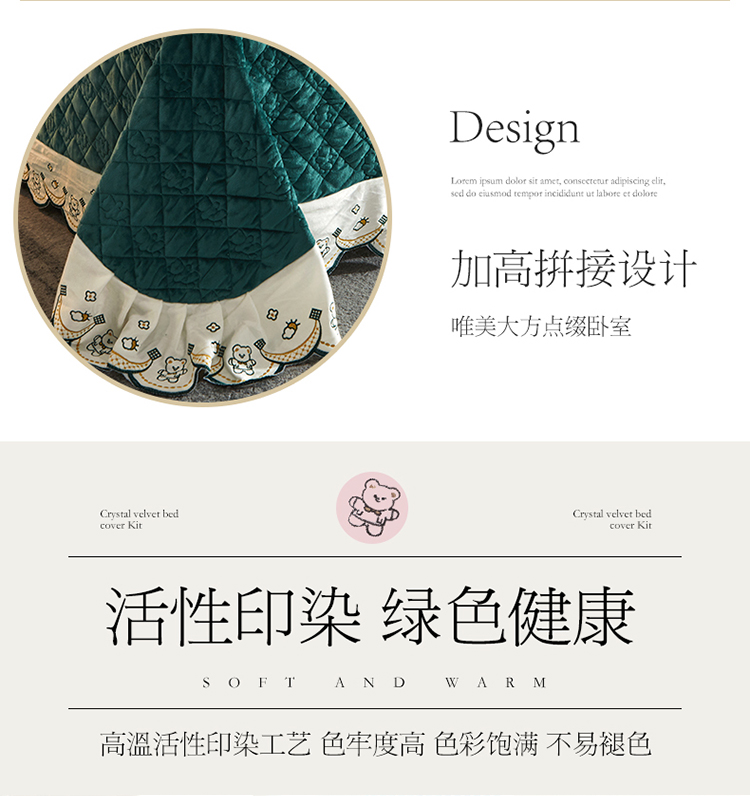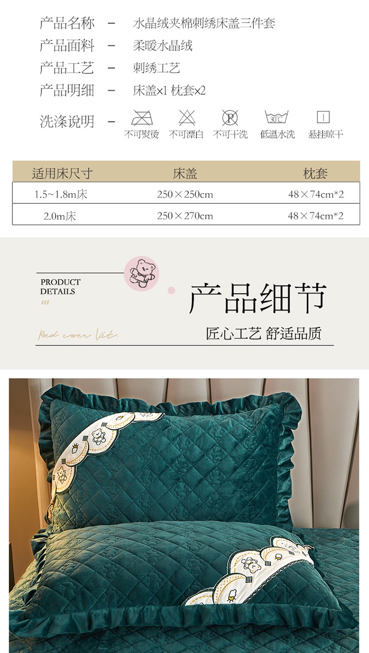 商品名称:宜凡家纺 2021新款水晶绒夹棉绗缝床盖三件套快乐小熊-墨绿
