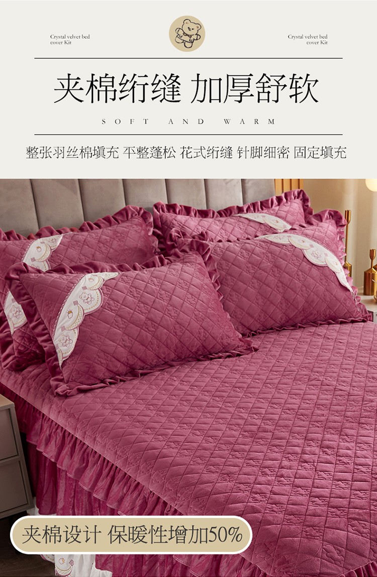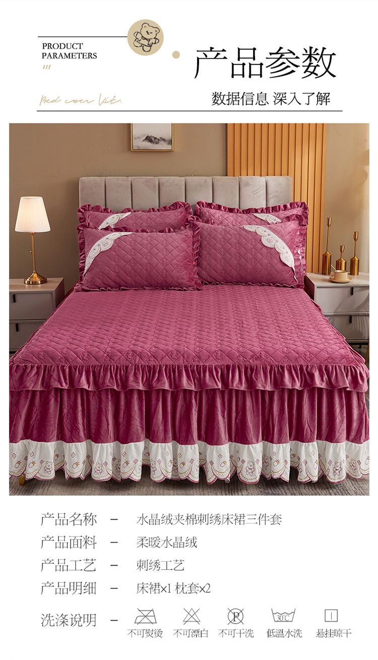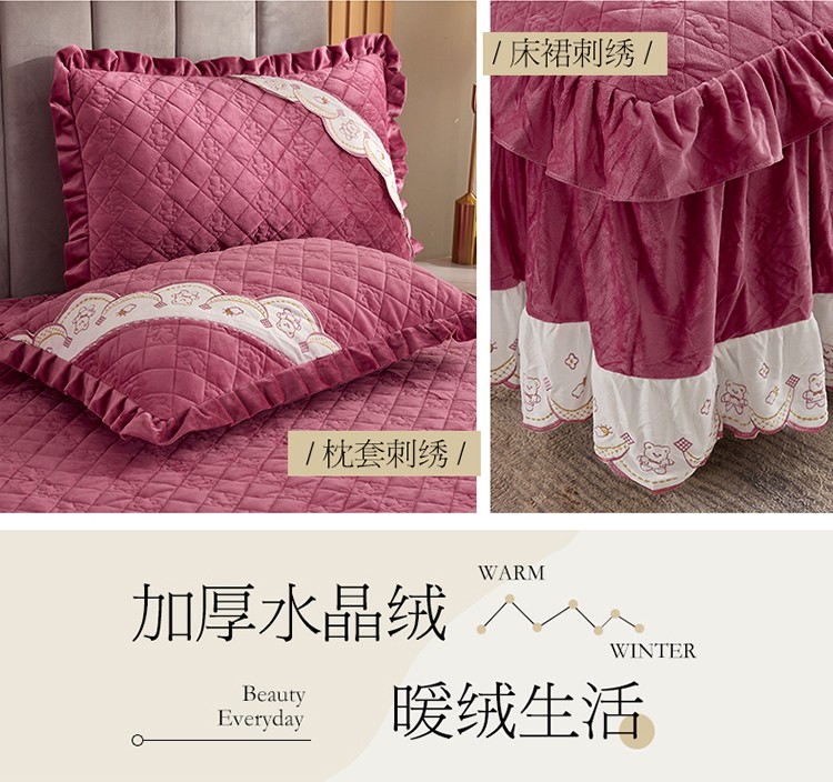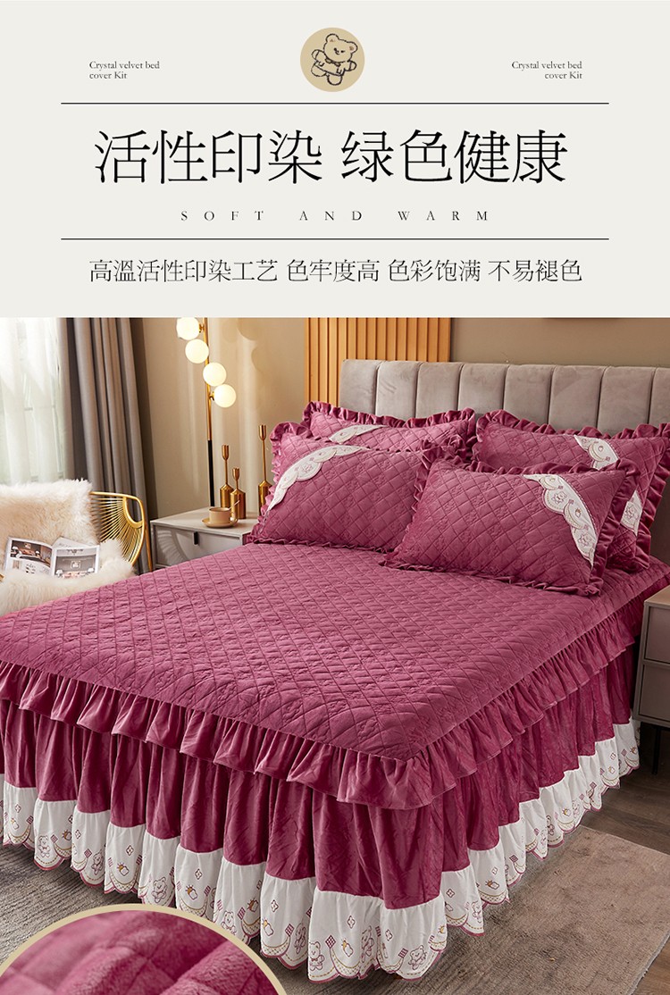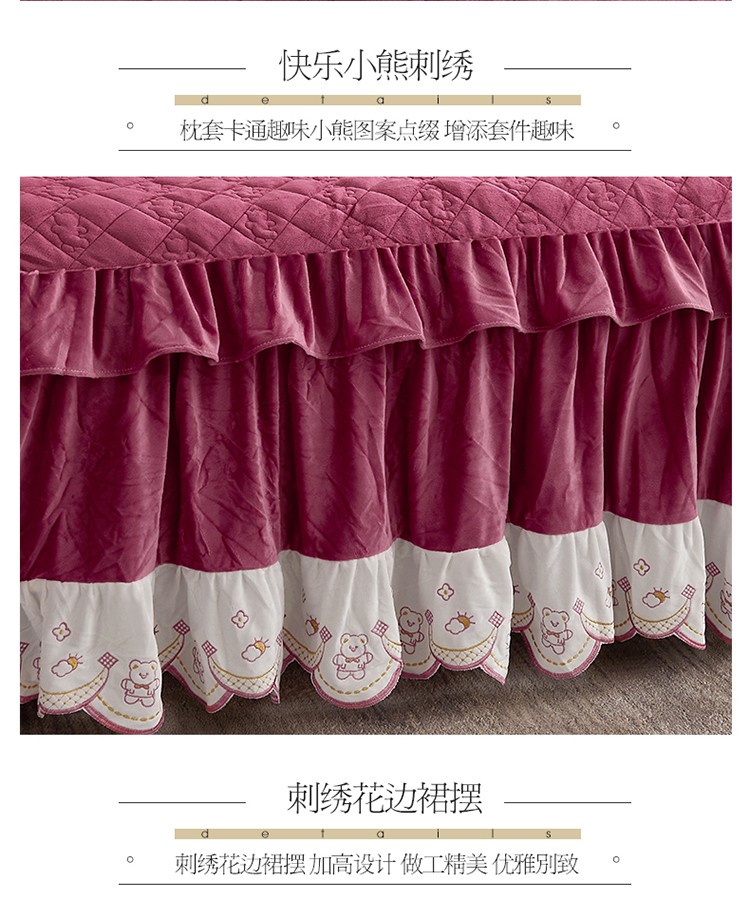 商品名称:宜凡家纺 2021新款水晶绒夹棉绗缝床裙三件套快乐小熊深豆沙