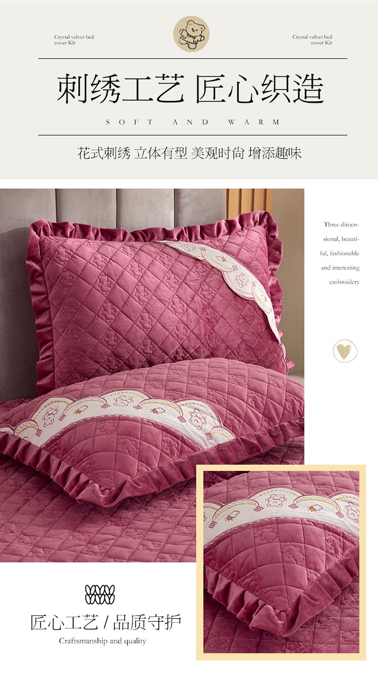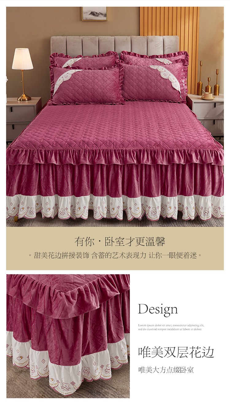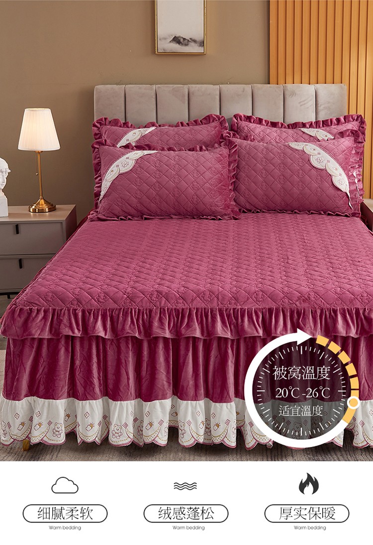 宜凡家纺 2021新款水晶绒夹棉绗缝床裙三件套快乐小熊深豆沙