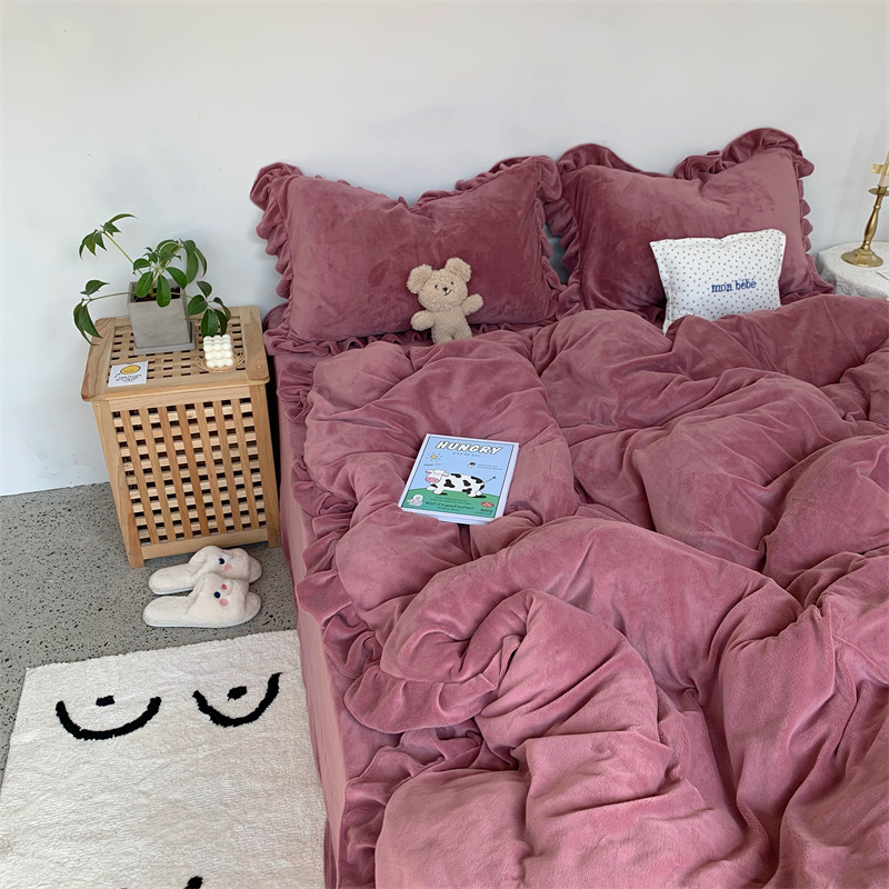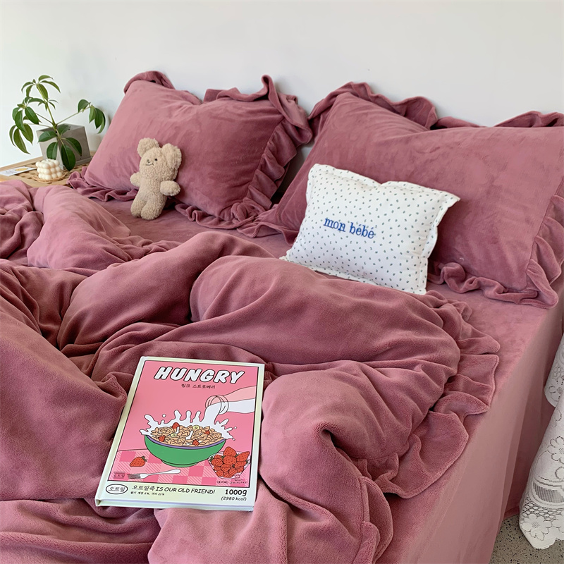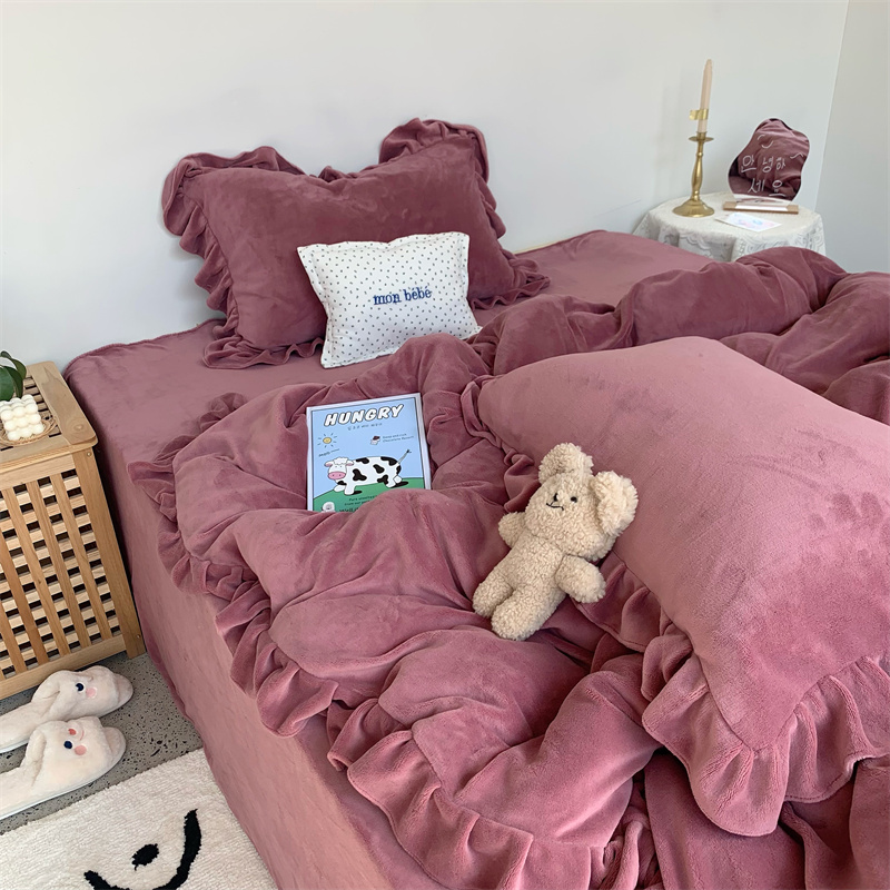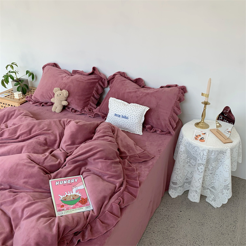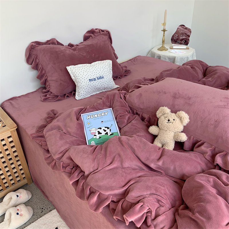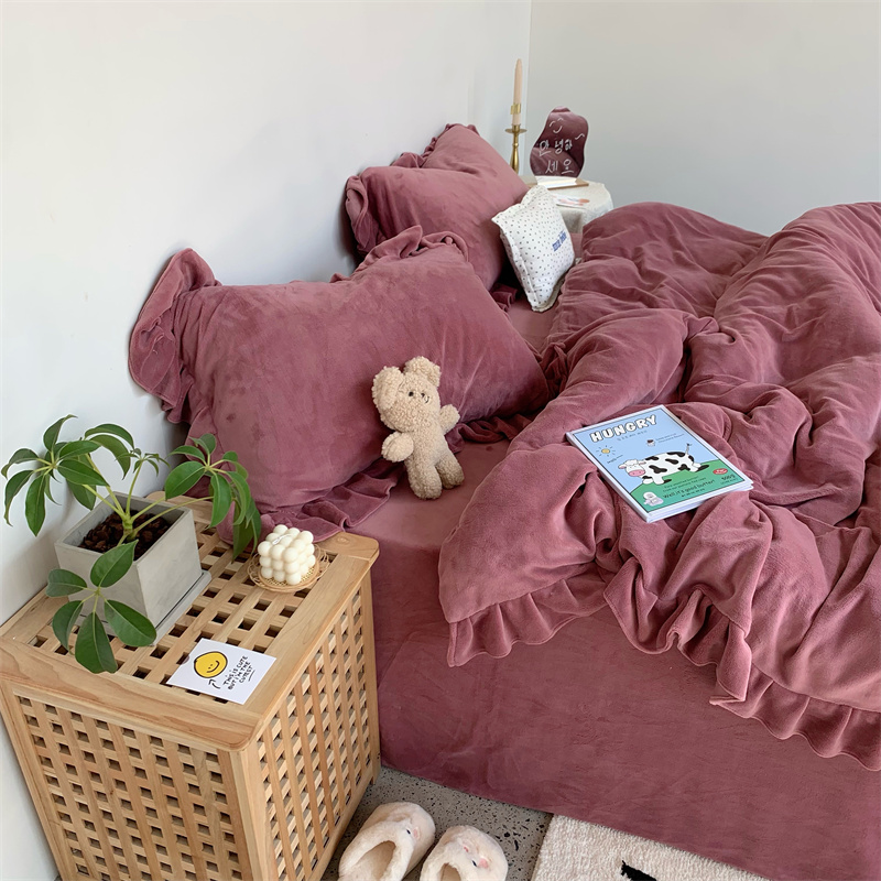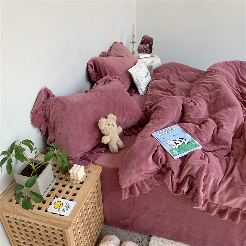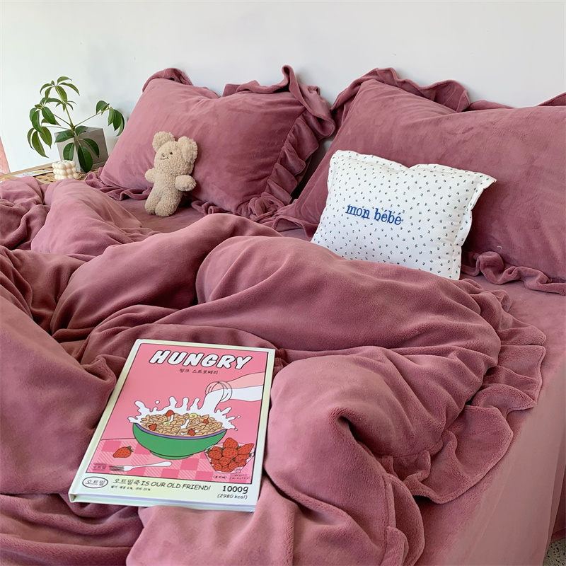 当前位置: 91家纺网 > 商品网购 > 床品套件 > 四件套 > 牛奶绒四件套 > 六巷胡同 2021秋冬新品韩式荷叶边牛奶绒ins纯色四件套 酒红色