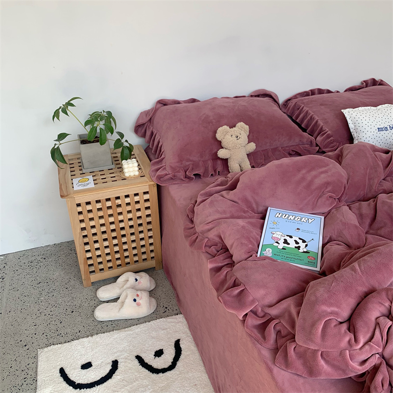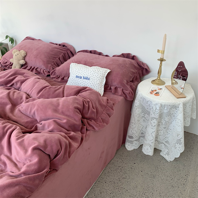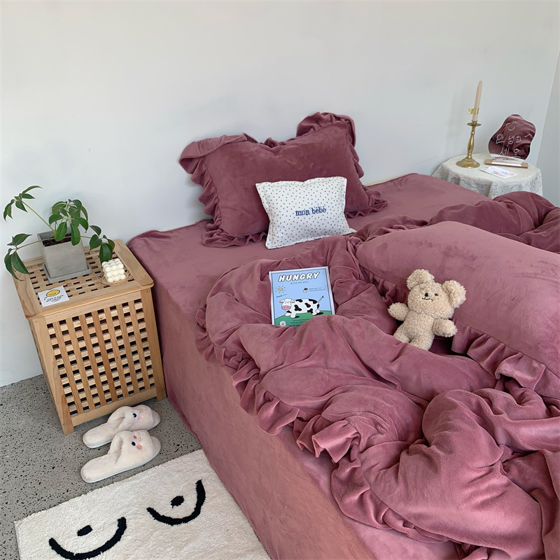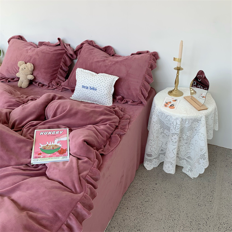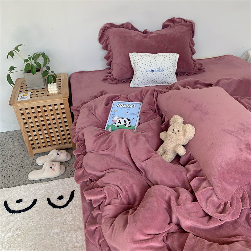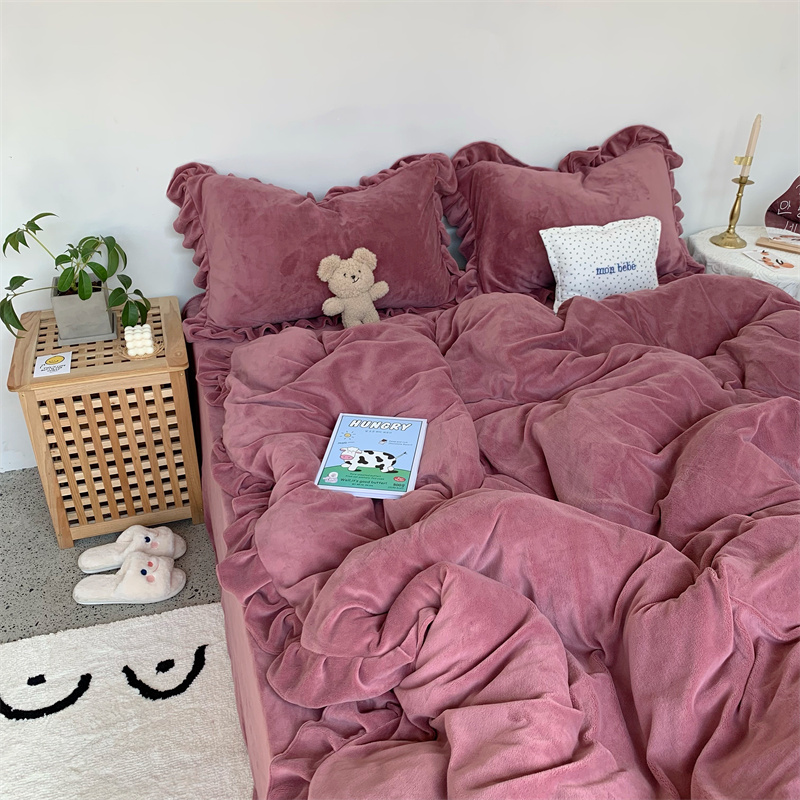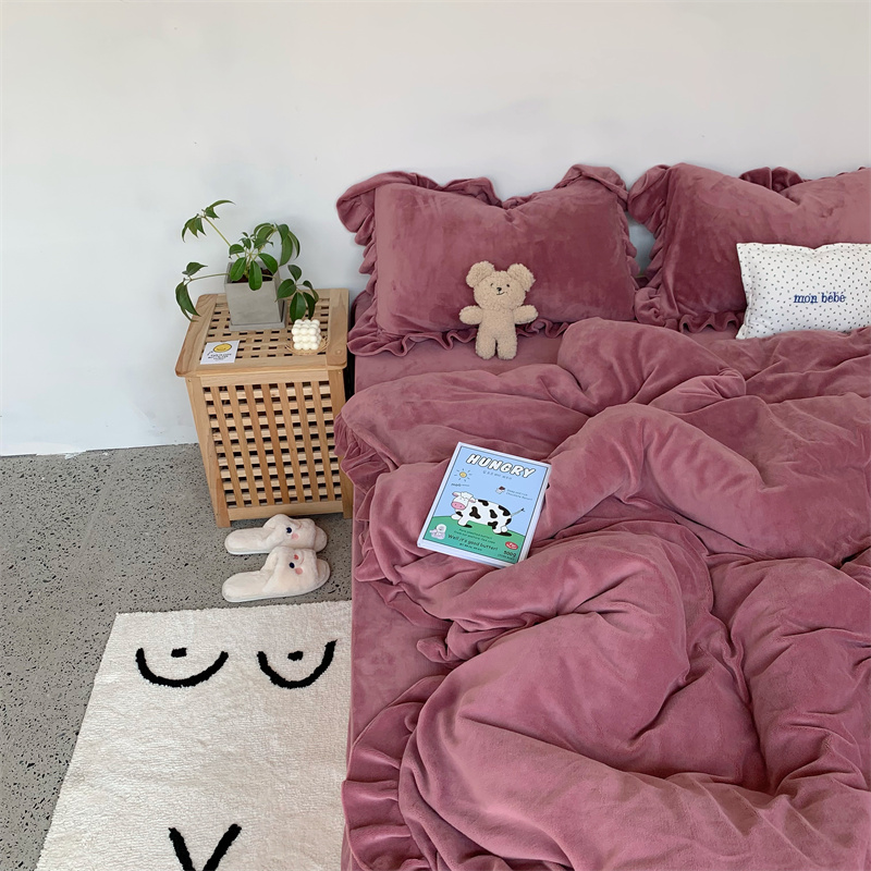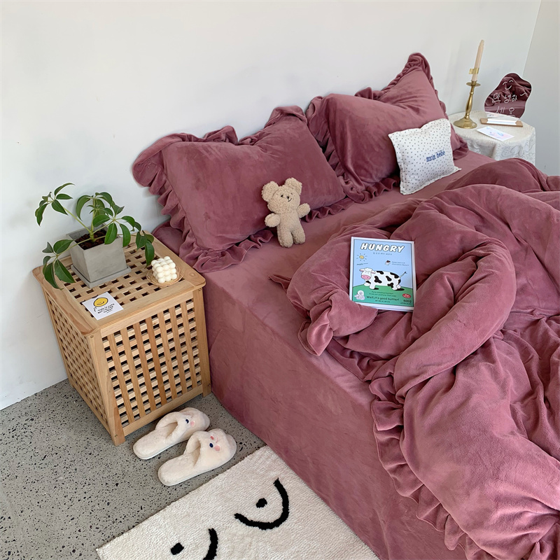 当前位置: 91家纺网 > 商品网购 > 床品套件 > 四件套 > 牛奶绒四件套 > 六巷胡同 2021秋冬新品韩式荷叶边牛奶绒ins纯色四件套 酒红色