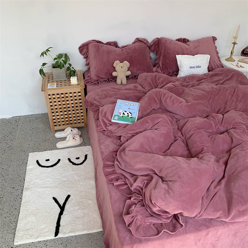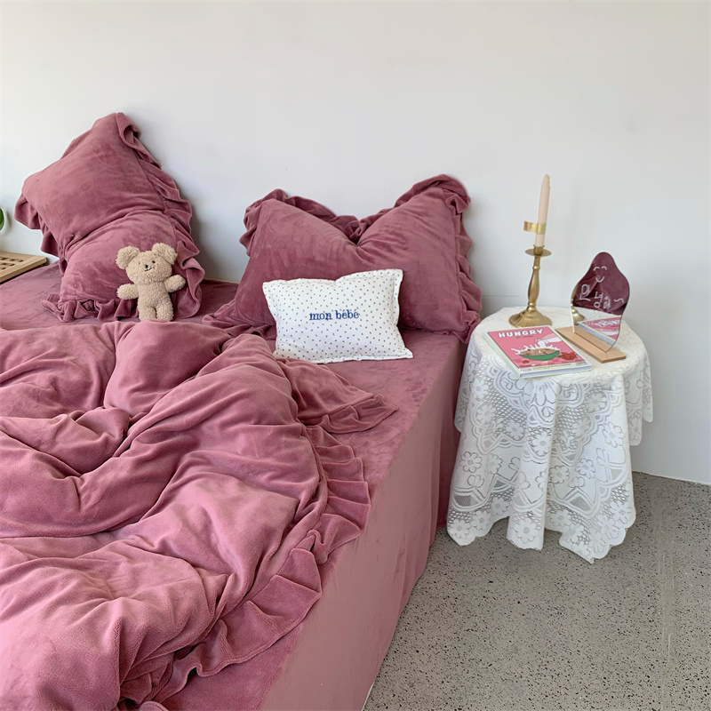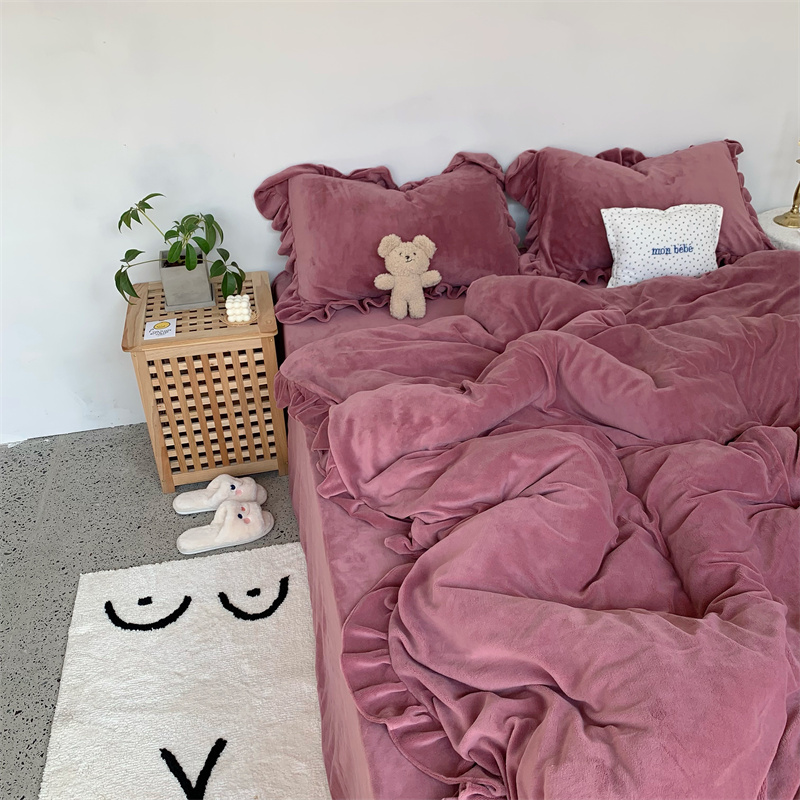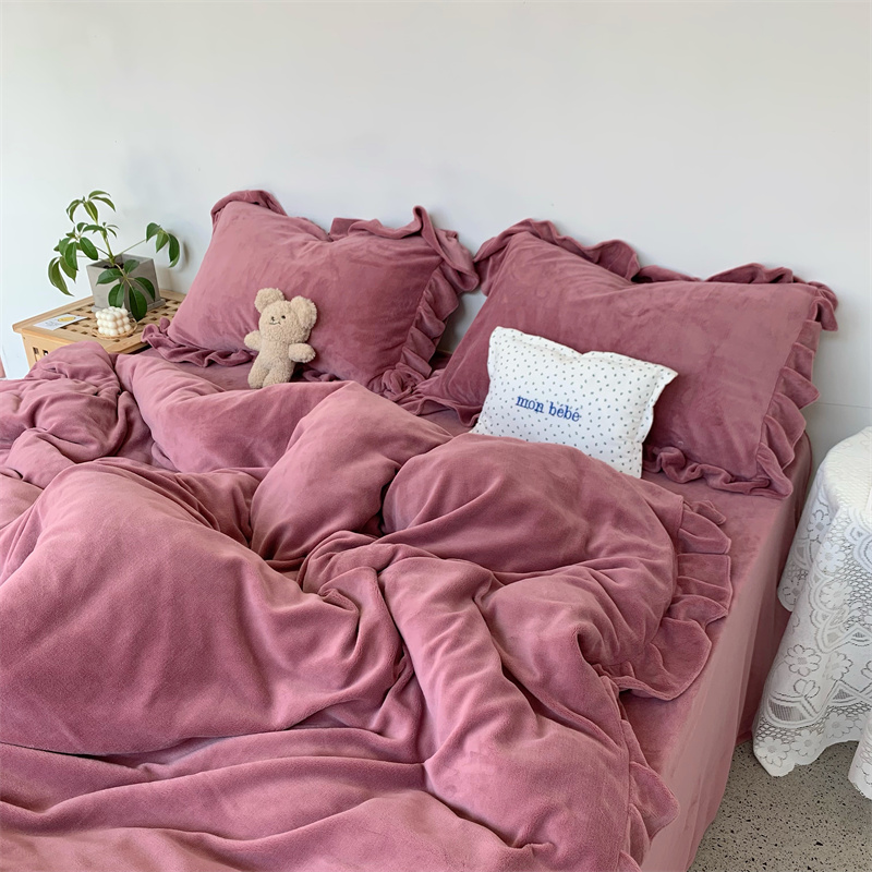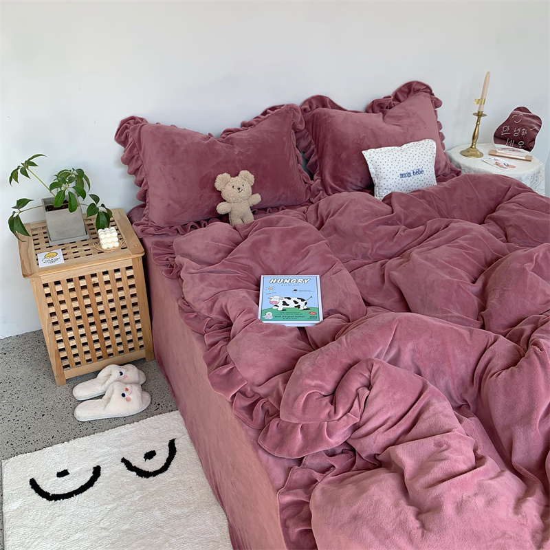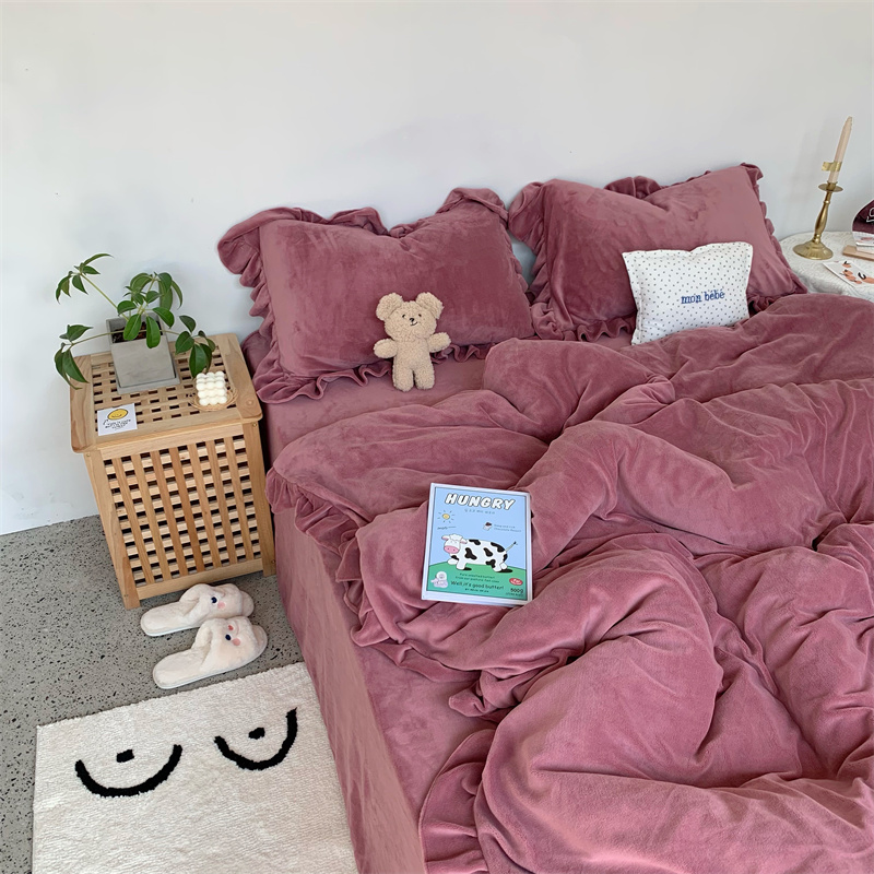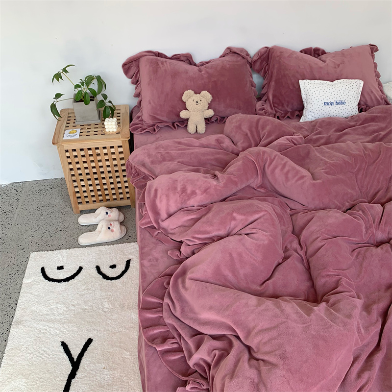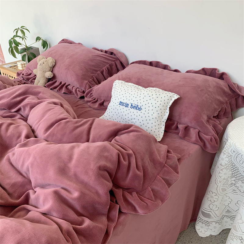 当前位置: 91家纺网 > 商品网购 > 床品套件 > 四件套 > 牛奶绒四件套 > 六巷胡同 2021秋冬新品韩式荷叶边牛奶绒ins纯色四件套 酒红色