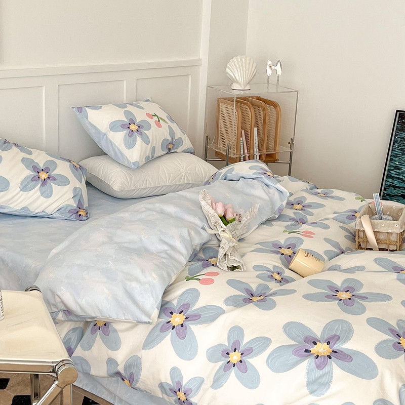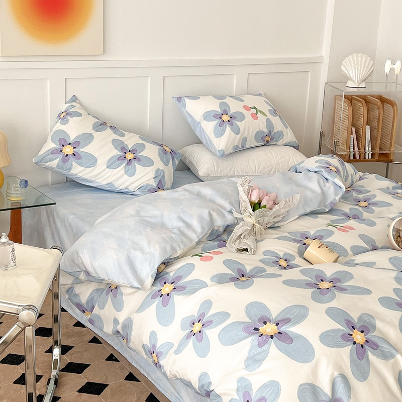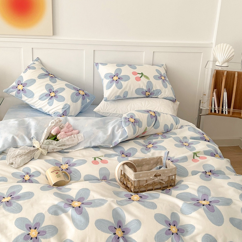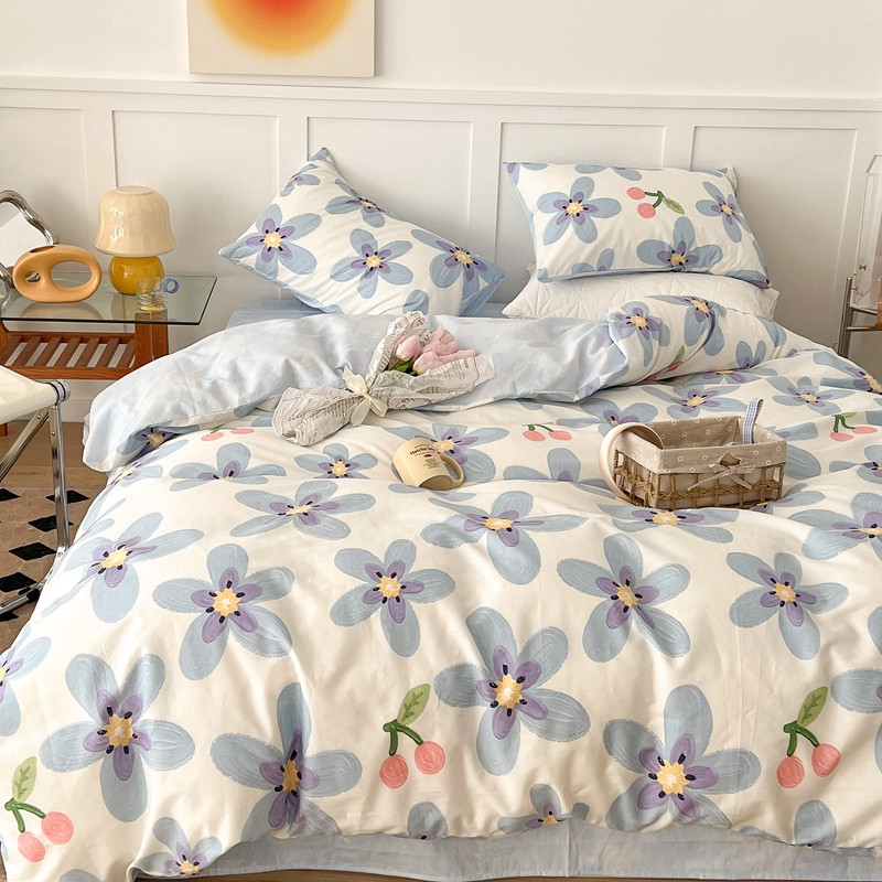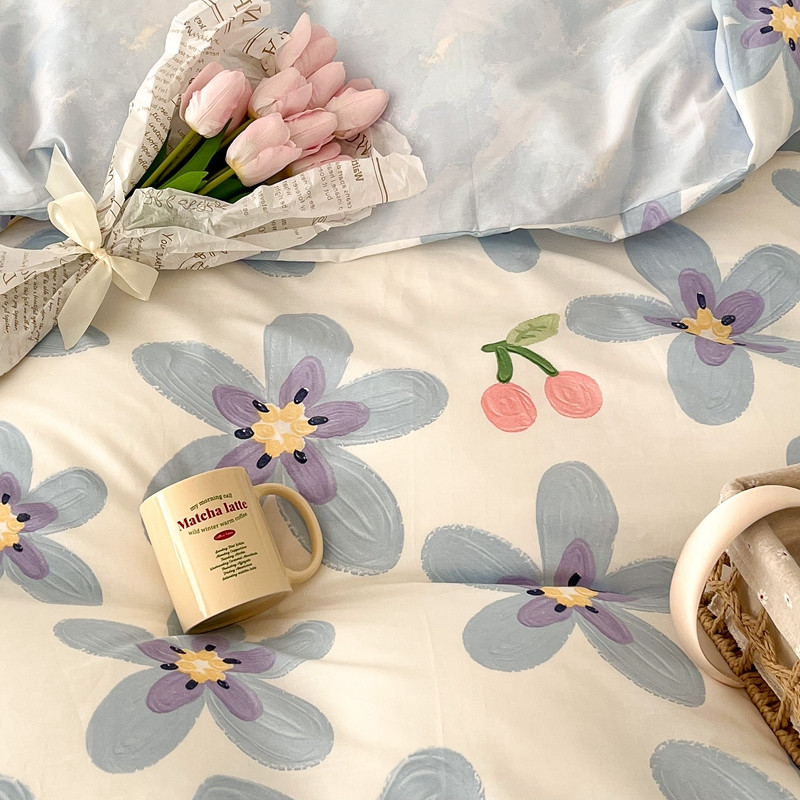 昔可家纺 2022新款13372全棉普通款花花系列四件套 油画樱桃花 蓝