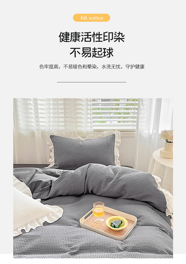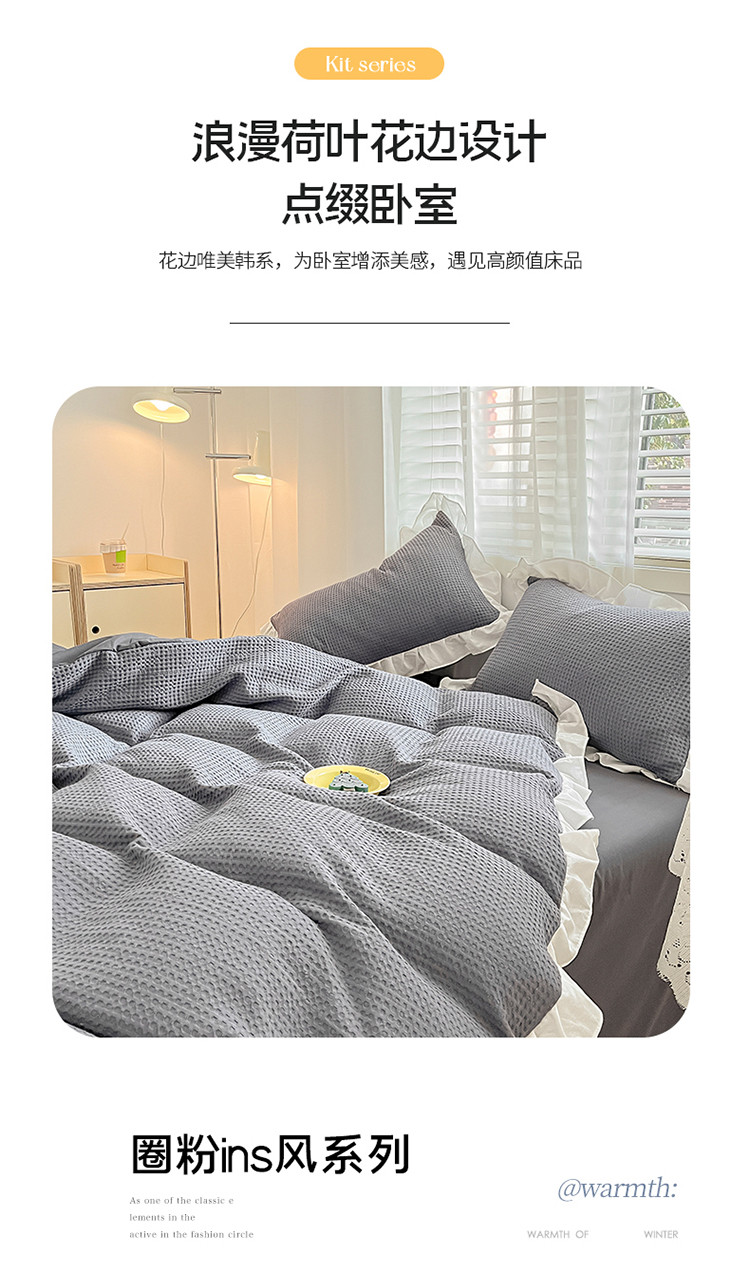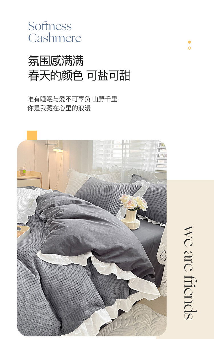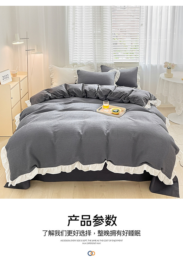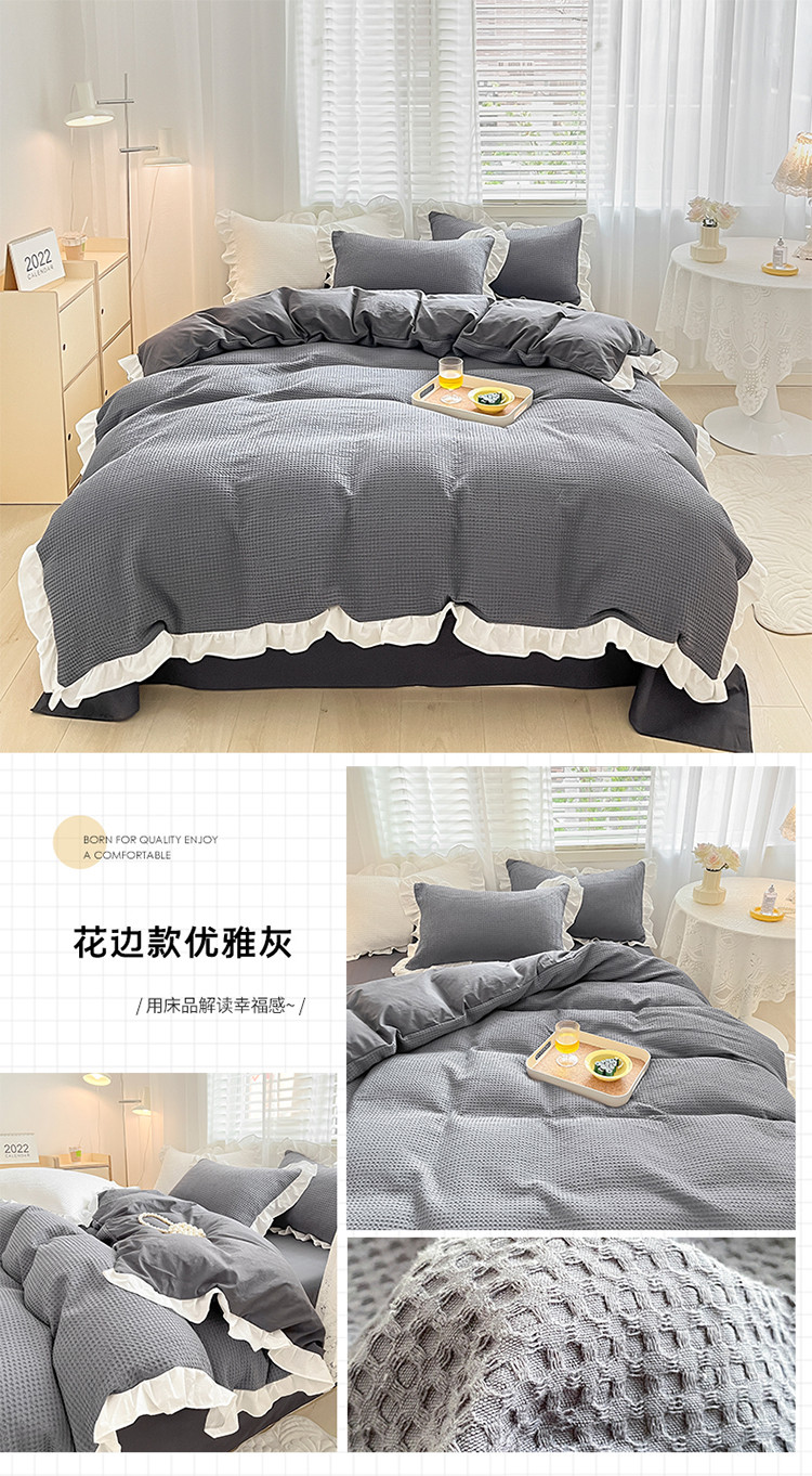 雅居纺家纺 2022新款华夫格花边款四件套 优雅灰