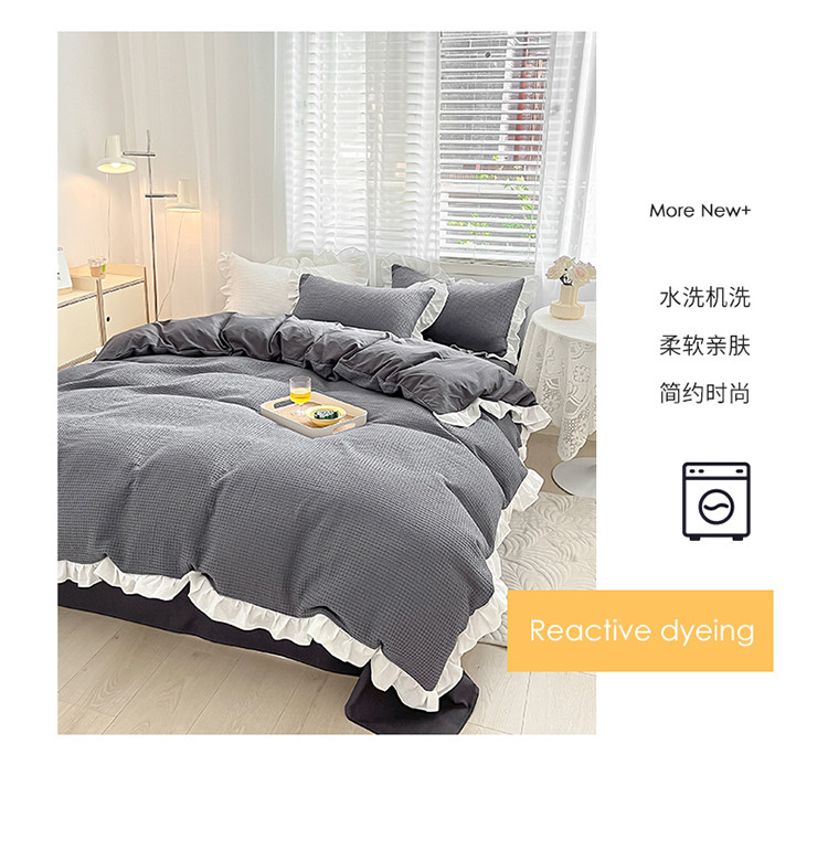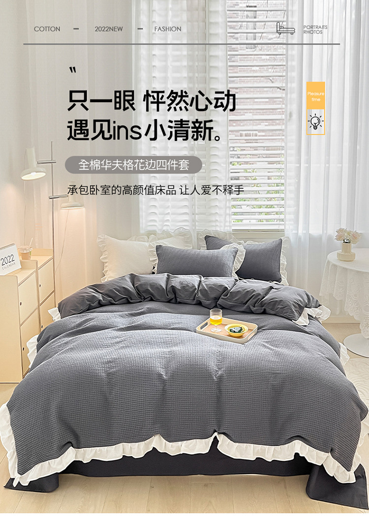 商品名称:雅居纺家纺 2022新款华夫格花边款四件套 优雅灰