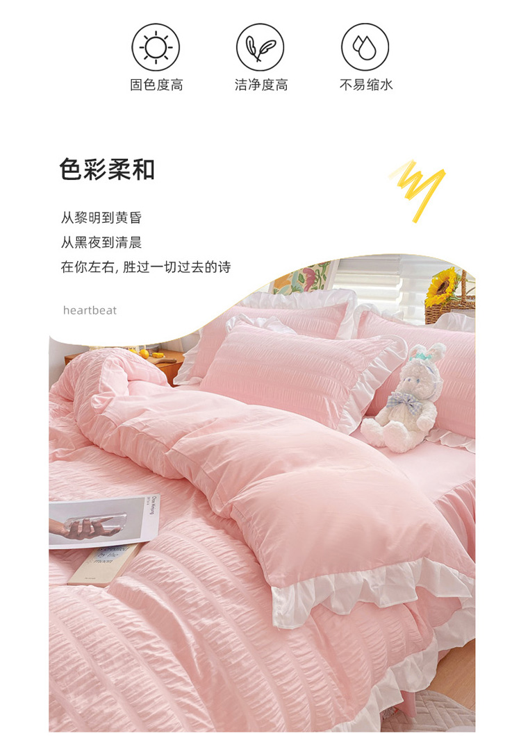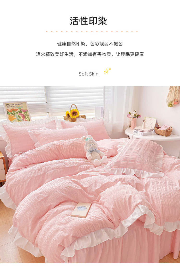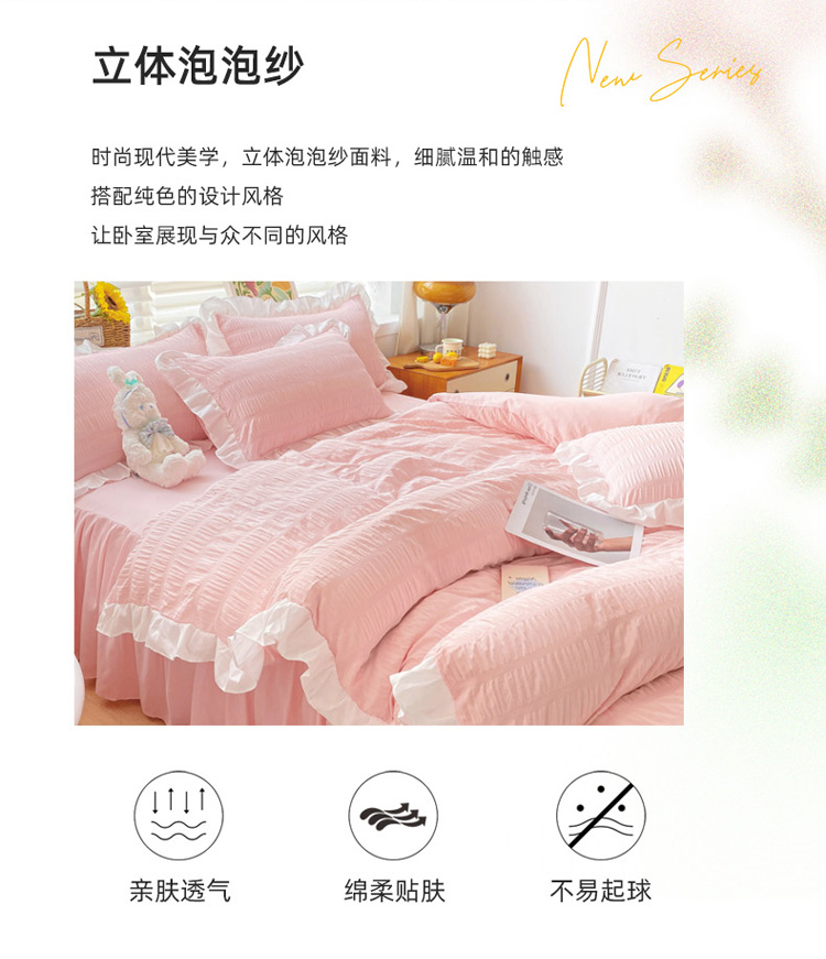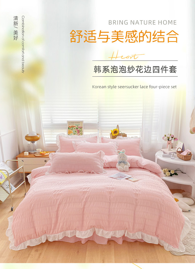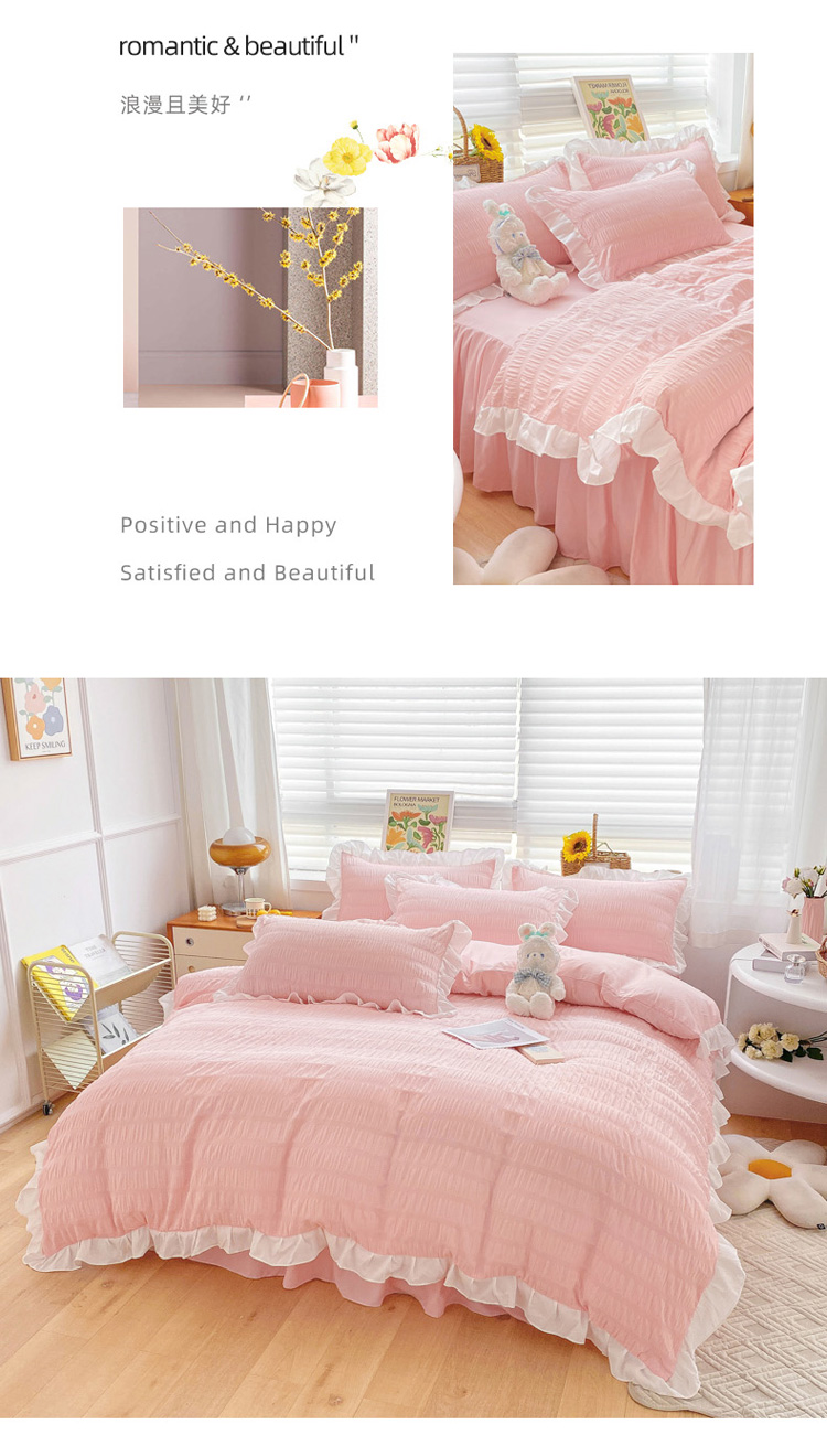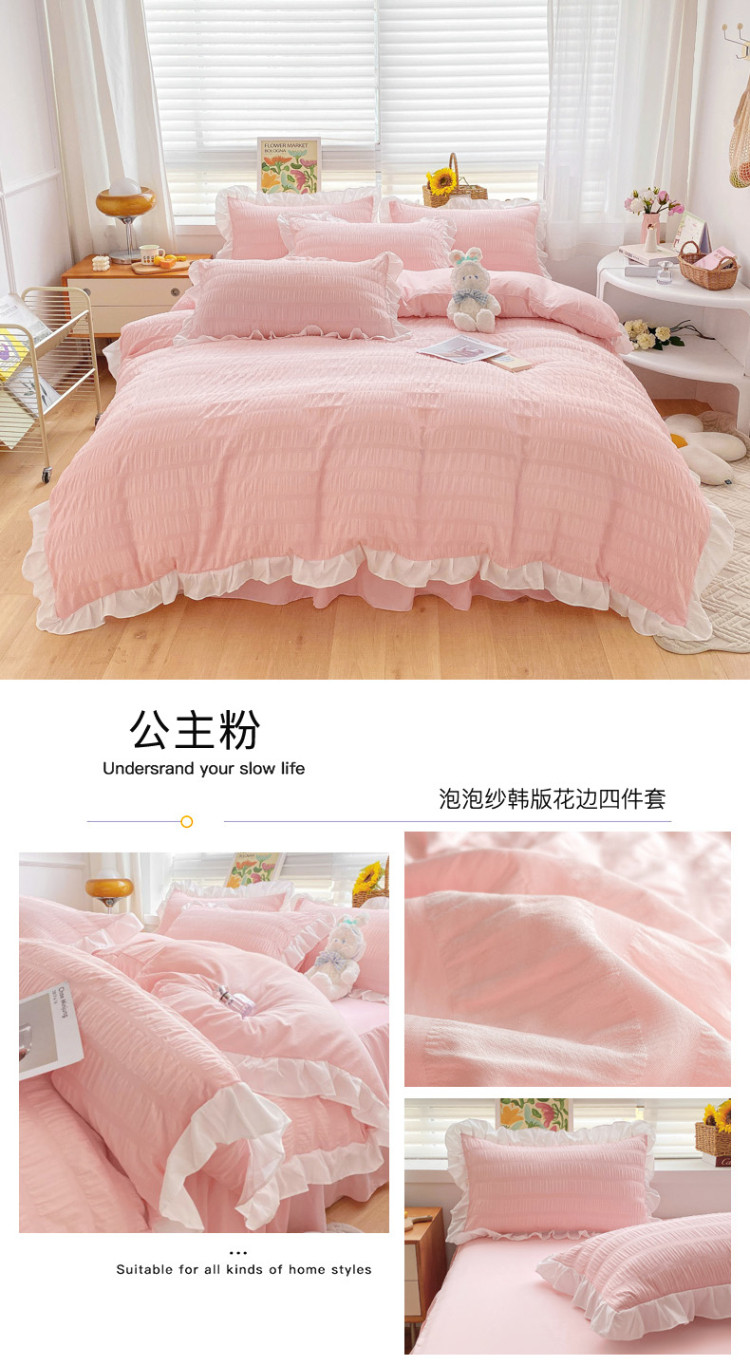 当前位置: 91家纺网 > 商品网购 > 床品套件 > 四件套 > 化纤普通四件套 > 慕澄家纺 2022新款韩版泡泡纱花边四件套(手机实拍) 公主粉
