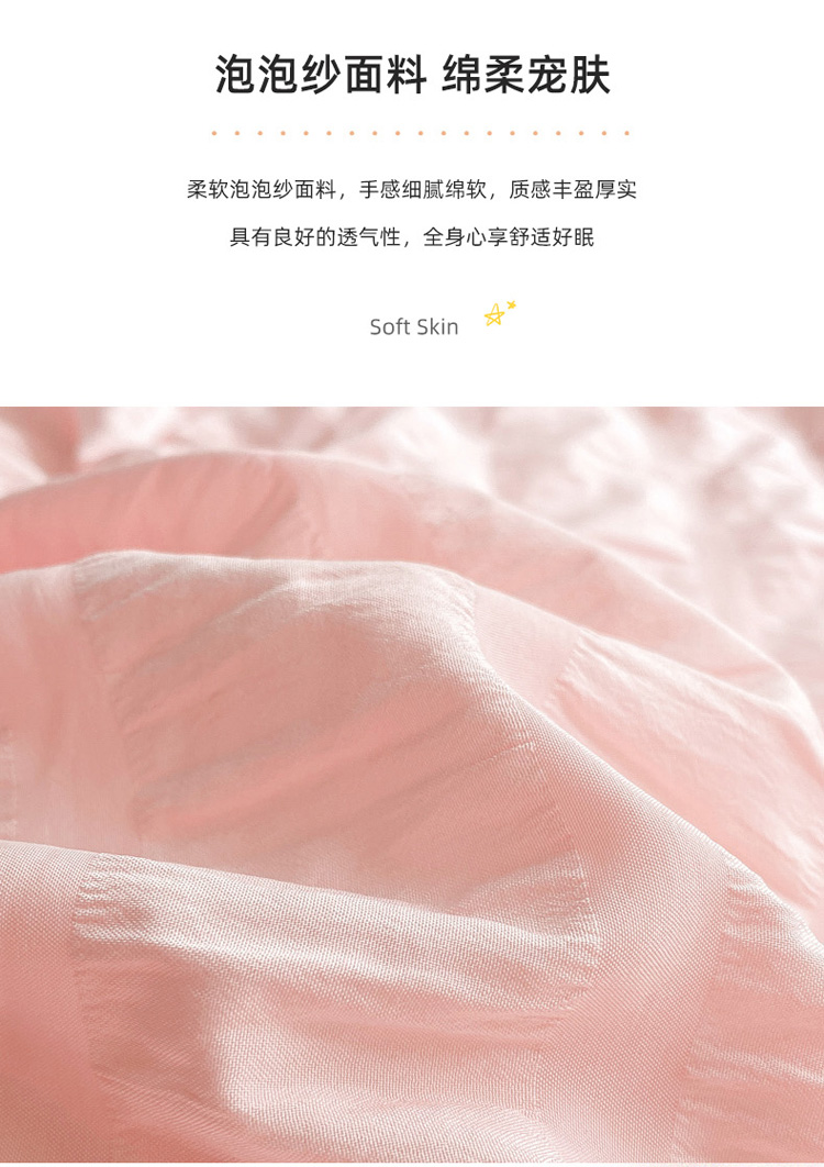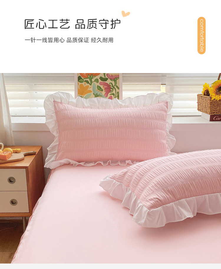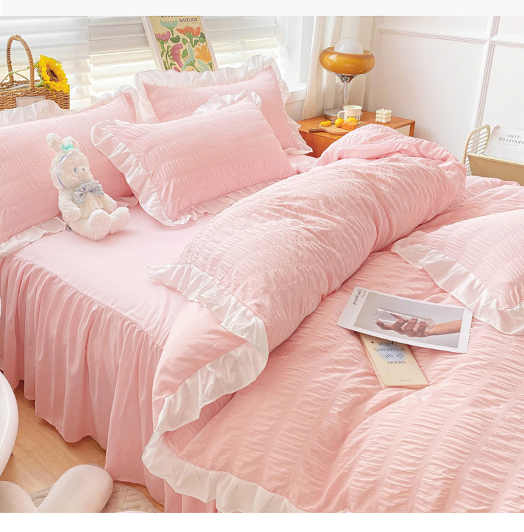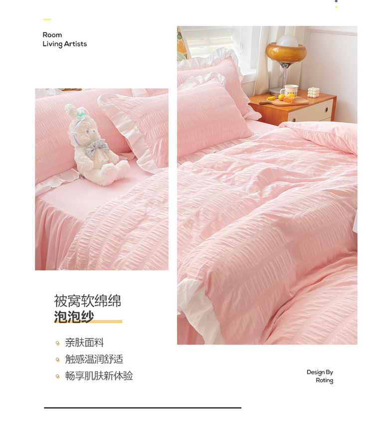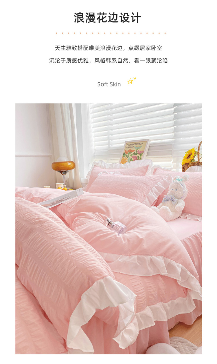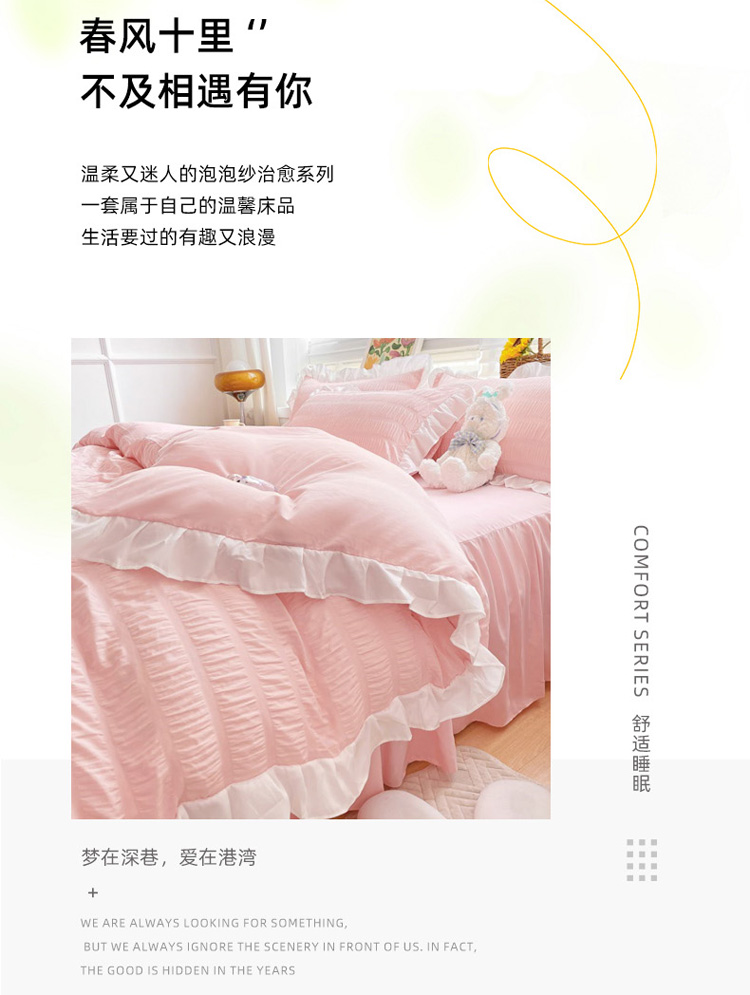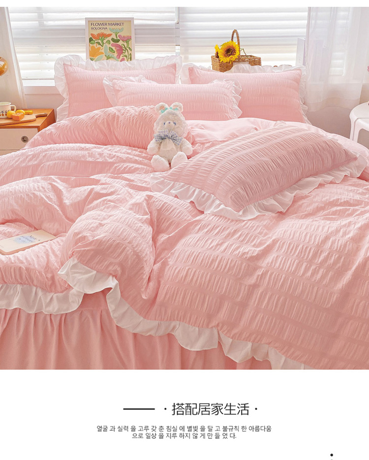 当前位置: 91家纺网 > 商品网购 > 床品套件 > 四件套 > 化纤普通四件套 > 慕澄家纺 2022新款韩版泡泡纱花边四件套(手机实拍) 公主粉