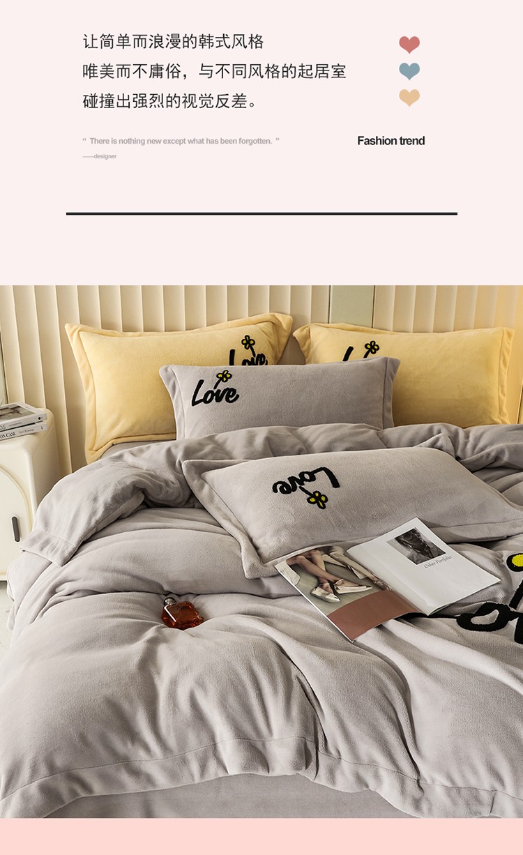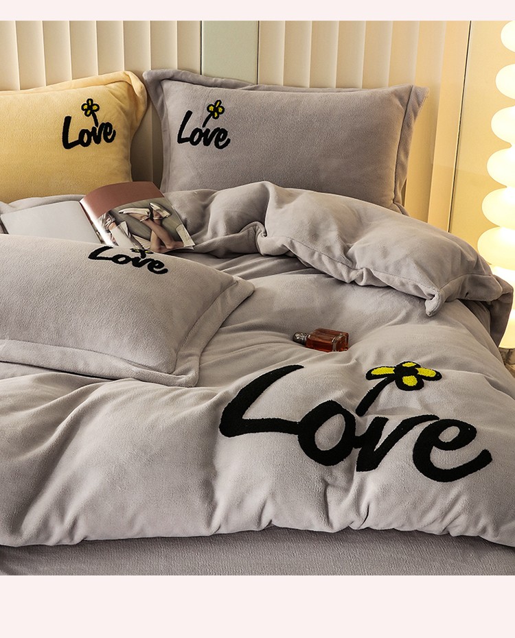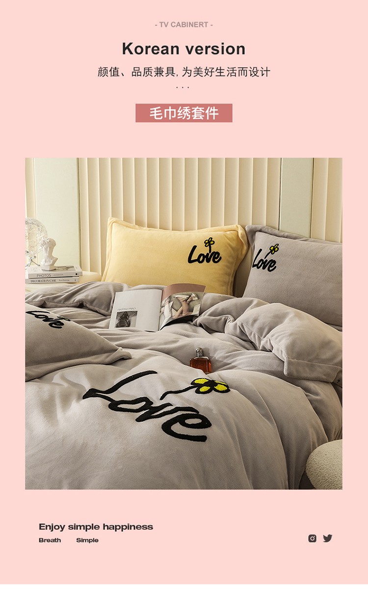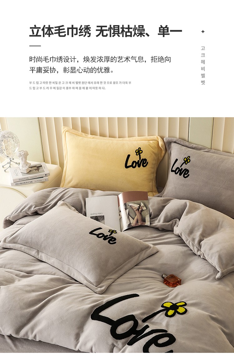 名品优仓2022新款牛奶绒230克毛巾绣四件套LOVE 浅灰