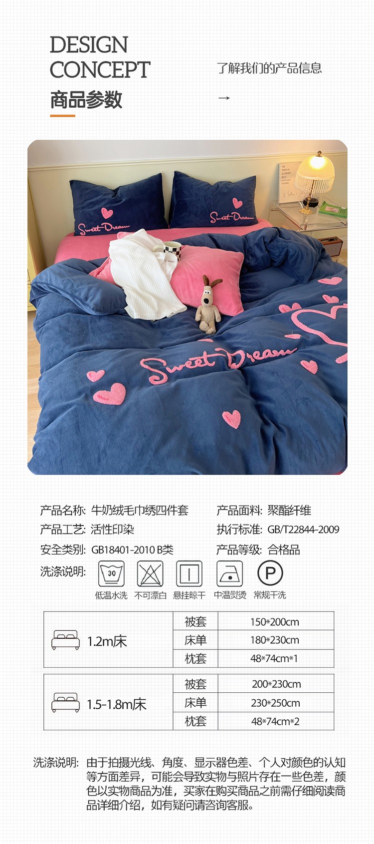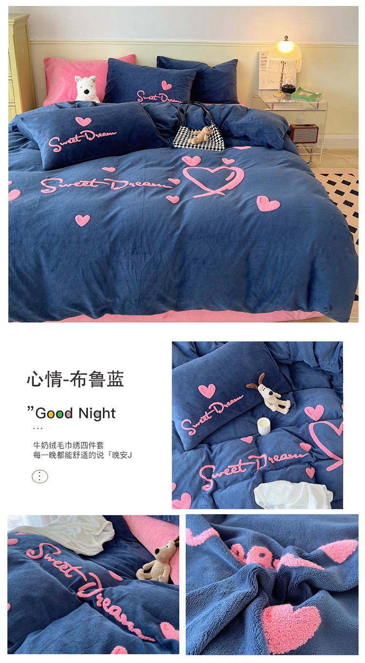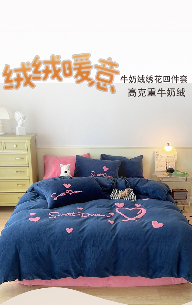 三朵2022新款牛奶绒绣花四件套 心情布鲁蓝