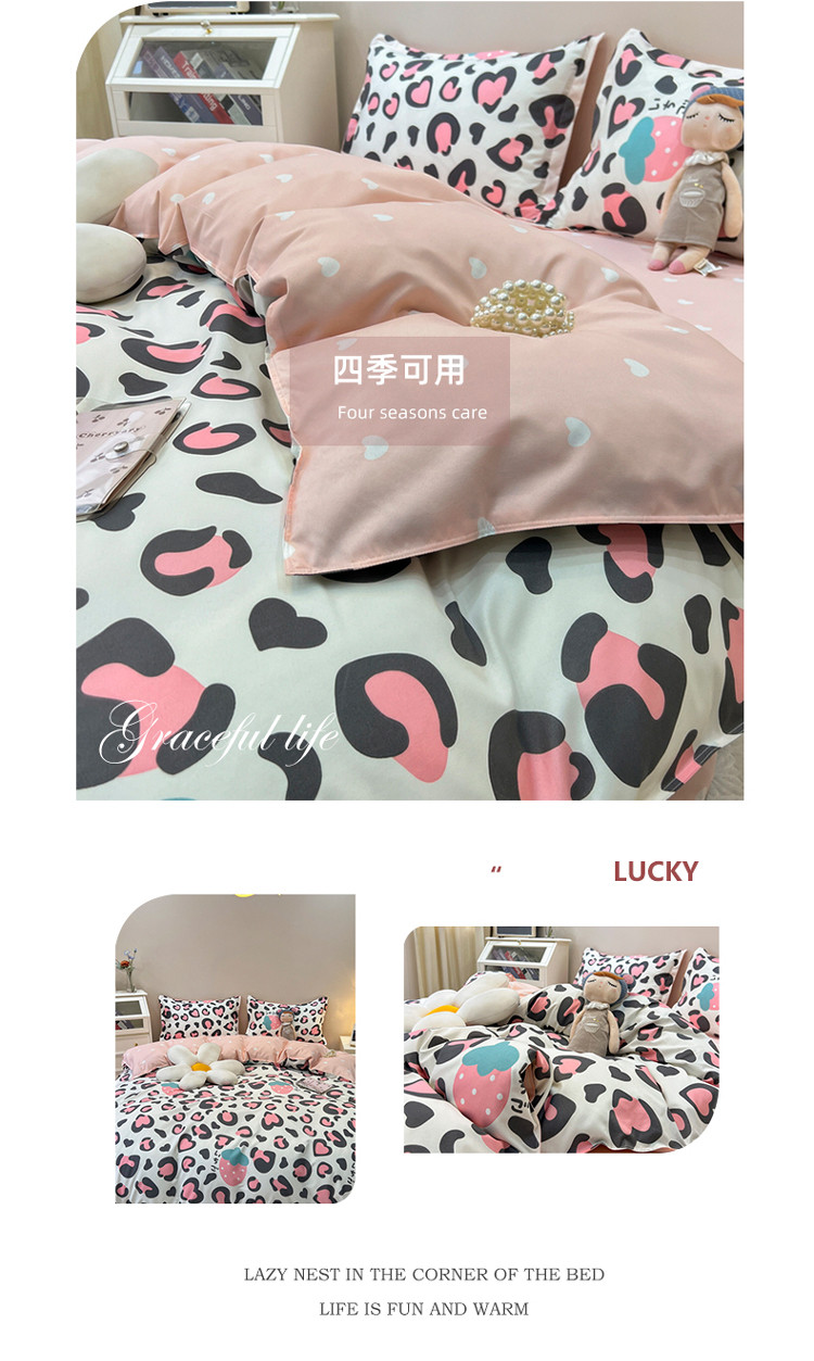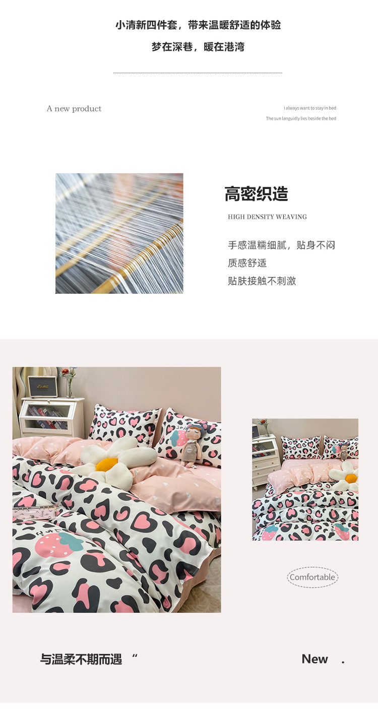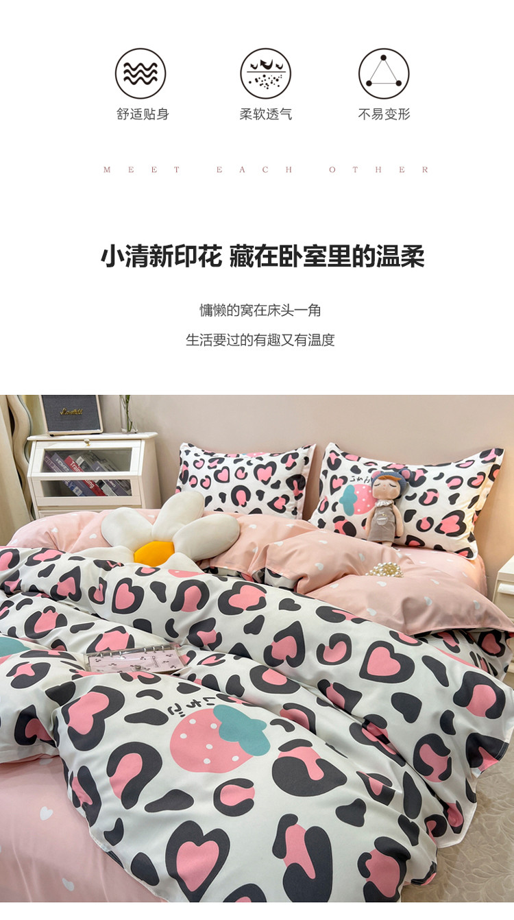 商品名称:宏源 2022新款芦荟棉亲肤印花四件套10月新花型 草莓豹纹