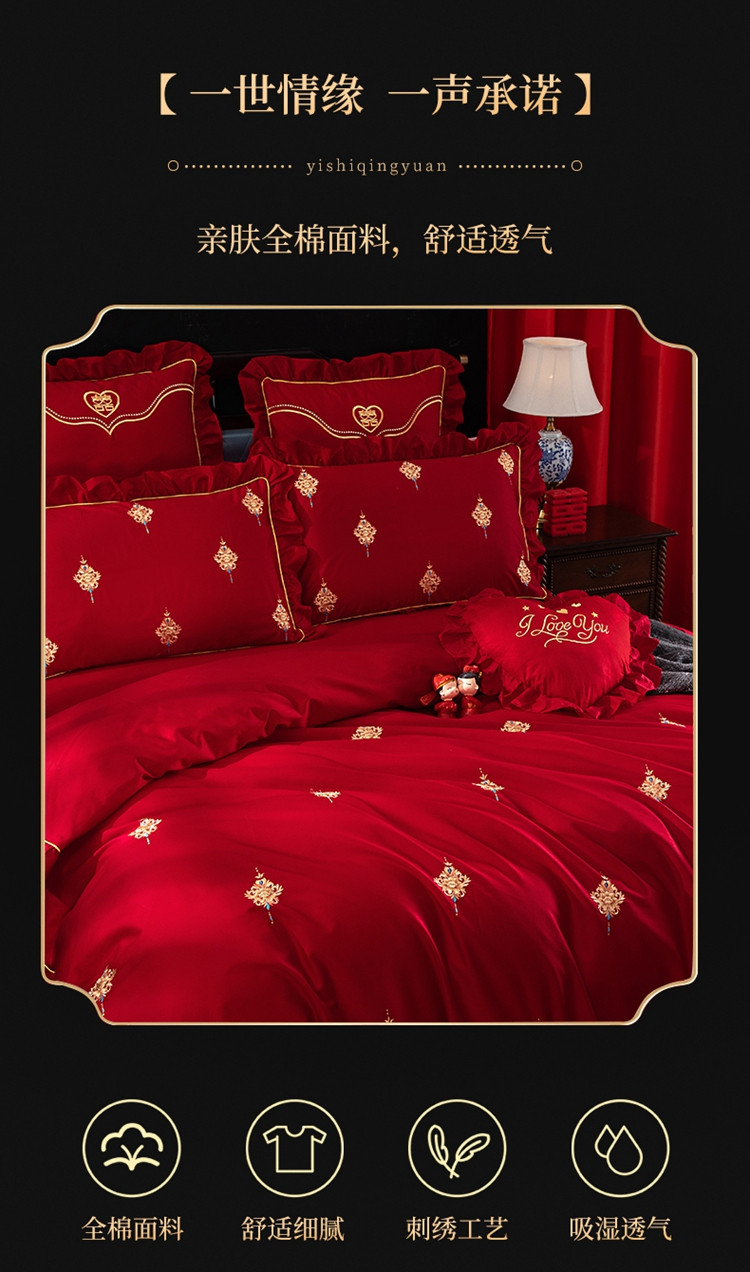 商品名称:慕她婚庆四件套大红色大花结婚全棉纯棉刺绣花多件套直播 幸福恋歌