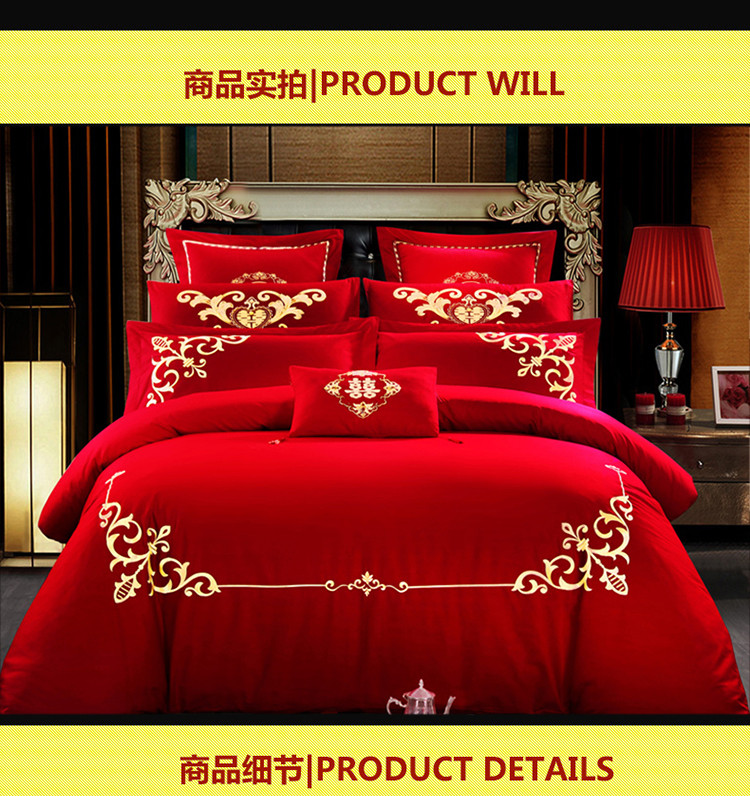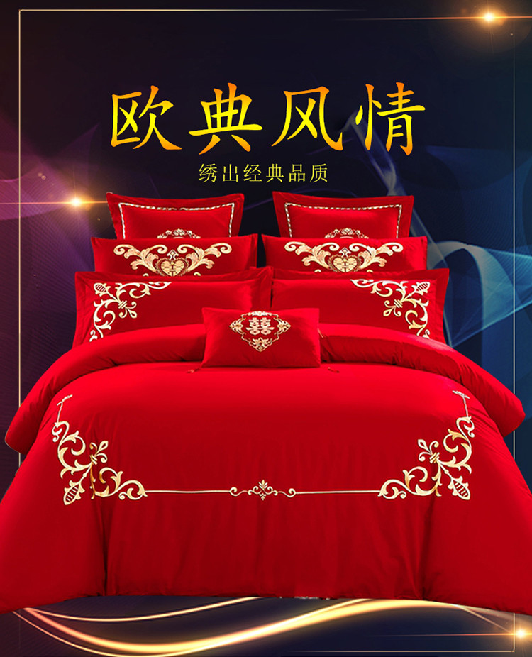 商品名称:慕她婚庆四件套大红色结婚全棉纯棉简约刺绣花多件套直播 欧典风情