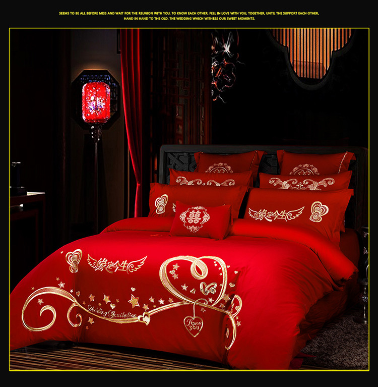 慕她婚庆四件套大红色结婚全棉纯棉简约刺绣花多件套直播 缘定今生