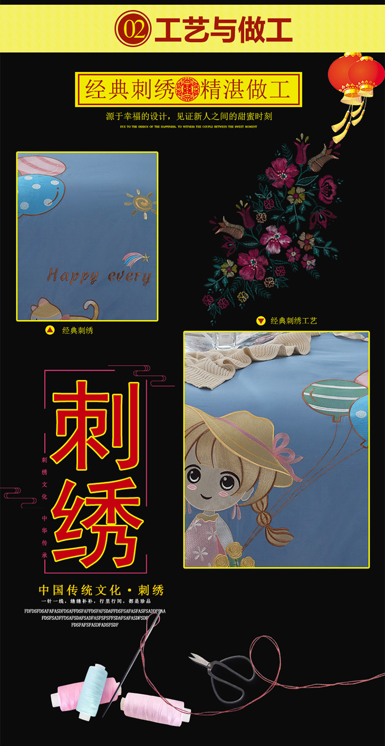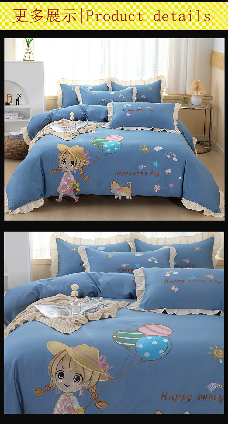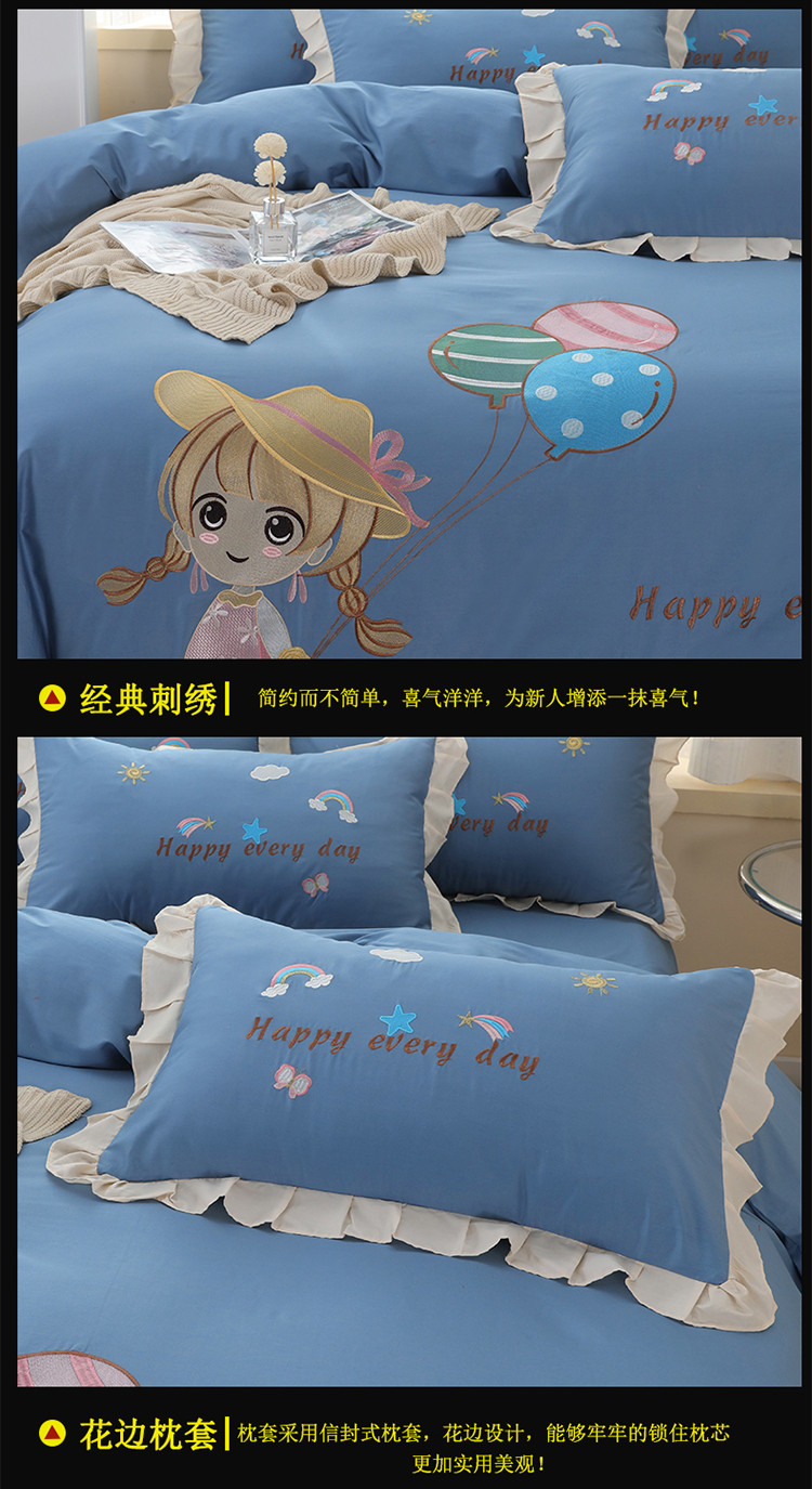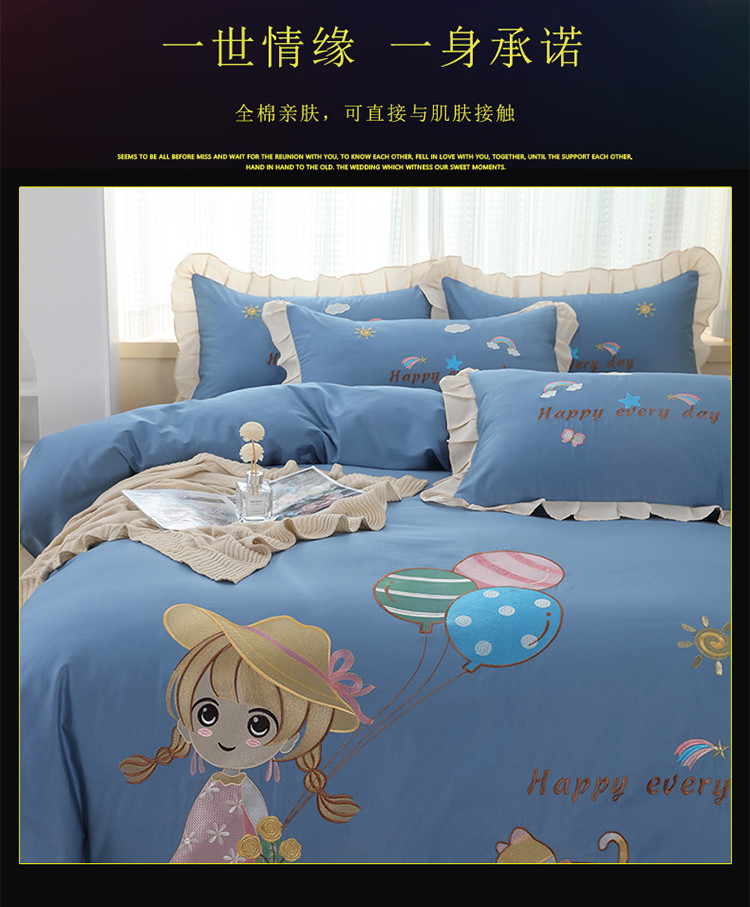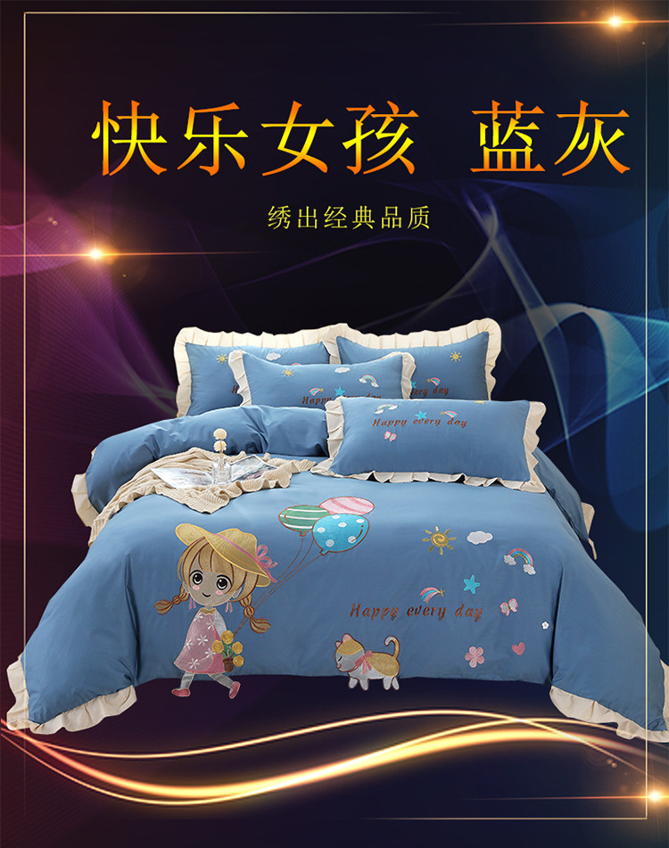 商品名称:慕她婚庆四件套大红色结婚全棉纯棉刺绣花多件套直播 快乐女孩蓝灰