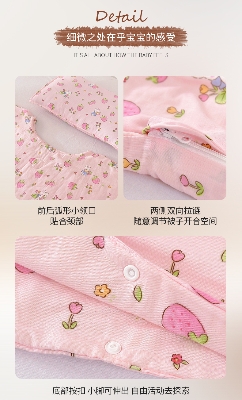 A类夏季纯棉睡袋双层纱棉花薄款春秋宝宝中大童儿童防踢被神器 草莓小兔