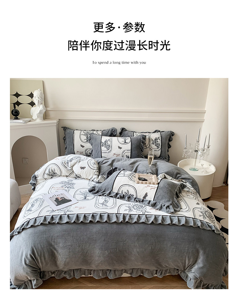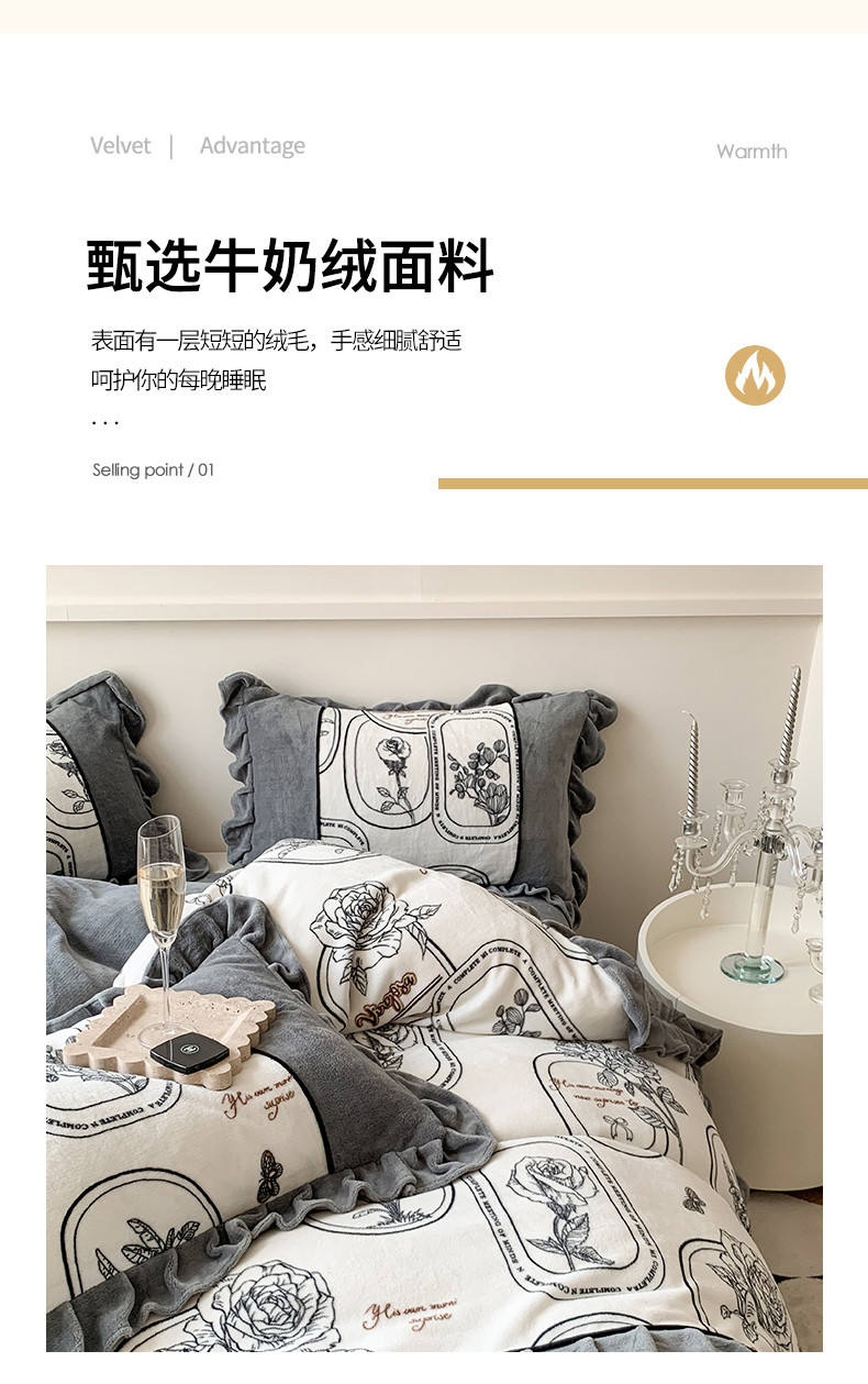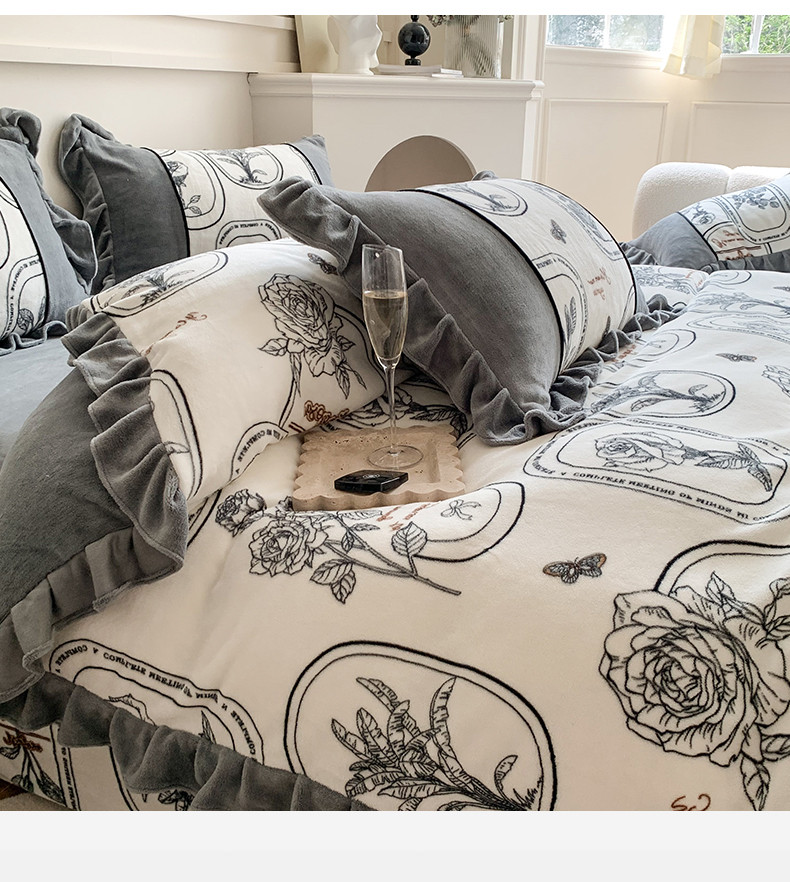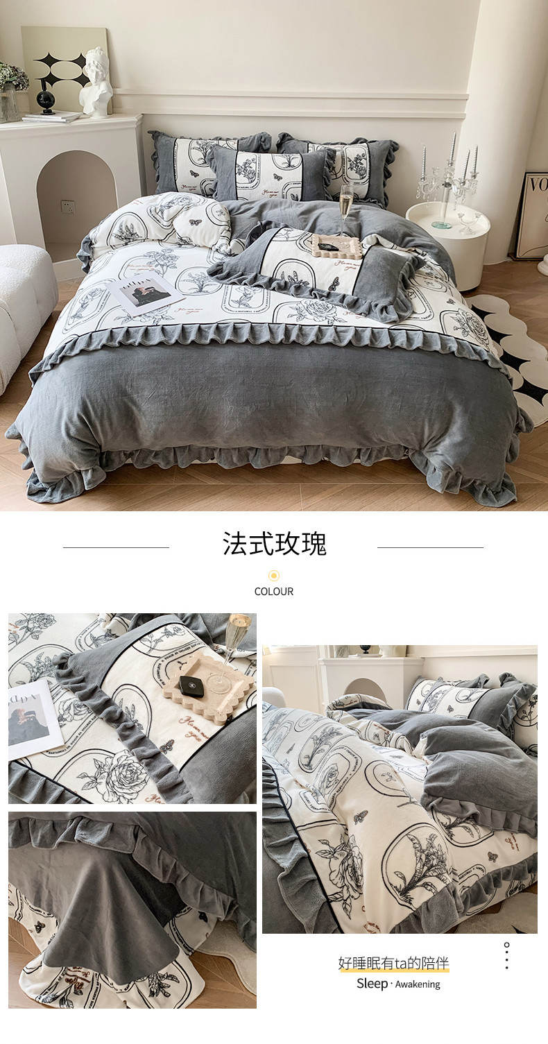 商品名称:吾欢心 2024新款法式复古韩版花边牛奶绒四件套 法式玫瑰