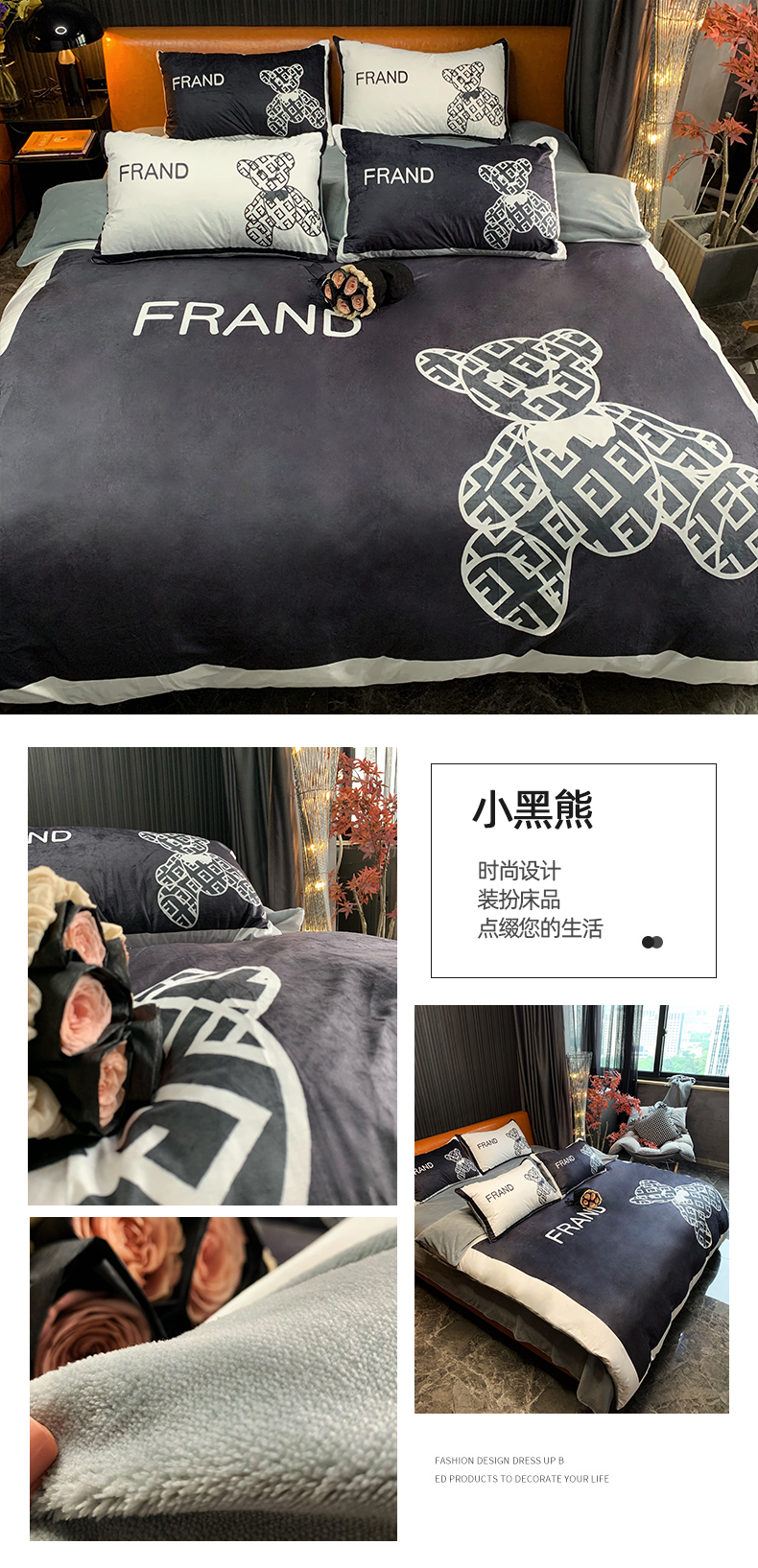 色鬼布艺 2023新款活性数码印花牛奶绒四件套-场景一 小黑熊