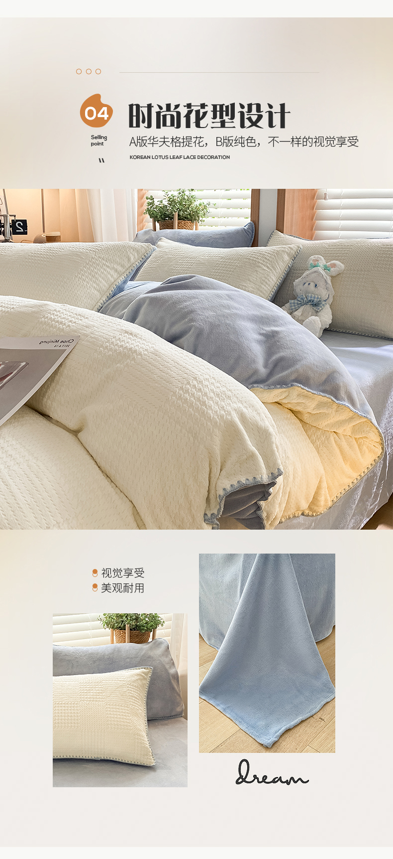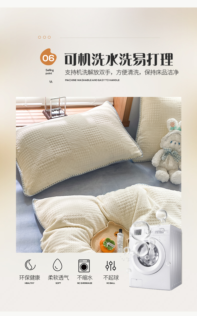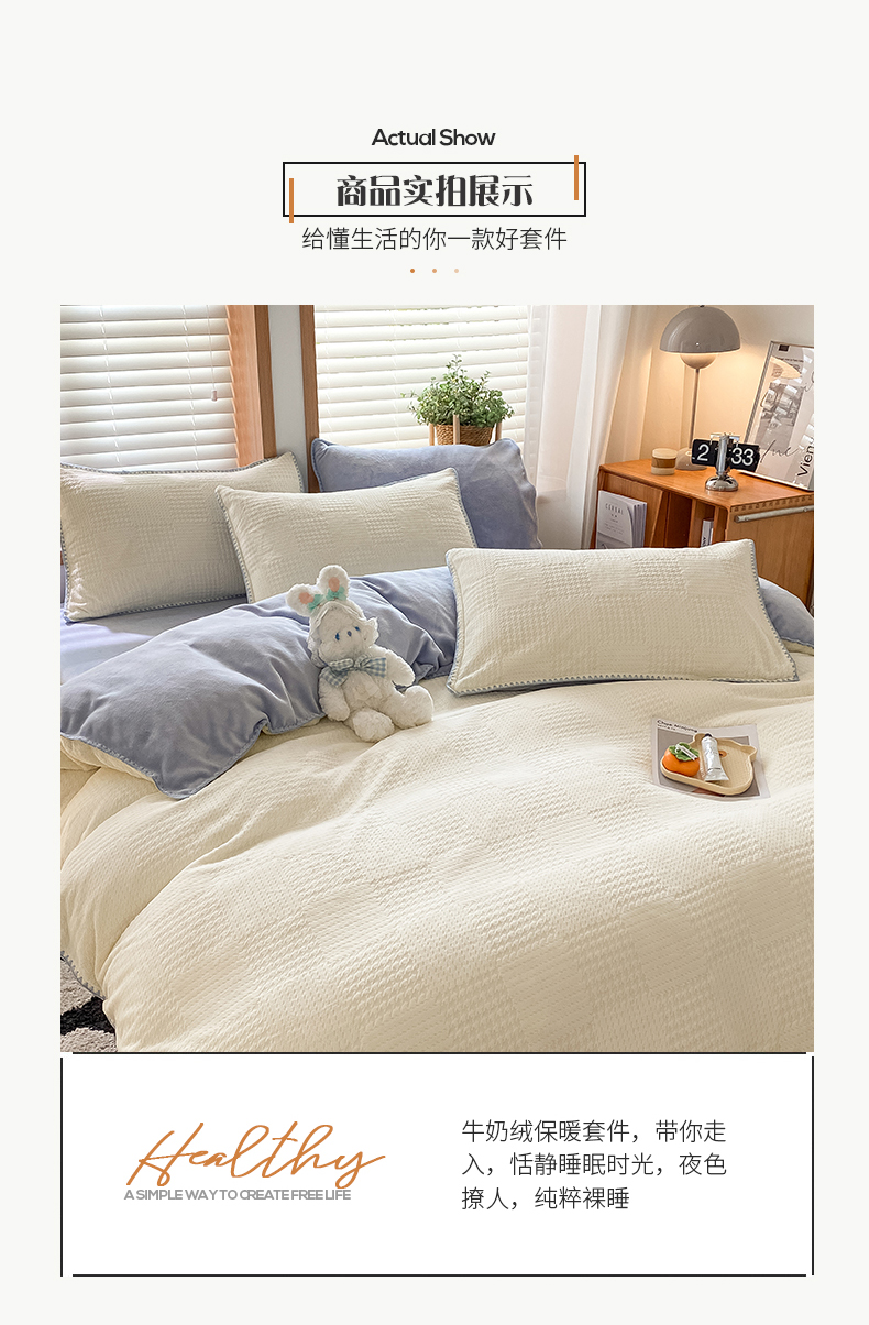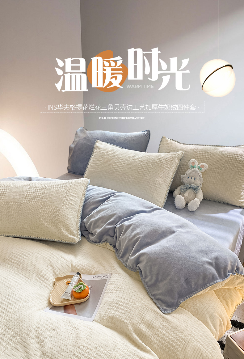 商品名称:桃子家居 2023新款A类无印ins华夫格提花烂花雕花剪花三角贝壳边工艺加厚牛奶绒四件套 绒华夫格-白兰
