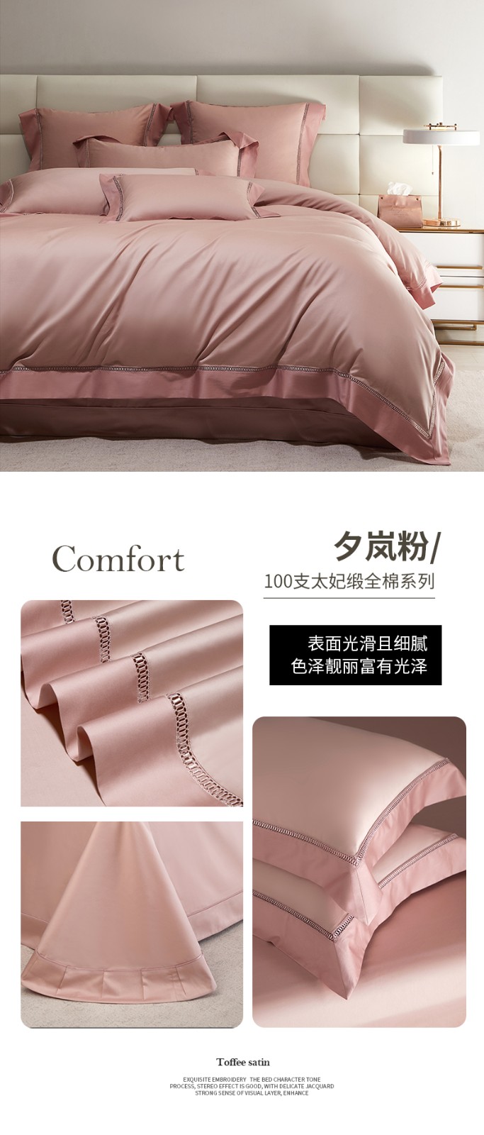 商品名称:100支100S全棉太妃缎纯色拼色四件套可选多件套可定制 夕岚粉