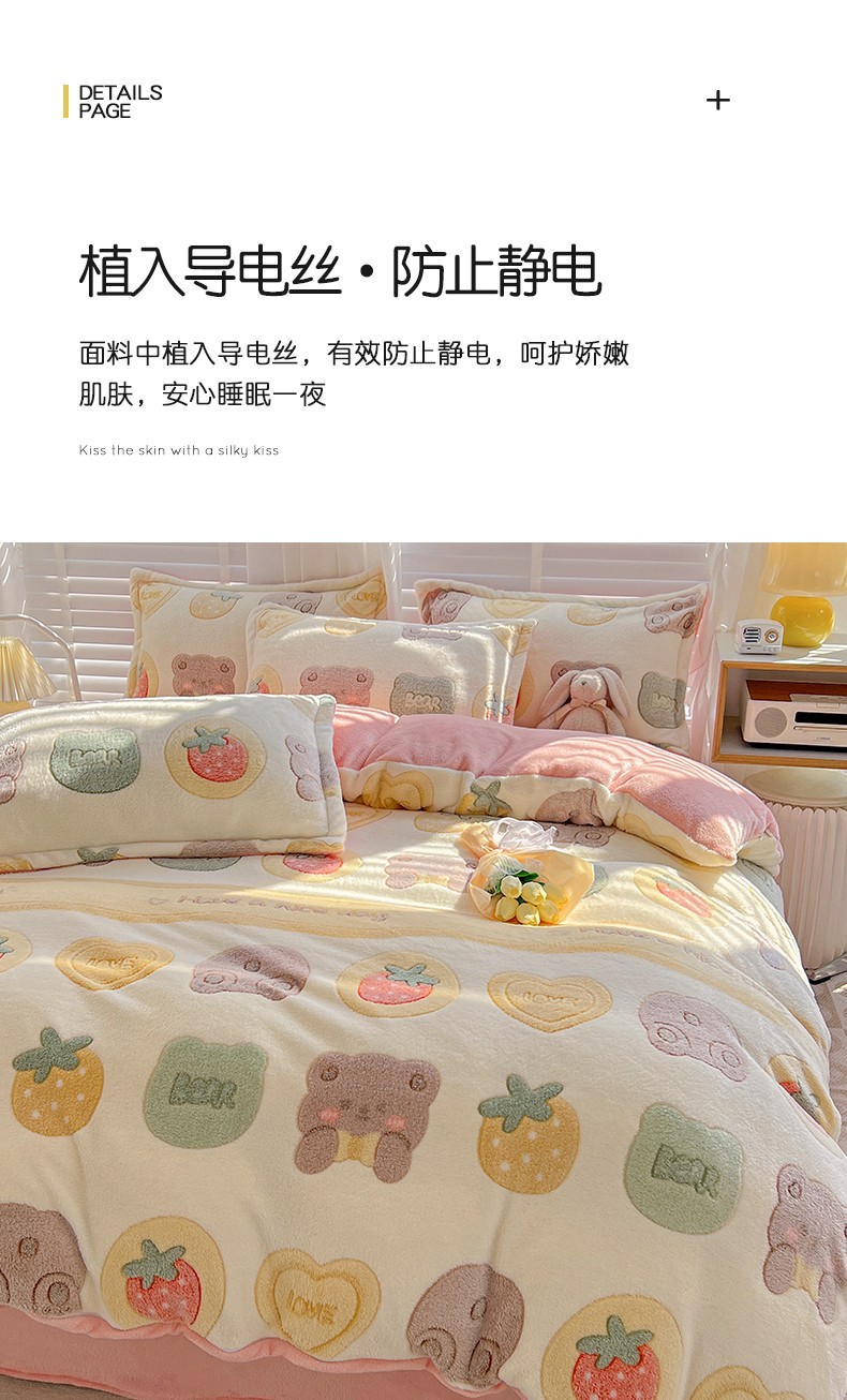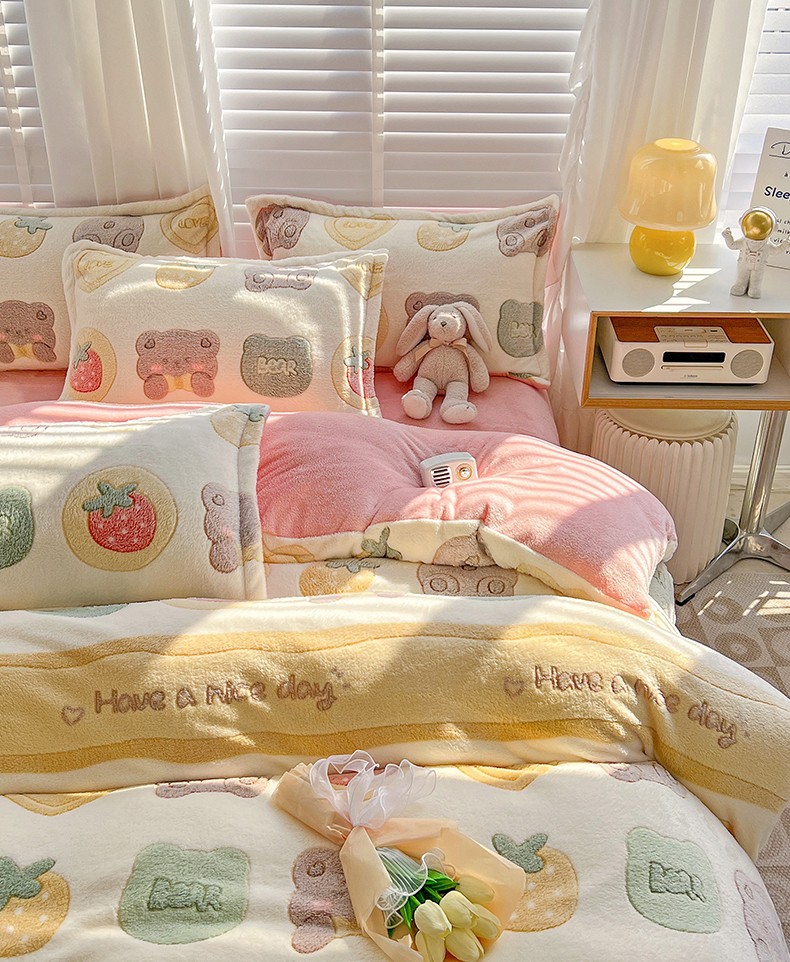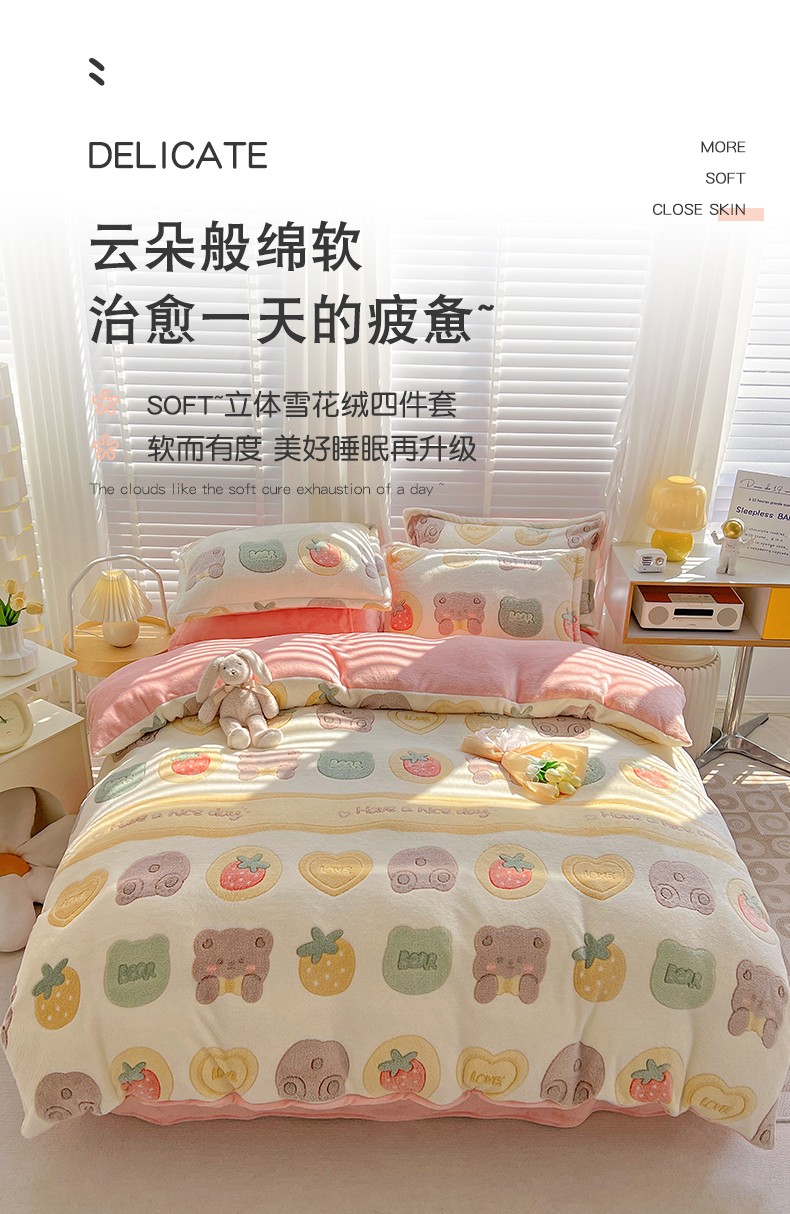 当前位置: 91家纺网 > 商品网购 > 床品套件 > 四件套 > 牛奶绒四件套 > 宜家坊 2023新款高克重立体雪花绒四件套 系列一 熊熊乐园-米
