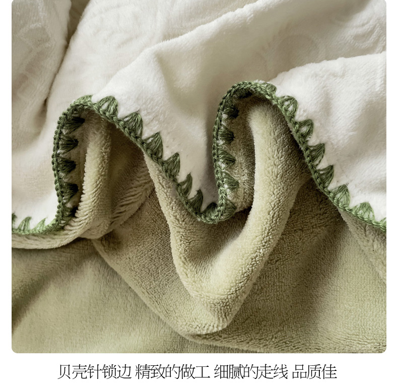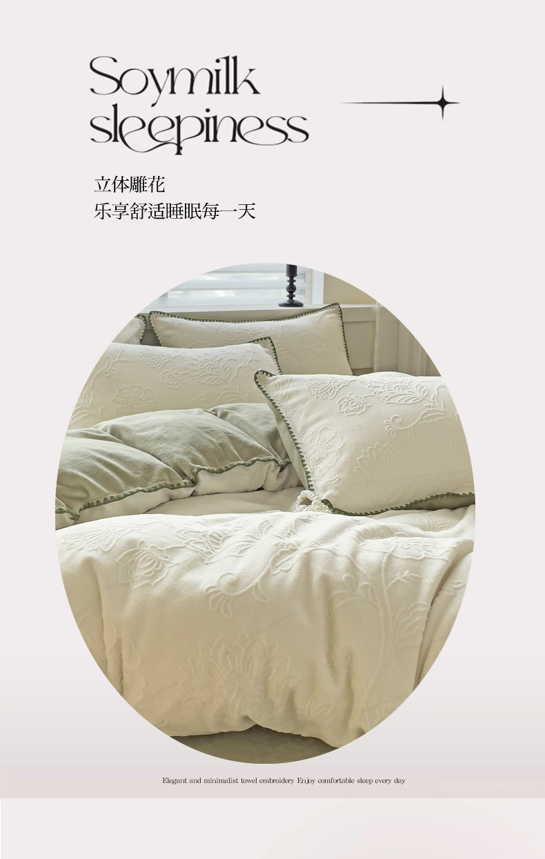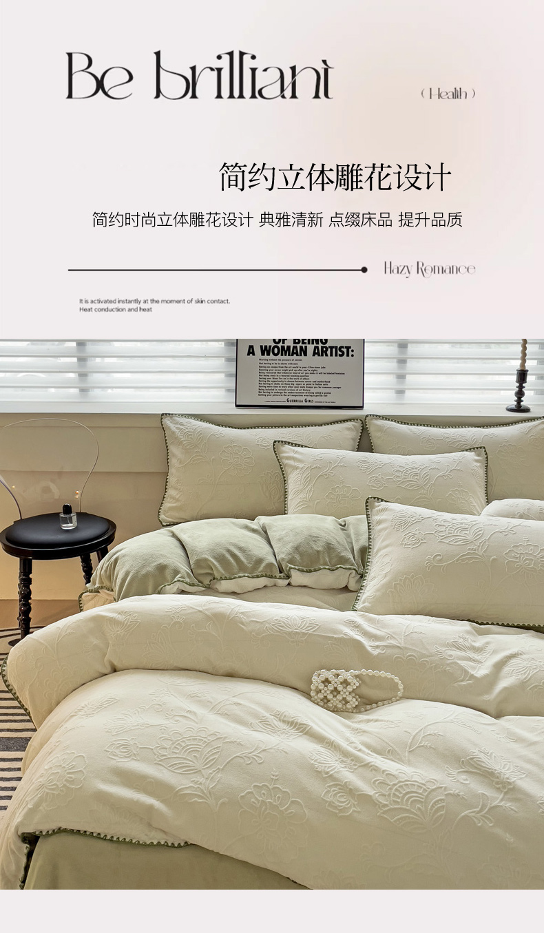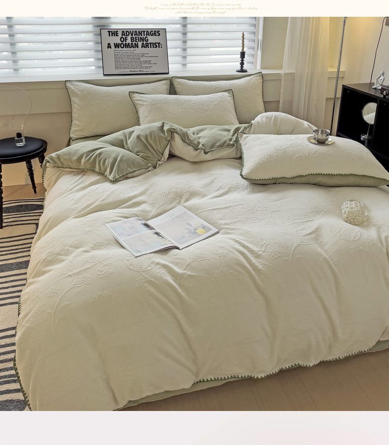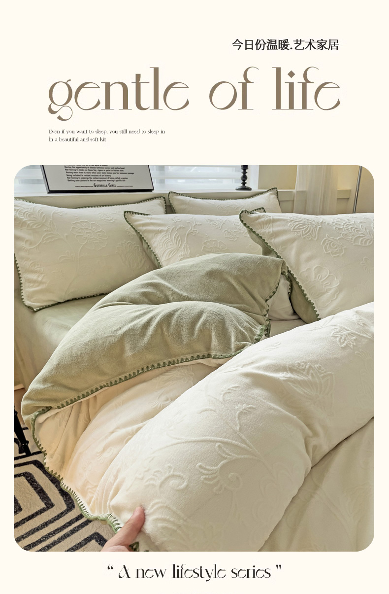 商品名称:慕澄 2023新款高克重贝壳边雕花绒四件套 雕花绒-白+绿