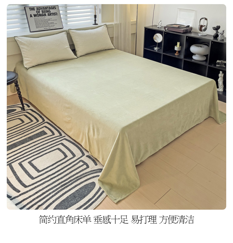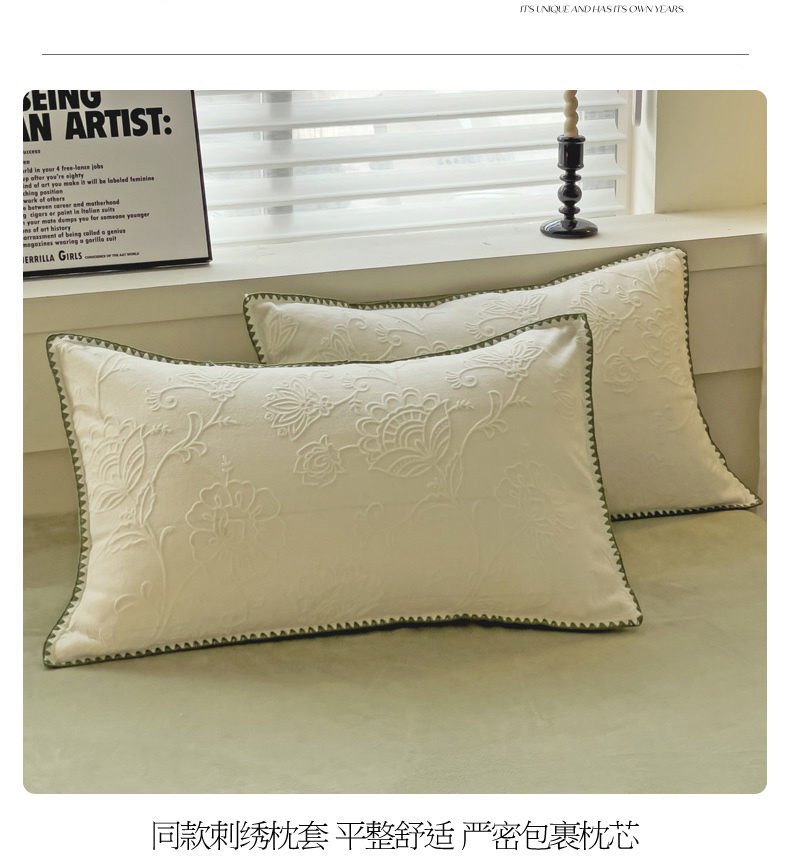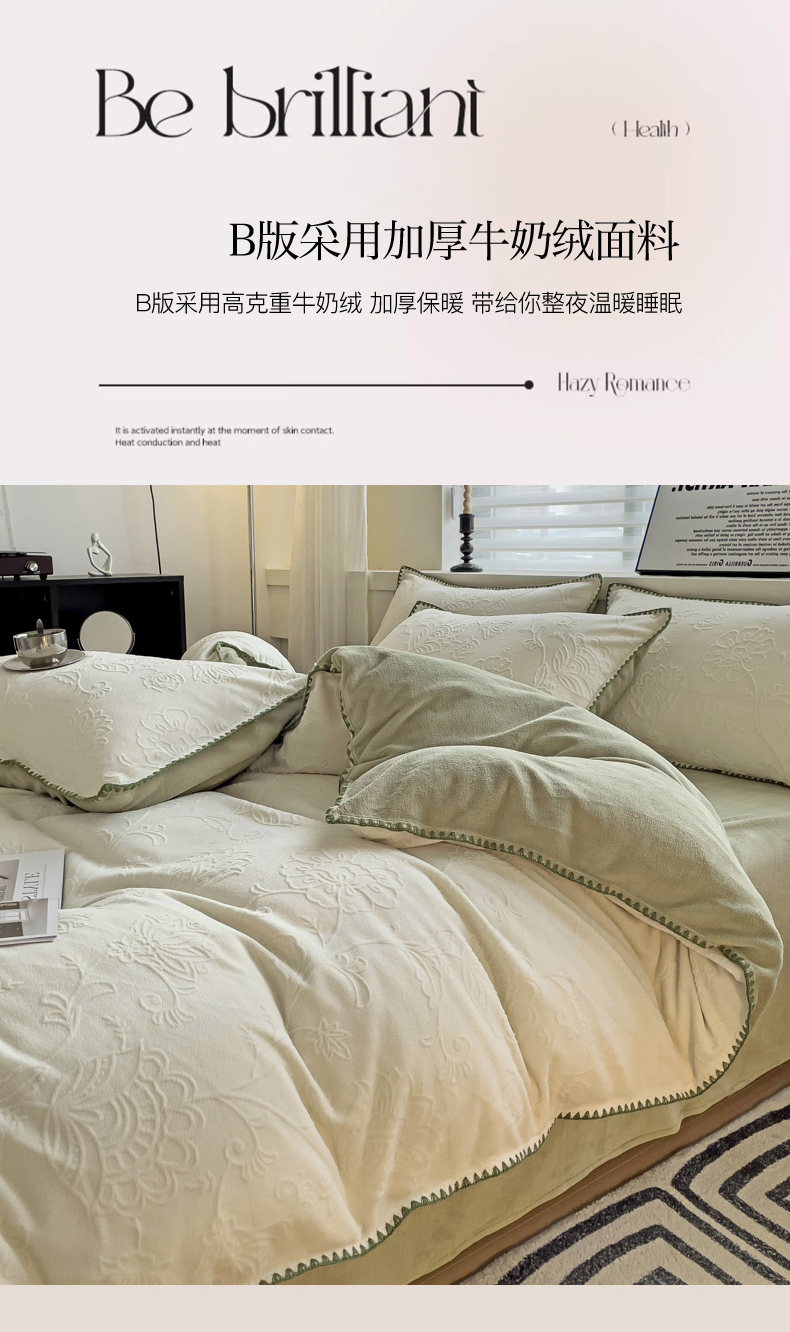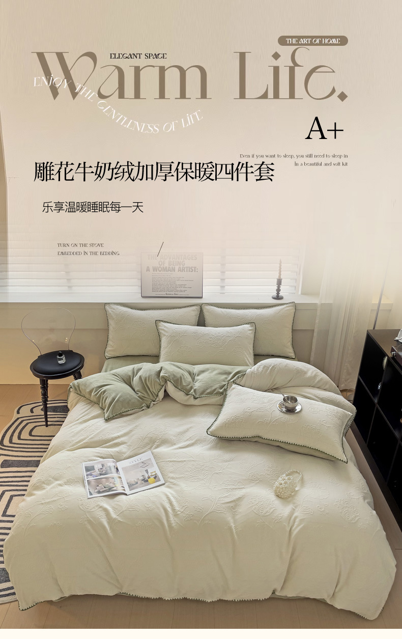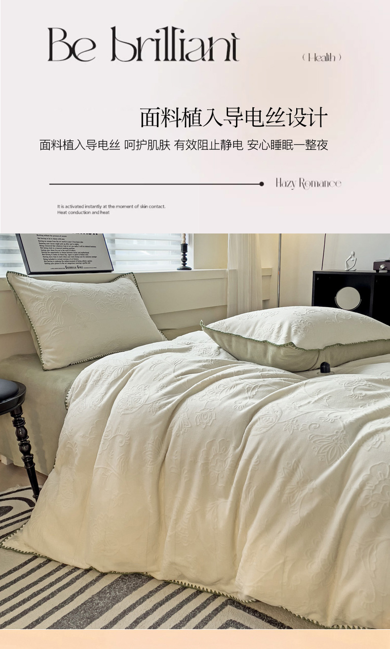 商品名称:慕澄 2023新款高克重贝壳边雕花绒四件套 雕花绒-白+绿