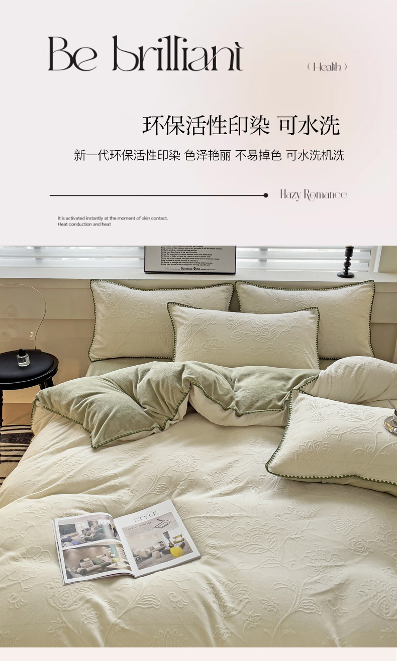 慕澄 2023新款高克重贝壳边雕花绒四件套 雕花绒-白+绿