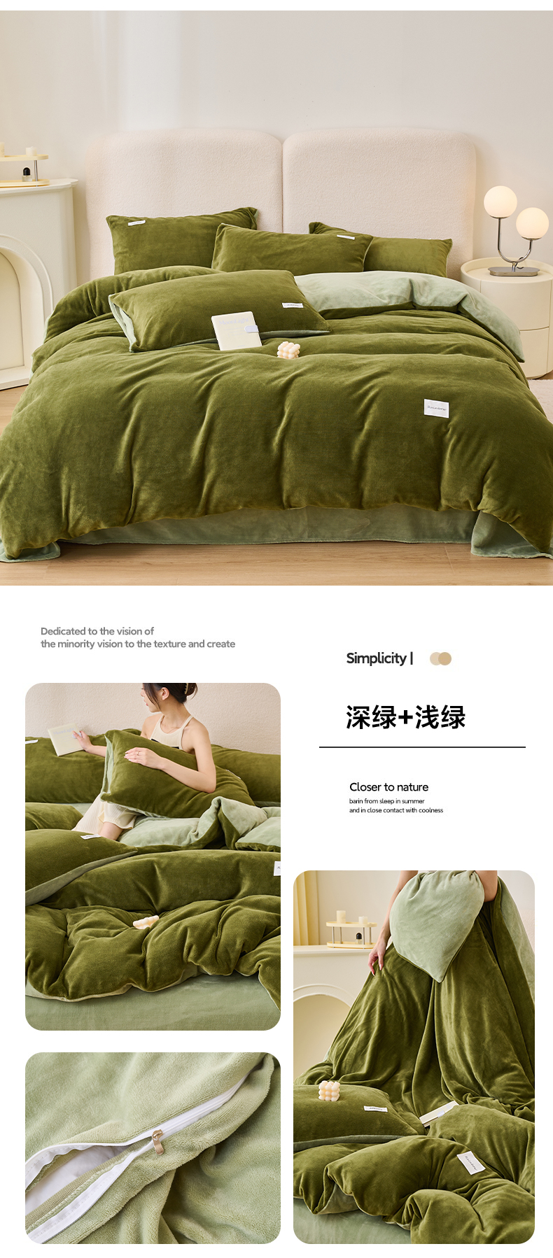 • 91家纺网 家纺一手货源 找家纺 晨曦 2023新款ins简约风牛奶绒双拼四件套可拆洗冬被 深绿+浅绿