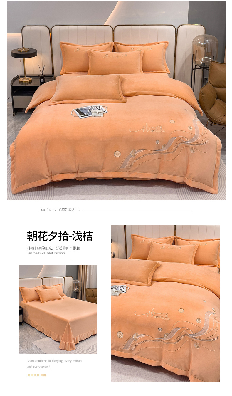 商品名称:慕克斯 2023直播新款高克重纯色刺绣牛奶绒四件套 朝花夕拾-浅桔