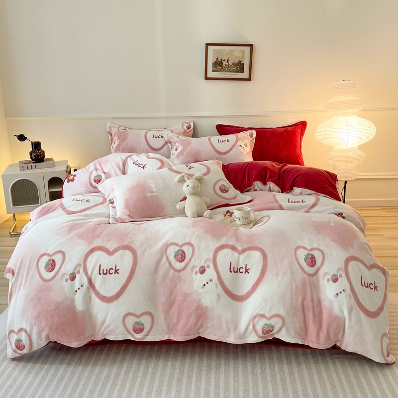 橘滋 2023新款240克牛奶绒臻棉绒嵌条工艺四件套 草莓小兔