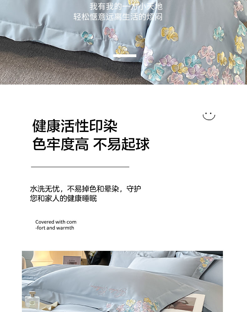 丞音家纺 A类100全棉刺绣长绒棉花卉绣花纯棉四件套 蝶恋花-暮光蓝