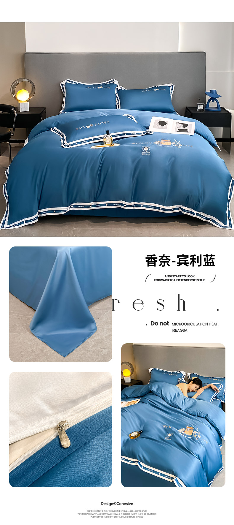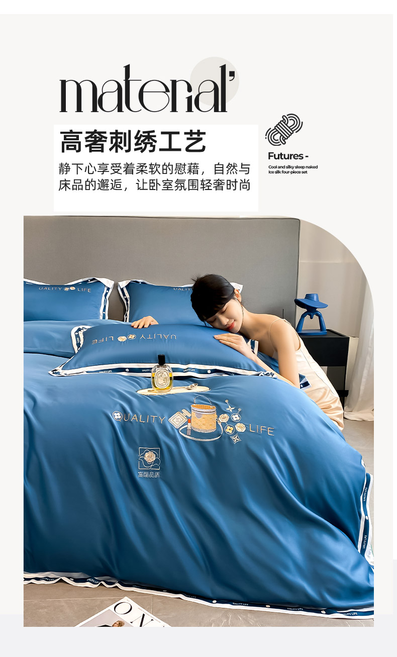 欧冠家纺 2024新款大牌风60S水洗真丝刺绣床笠被套四件套香奈系列 香奈-宾利蓝