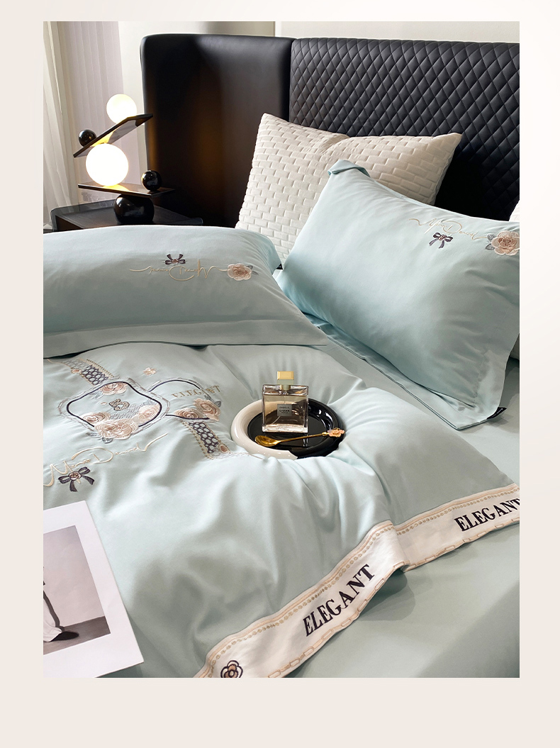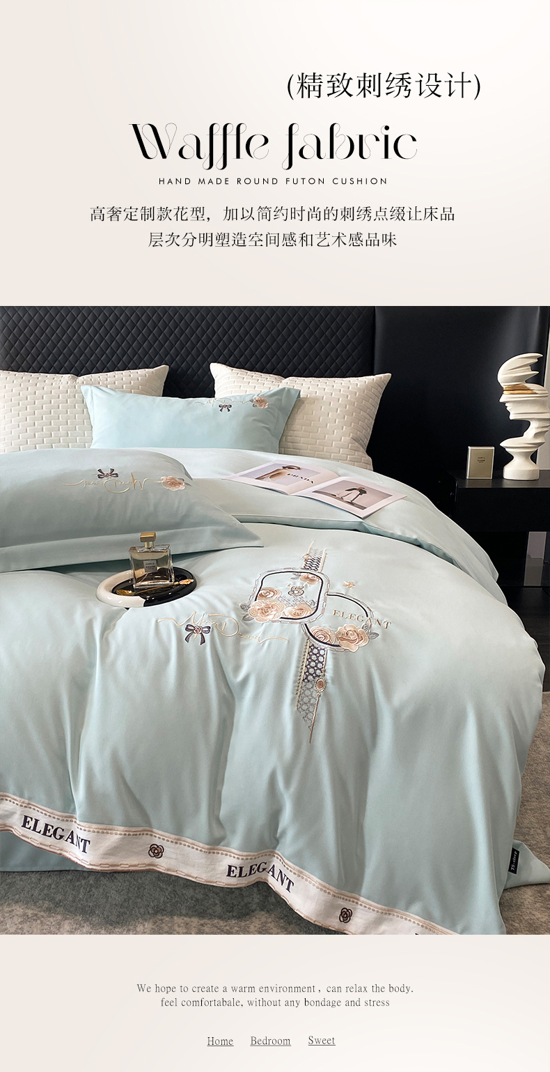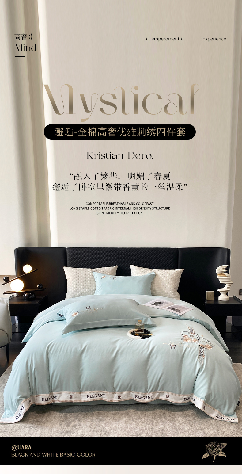商品名称:棠颂 2025春夏全棉高奢优雅刺绣四件套--熙里(礼盒包装) 熙里-蒂芙尼蓝