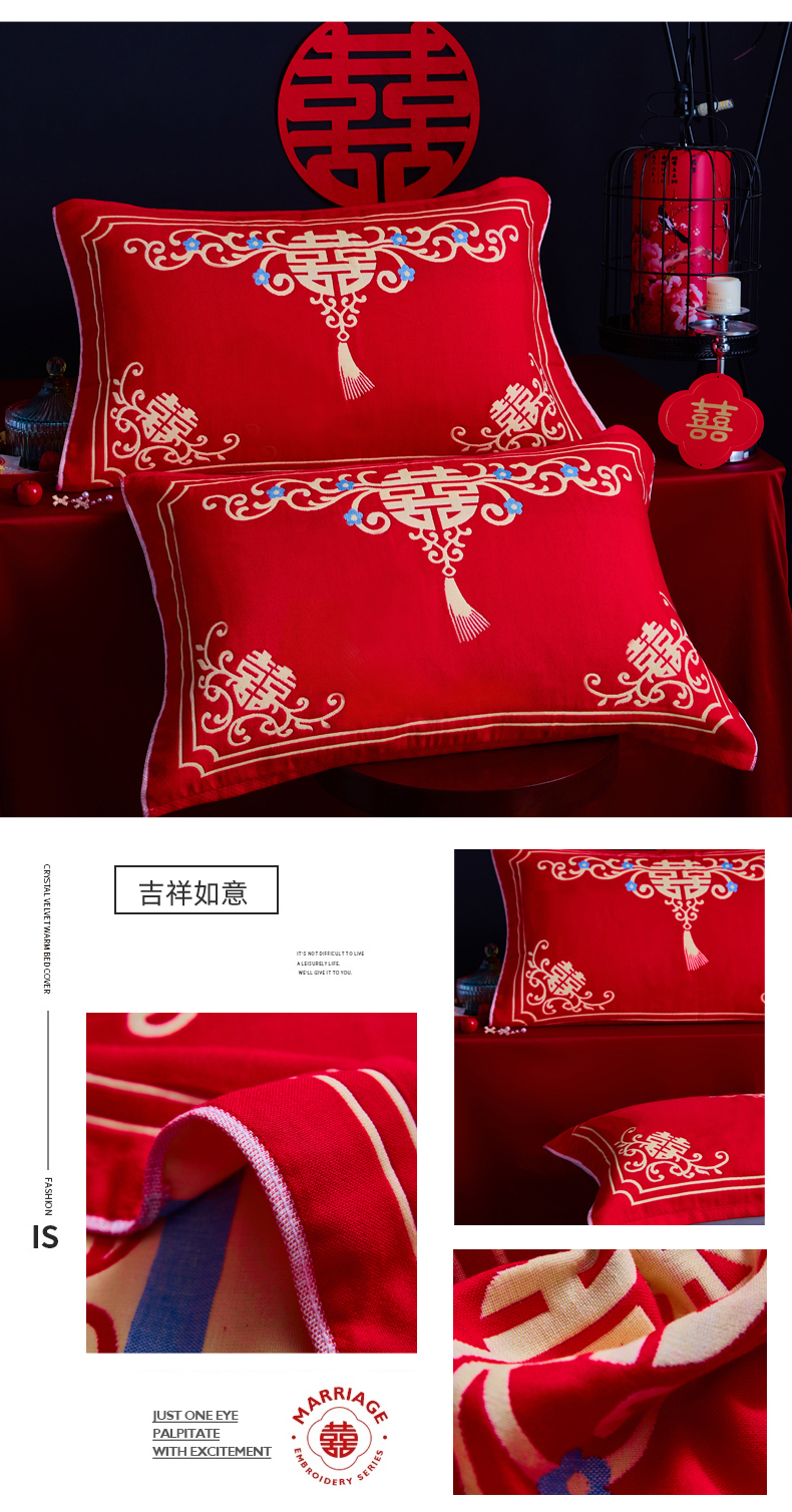 (总)美宜家 2025新款四层全棉纱布婚庆枕巾枕套枕头,百年好合,吉祥如意,喜上眉梢,喜气洋洋,喜结良缘,喜结连理,心心相印,欢欢喜喜,浪漫爱情,双喜临门,真爱永恒,花好月圆