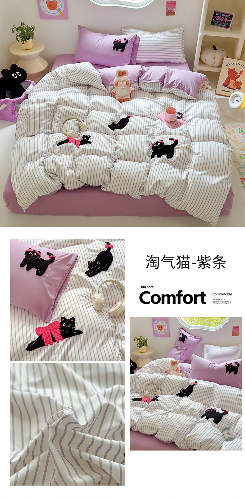 当前位置: 91家纺网 > 商品网购 > 床品套件 > 四件套 > 水洗棉四件套 > 易辰美 2024新款条纹水洗棉毛巾绣四件套(专版) 淘气猫-紫条