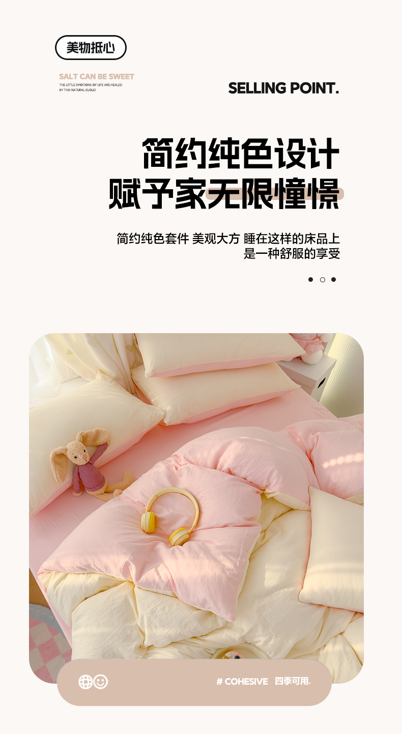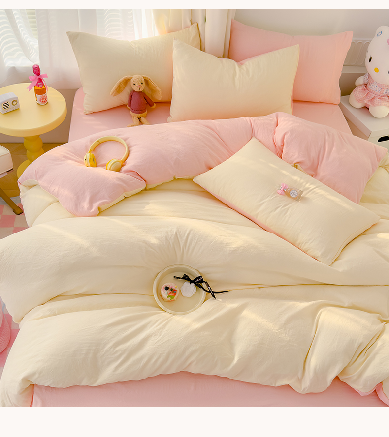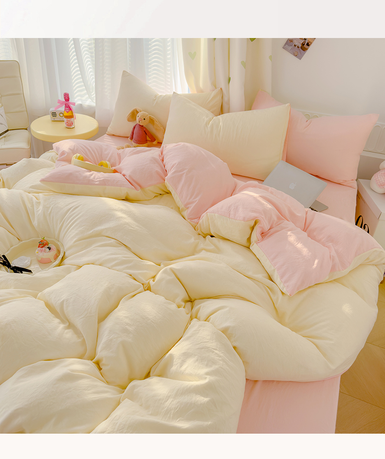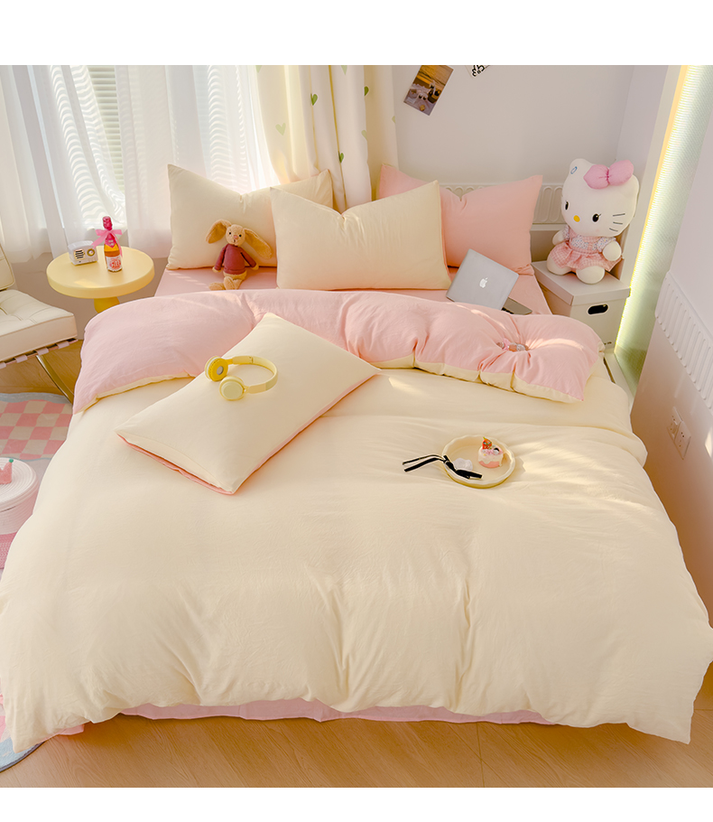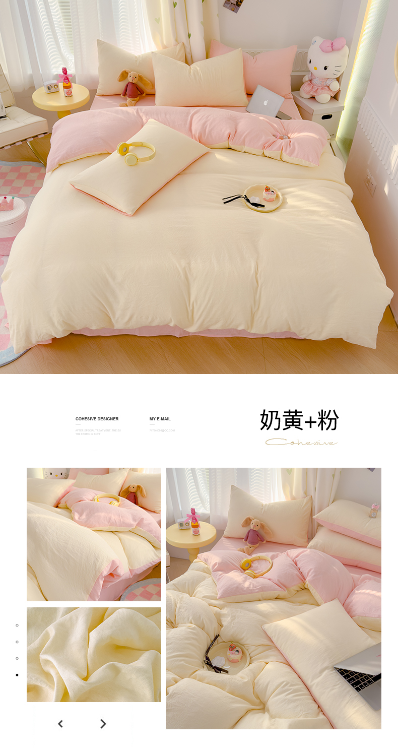 当前位置: 91家纺网 > 商品网购 > 床品套件 > 四件套 > 水洗棉四件套 > 颜选 2024新款简约纯色水洗棉双拼四件套 奶黄+粉