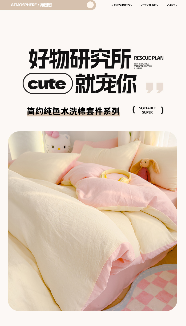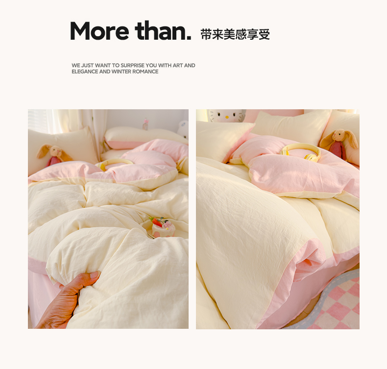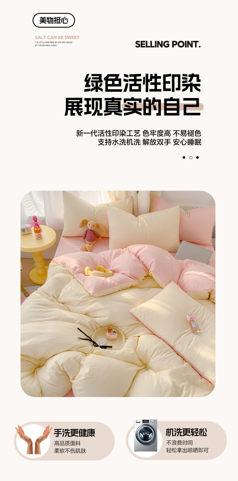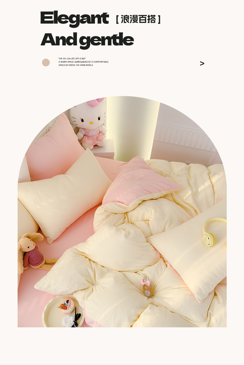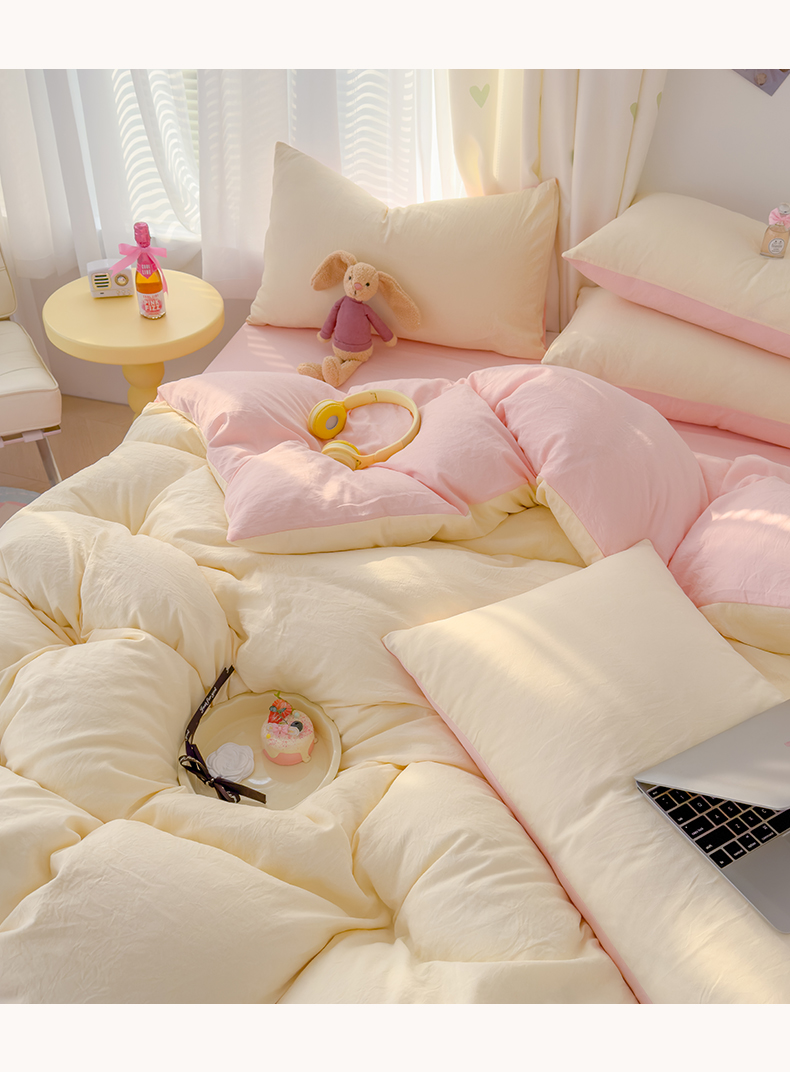 当前位置: 91家纺网 > 商品网购 > 床品套件 > 四件套 > 水洗棉四件套 > 颜选 2024新款简约纯色水洗棉双拼四件套 奶黄+粉
