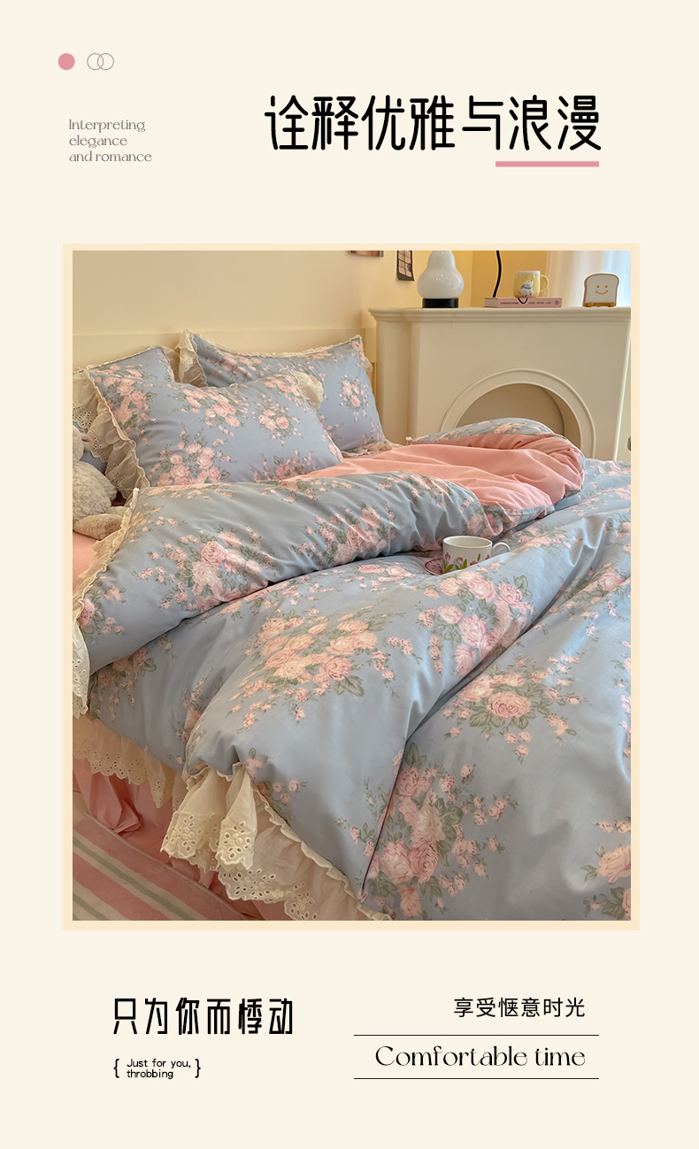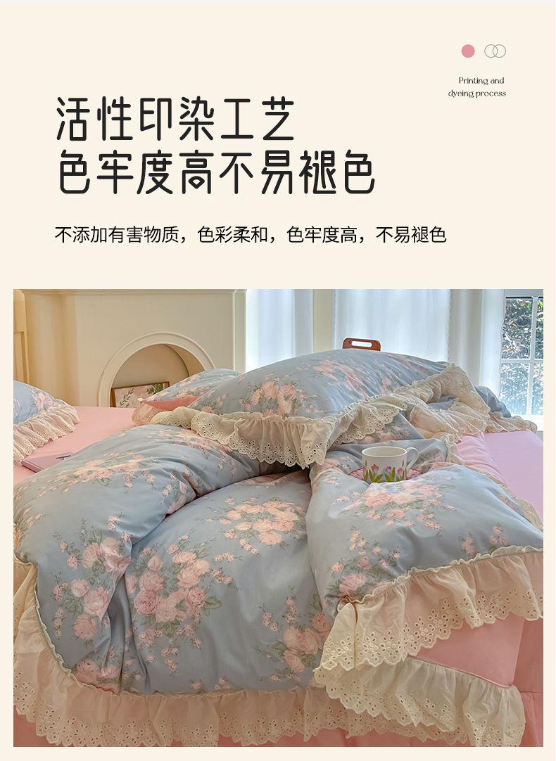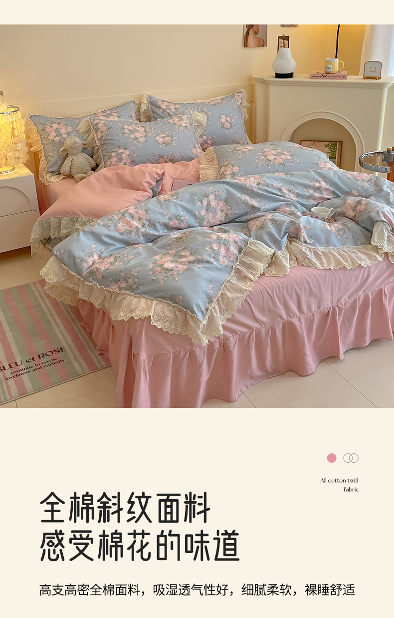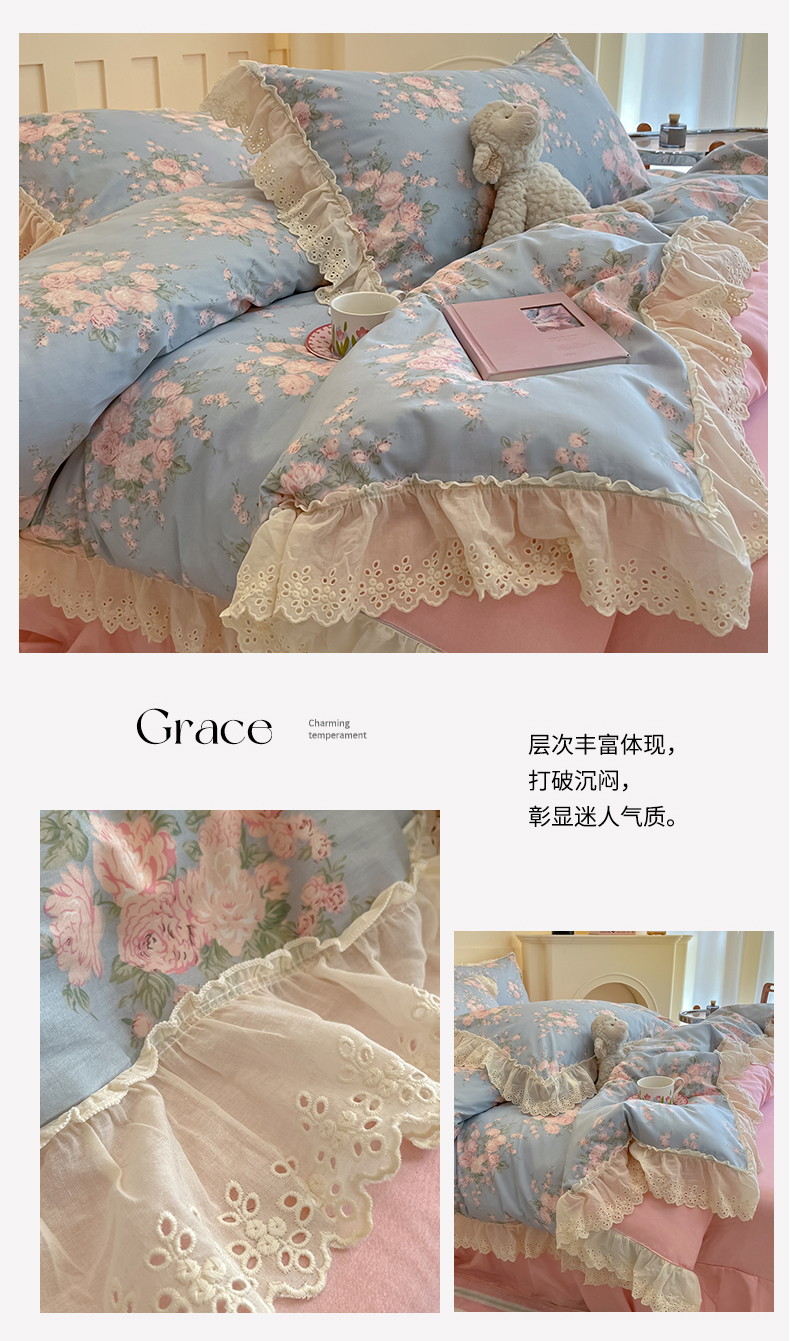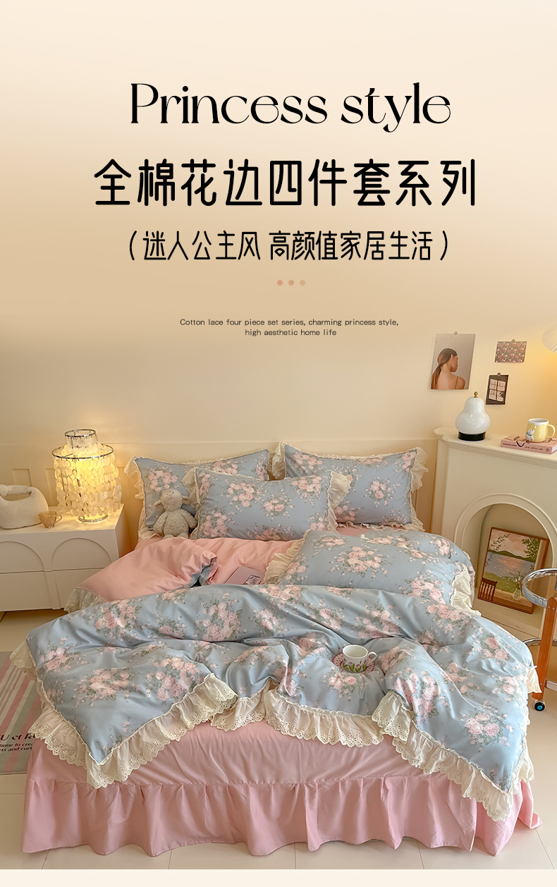 金丝鸟家纺 2024新款韩式全棉镂空大花边公主风花卉系列四件套 花涧梦 蓝