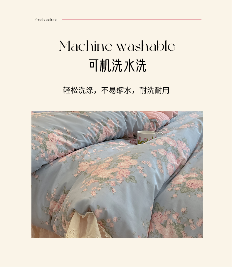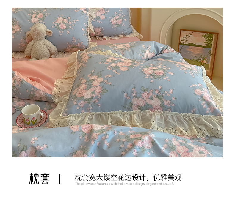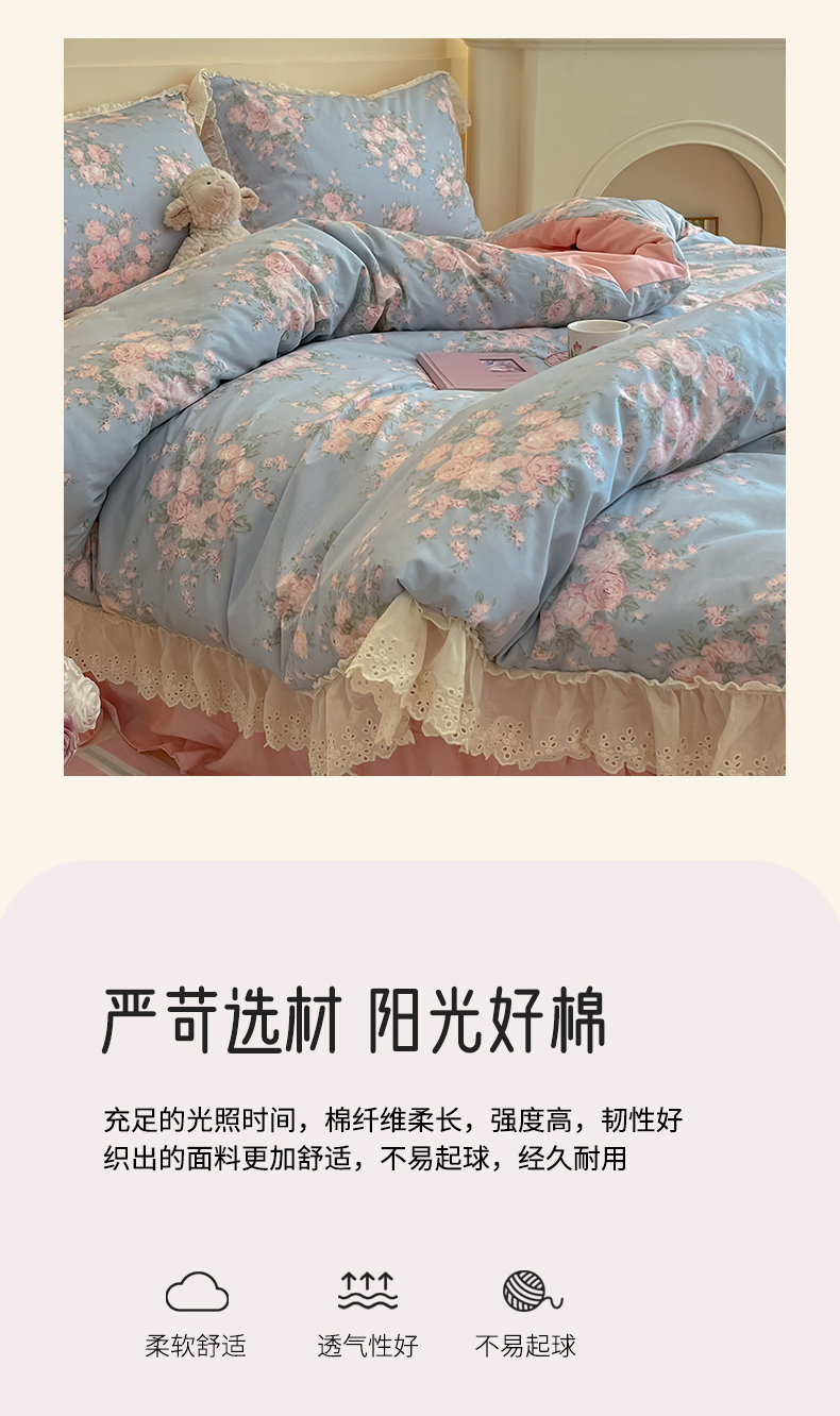 商品名称:金丝鸟家纺 2024新款韩式全棉镂空大花边公主风花卉系列四件套 花涧梦 蓝