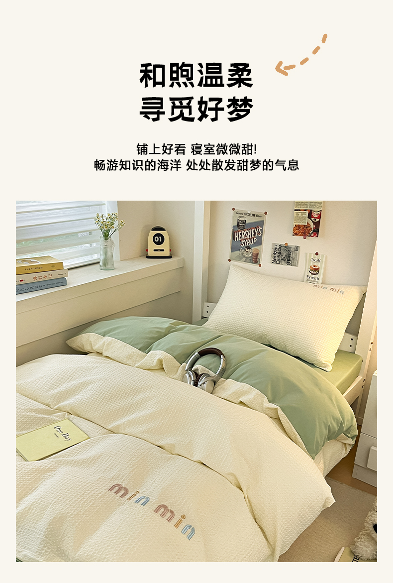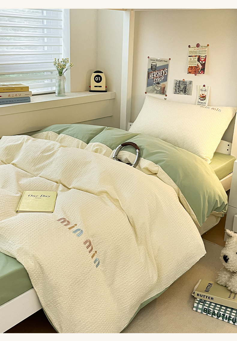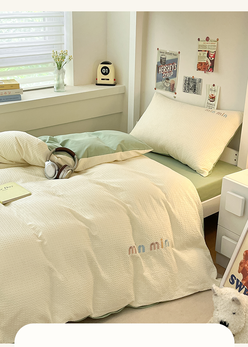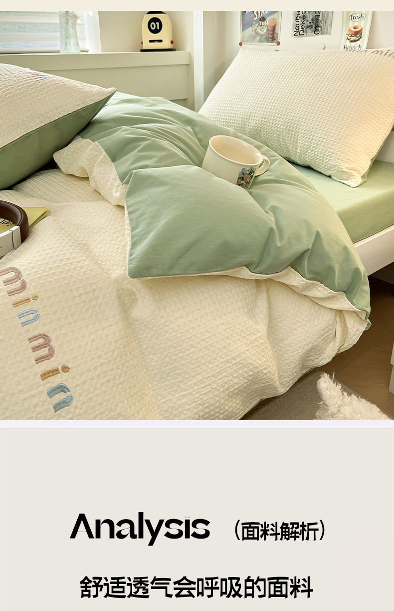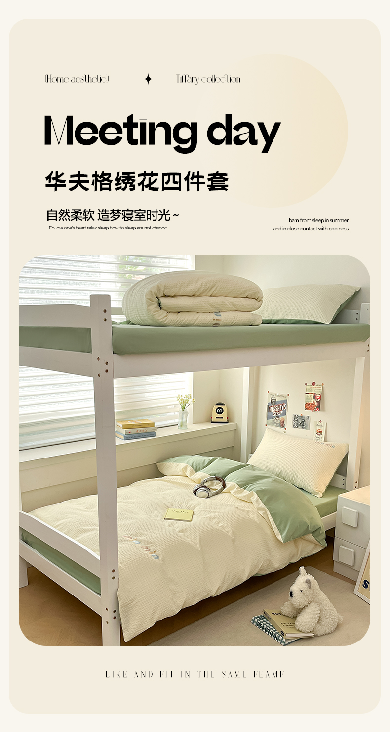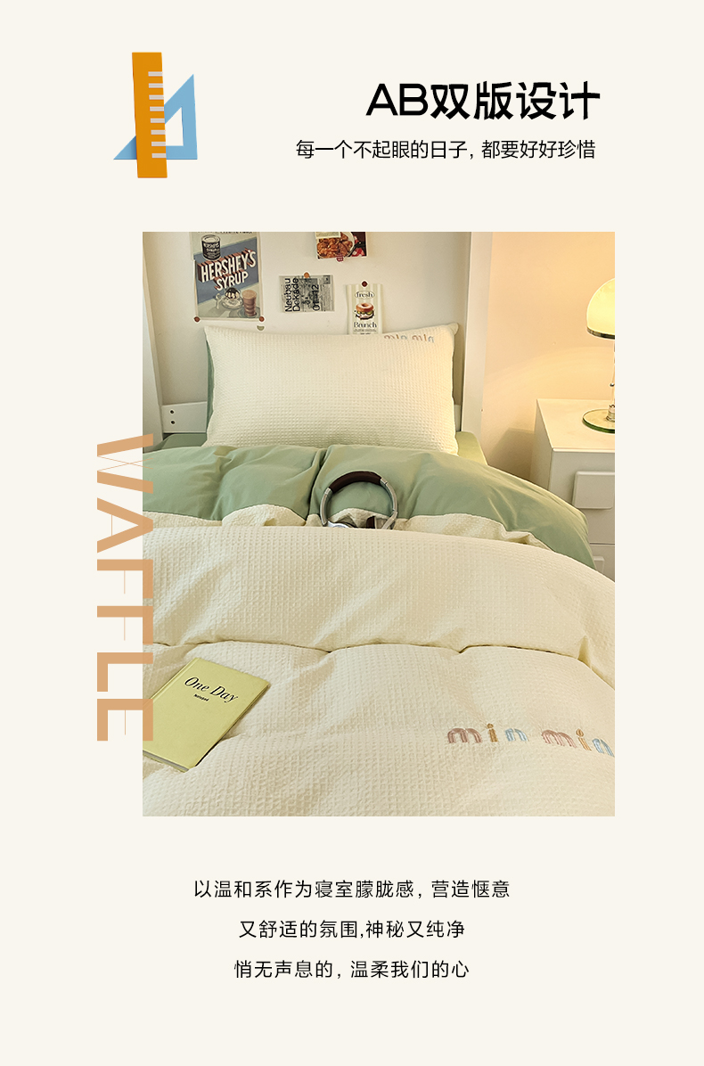 当前位置: 91家纺网 > 商品网购 > 床品套件 > 四件套 > 全棉普通四件套 > 雅居纺家纺 2024新款开学季全棉A类华夫格绣花四件套-Min Min-米黄+水绿