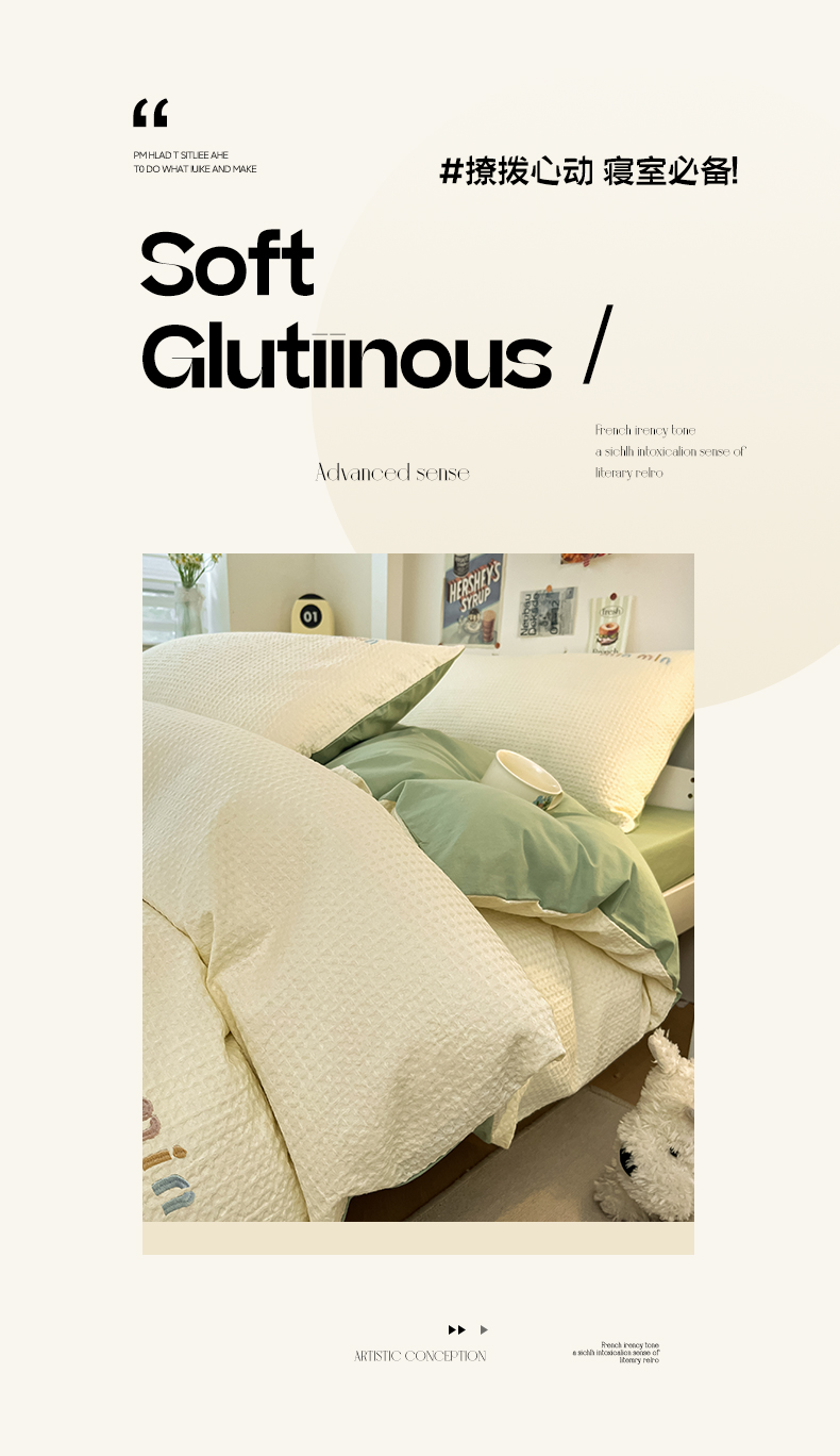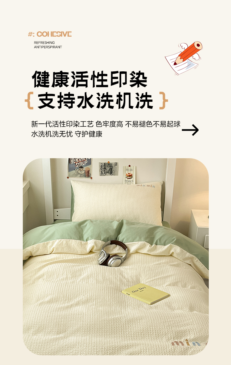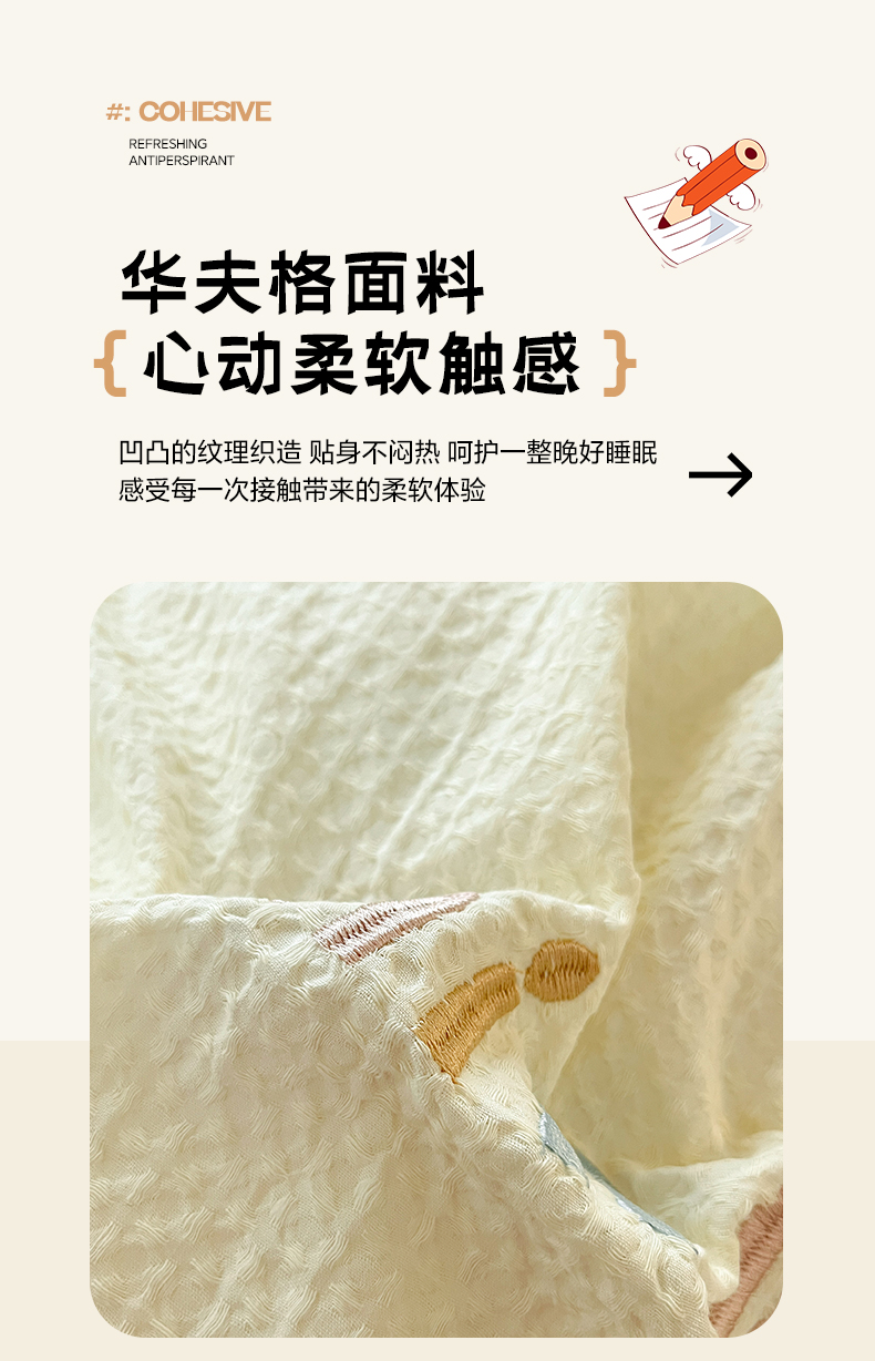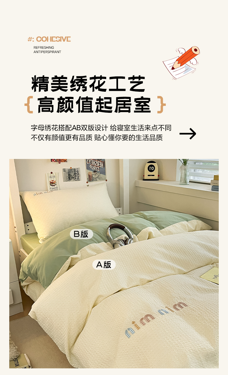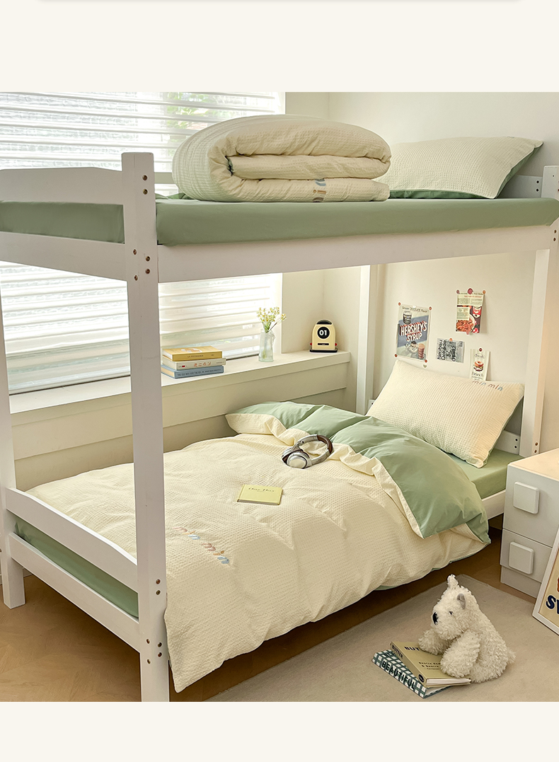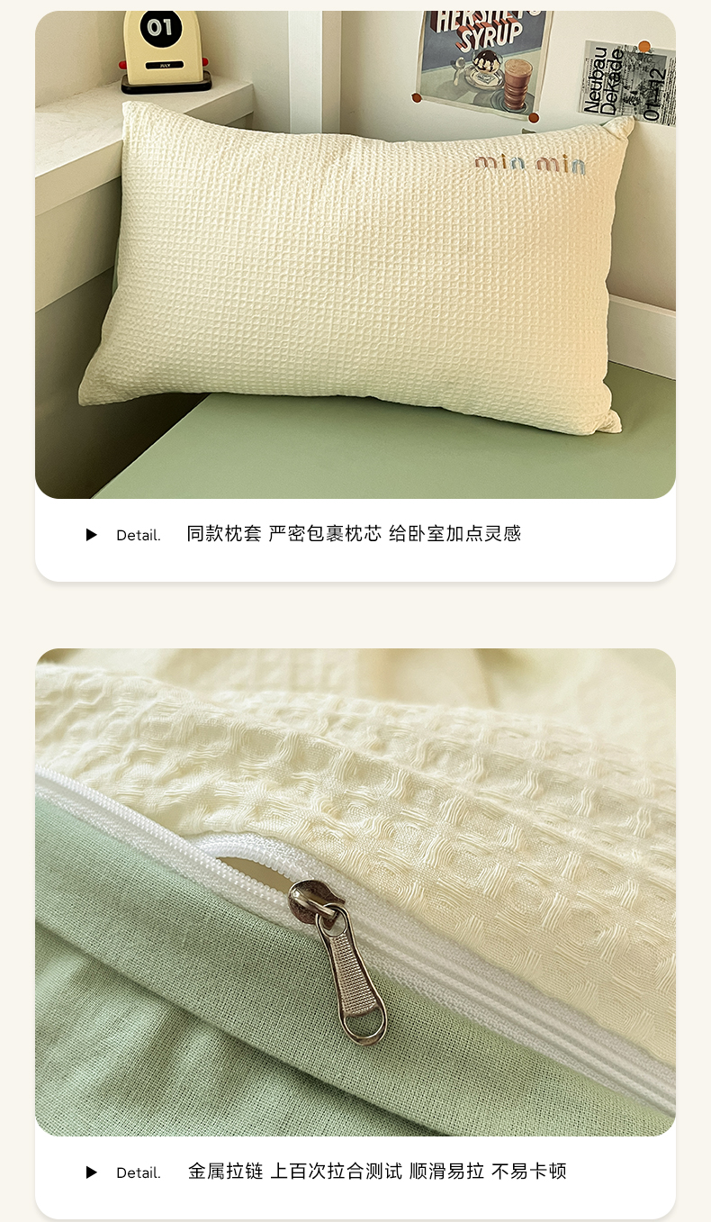 当前位置: 91家纺网 > 商品网购 > 床品套件 > 四件套 > 全棉普通四件套 > 雅居纺家纺 2024新款开学季全棉A类华夫格绣花四件套-Min Min-米黄+水绿