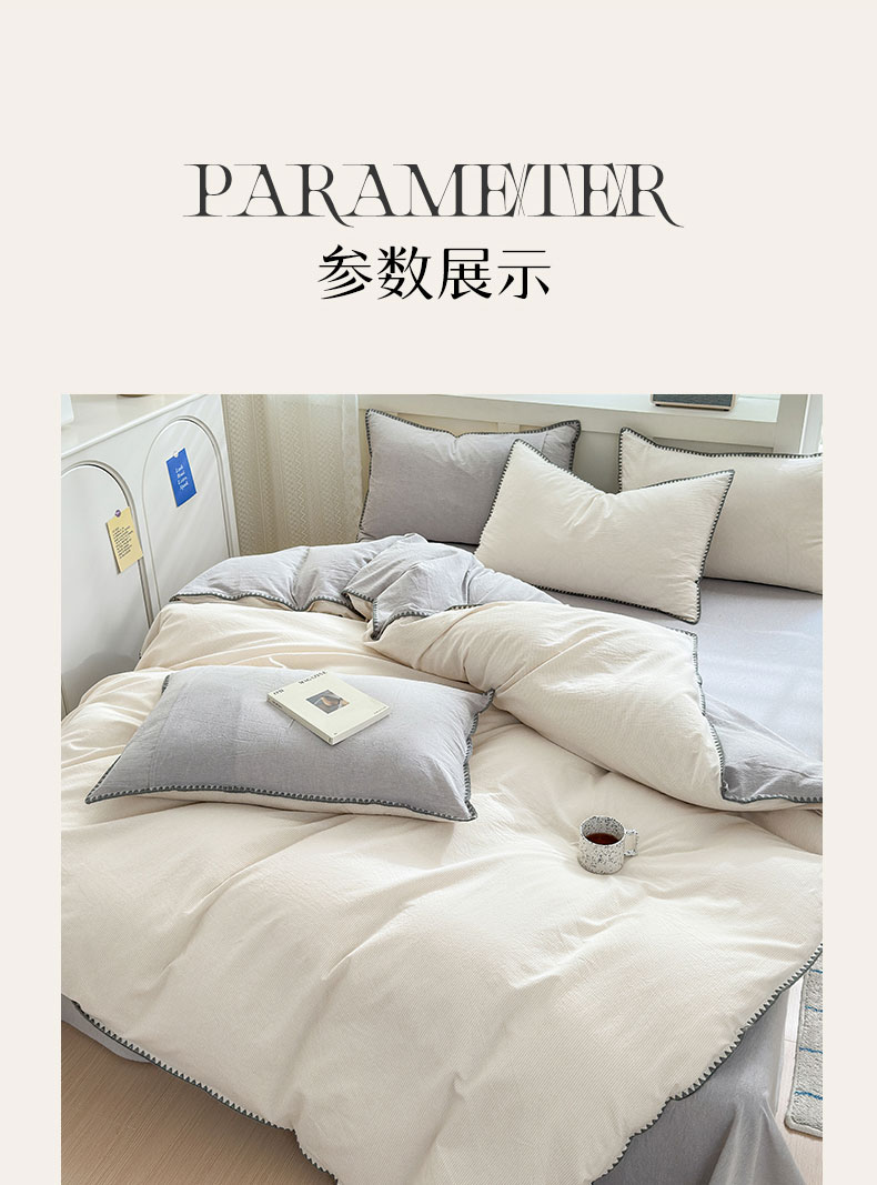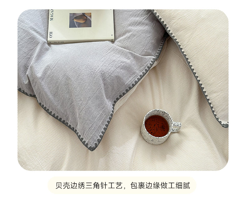当前位置: 91家纺网 > 商品网购 > 床品套件 > 四件套 > 全棉普通四件套 > 宜家坊 2024新款A类全棉色织水洗棉贝壳边绣三角针工艺四件套可定制 时光-米灰
