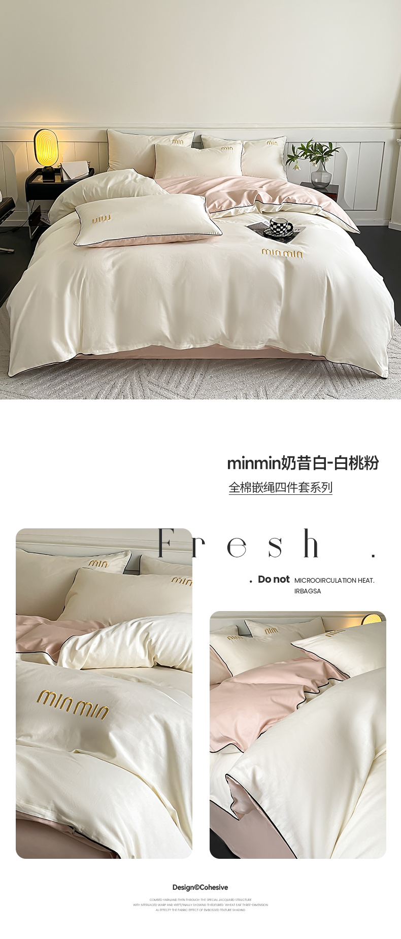 当前位置: 91家纺网 > 商品网购 > 床品套件 > 四件套 > 全棉活性四件套 > 澳梵家居 2024新款全棉嵌绳四件套--minmin系列 minmin奶昔白-白桃粉