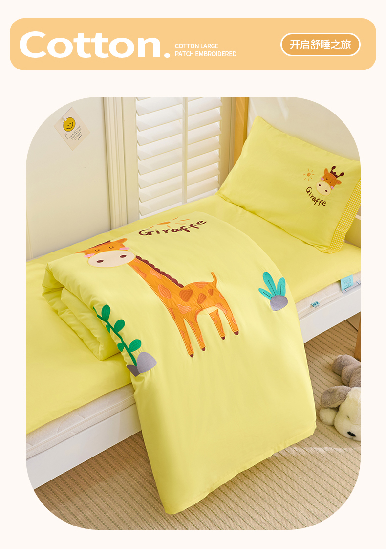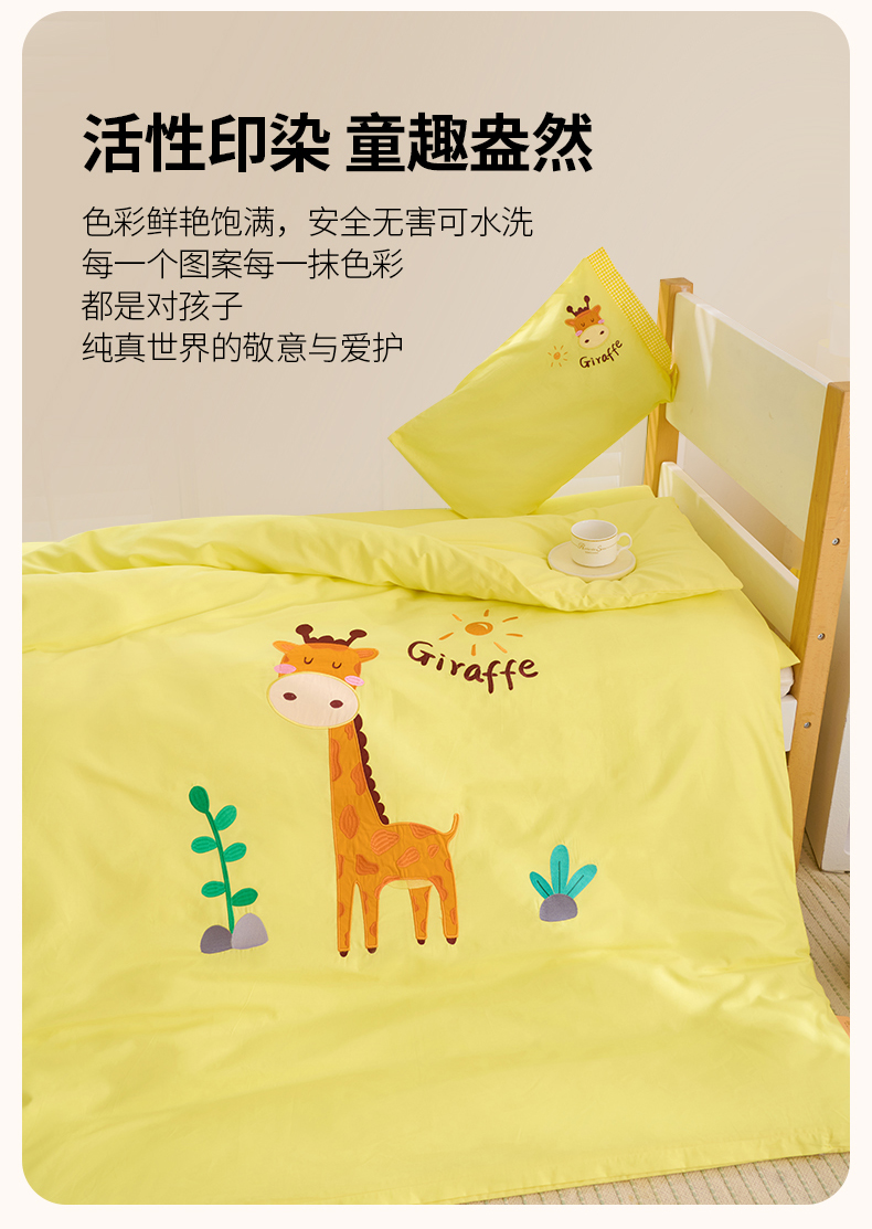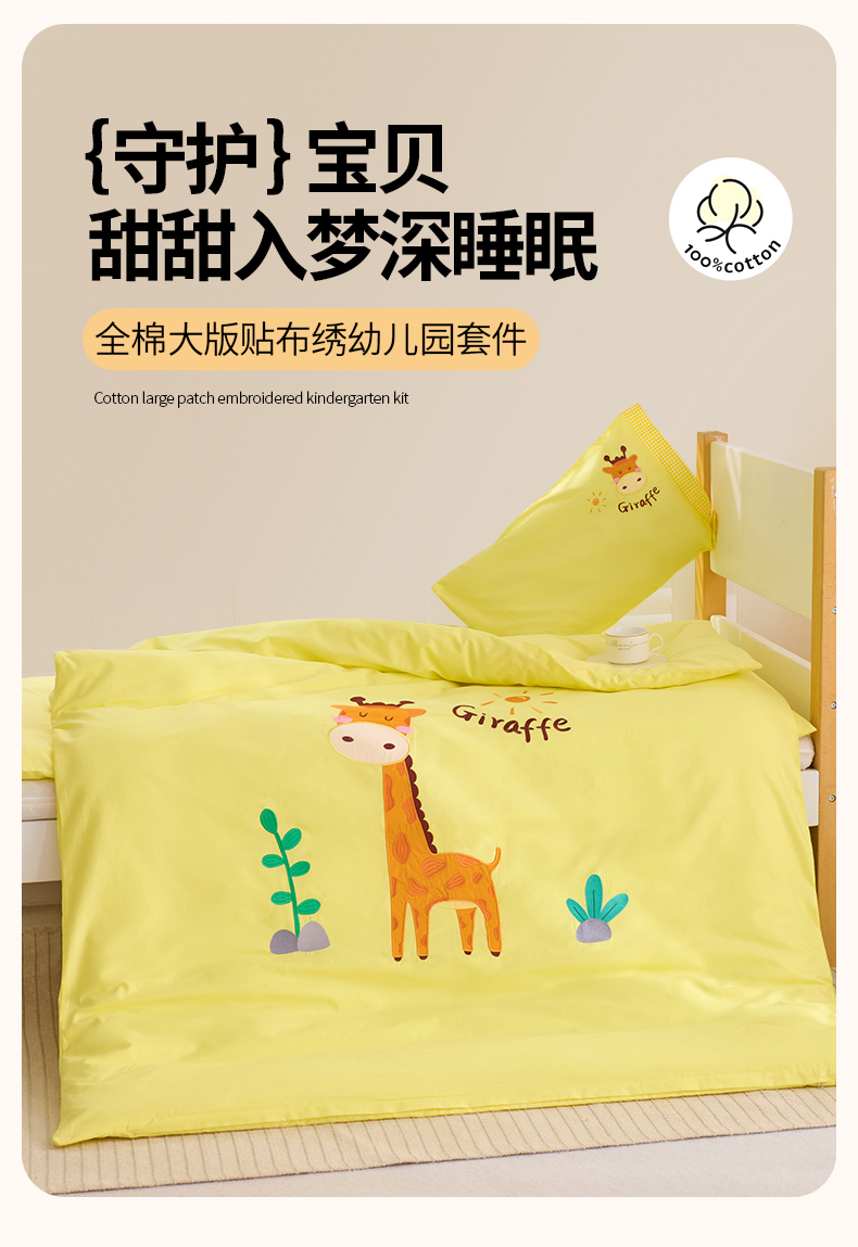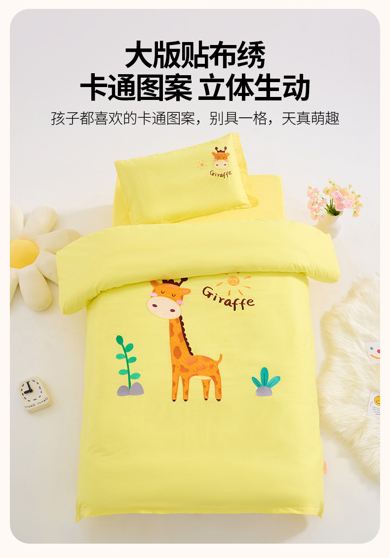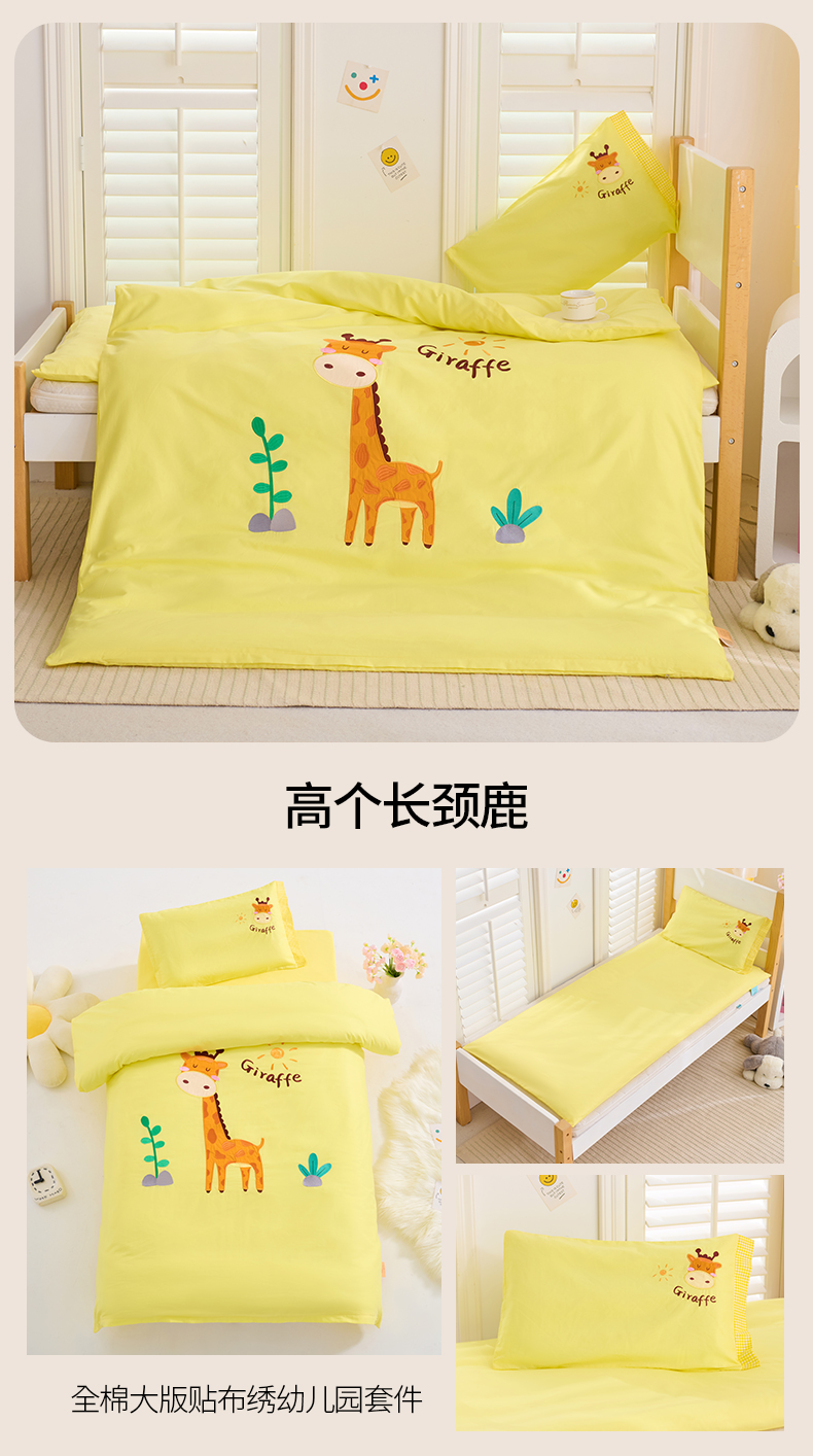 当前位置: 91家纺网 > 商品网购 > 床品套件 > 三件套 > 嗨皮宝贝 2024款卡通全棉幼儿园刺绣 儿童套件 刺绣幼儿园三件套 高个长颈鹿