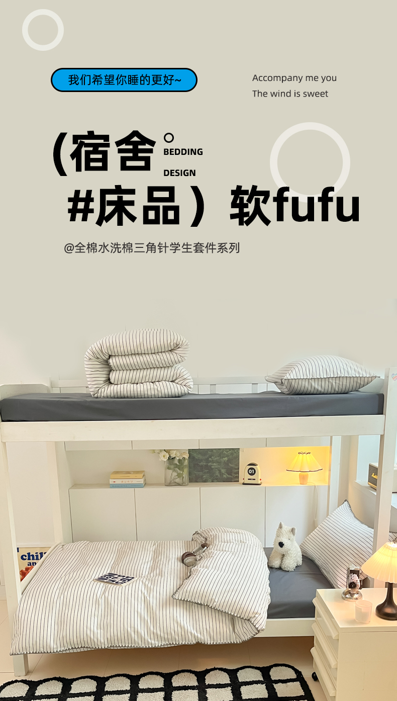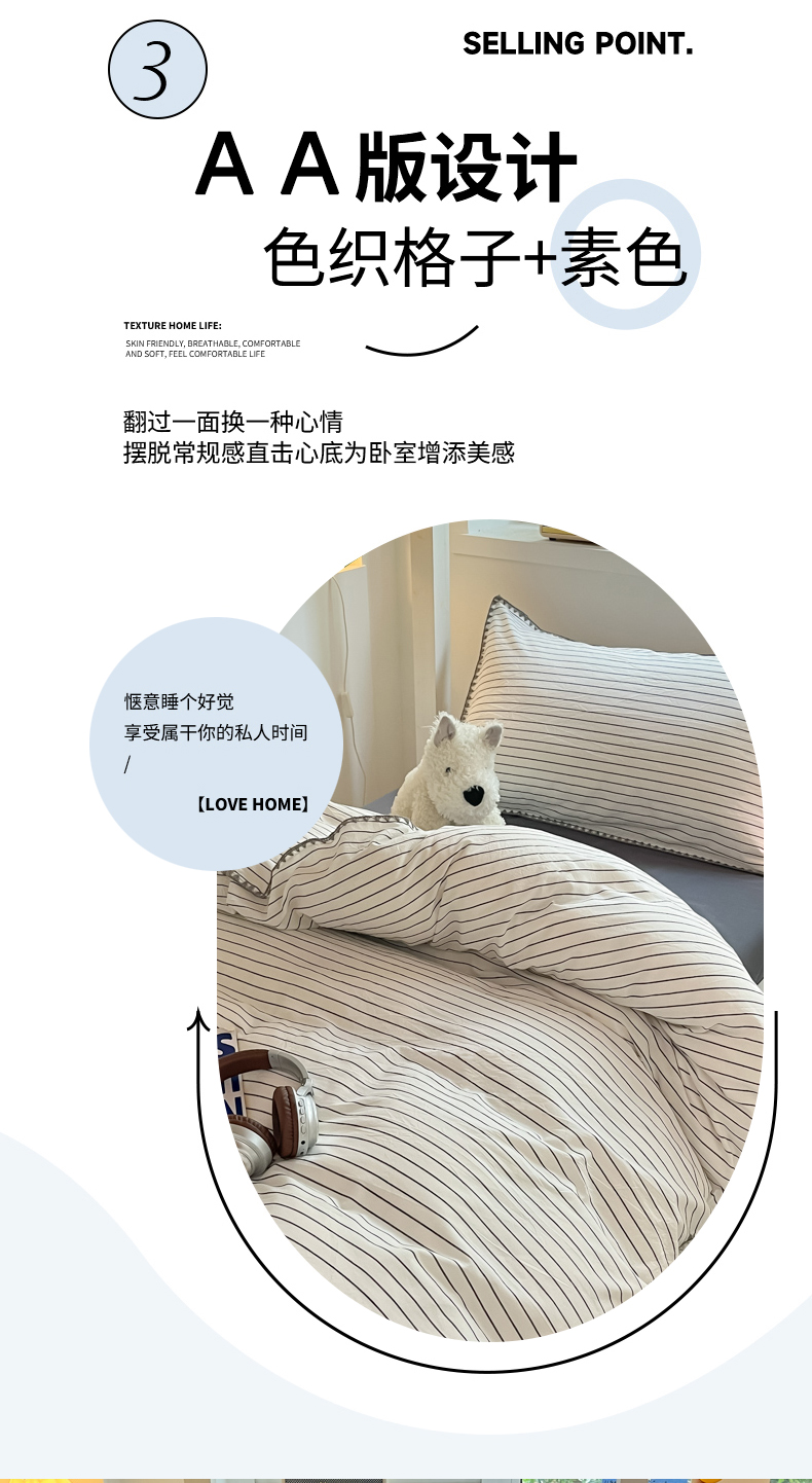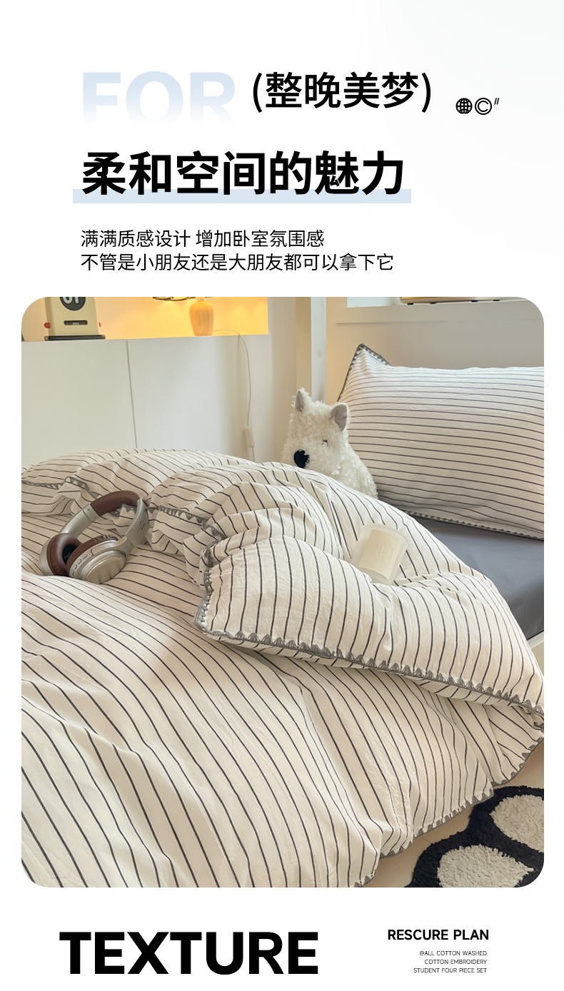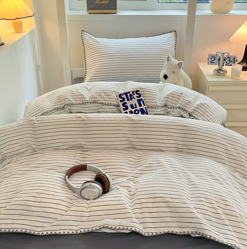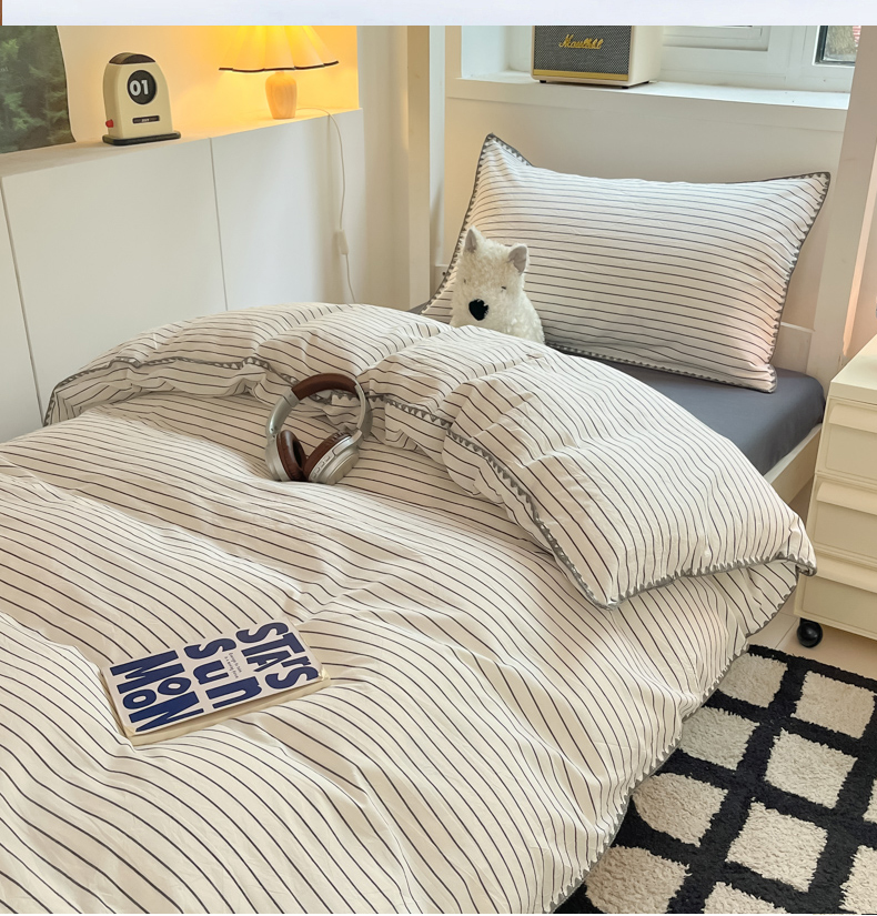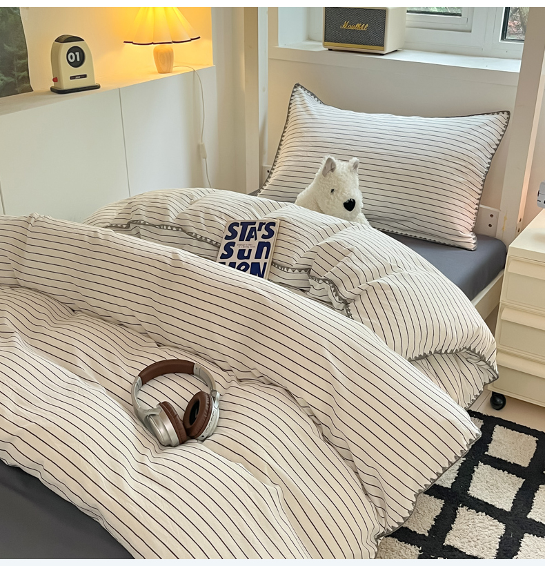 吉象家纺 2025新款全棉水洗棉三角针学生三件套四件套 时光-横条