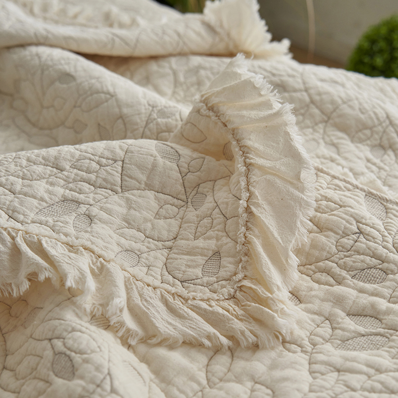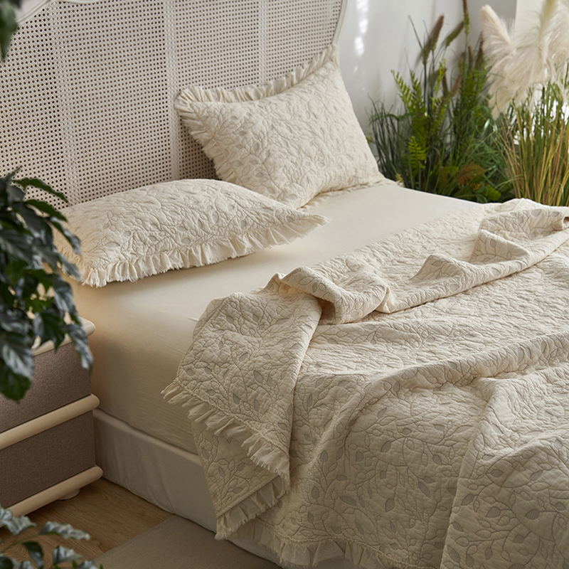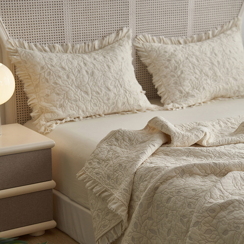 安莱生活 2024新品百分百全棉密道绗缝成品酵素洗多功能床盖三件套 叶语