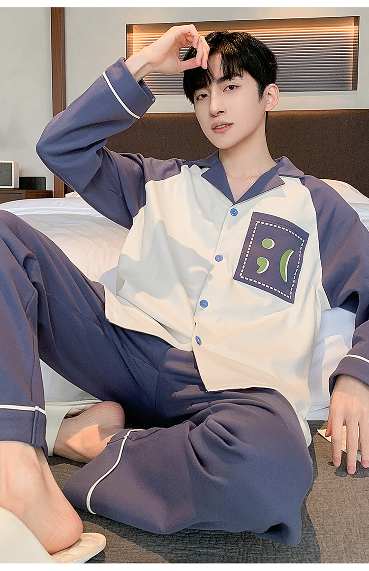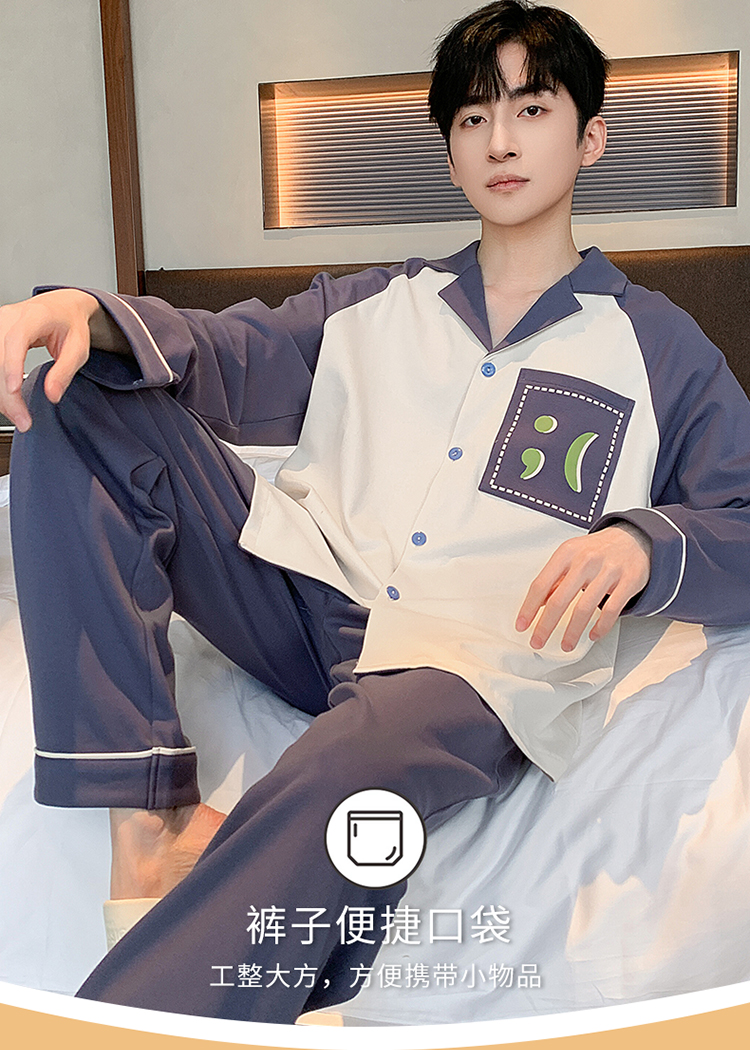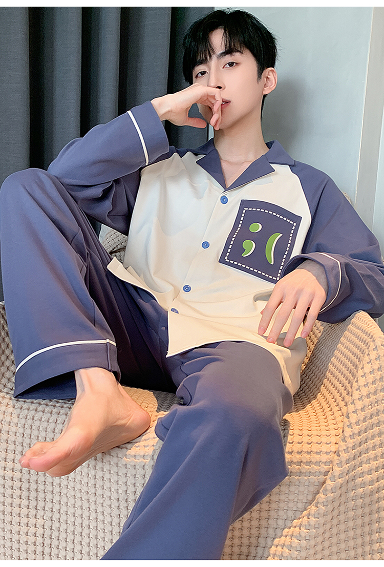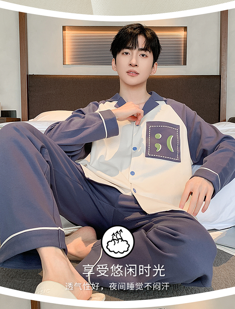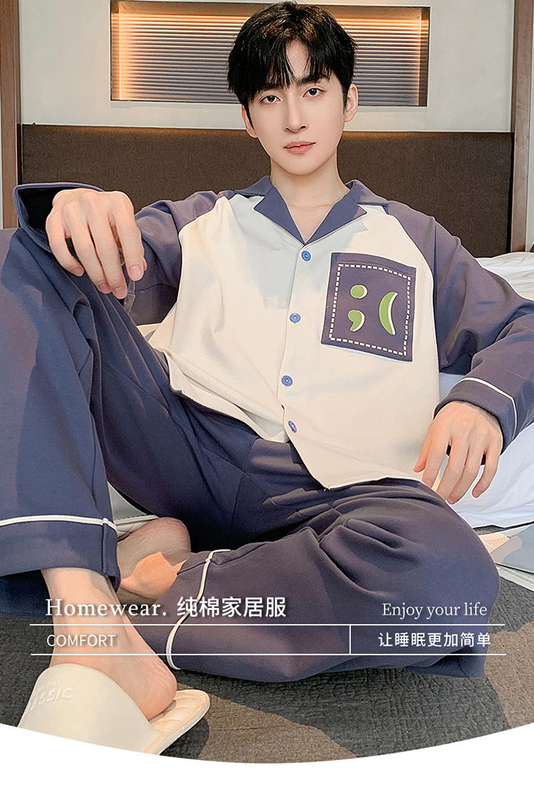 春秋季新款纯棉休闲简约睡衣高级质量家居服夏季男士宽松舒适睡衣翻领 89326